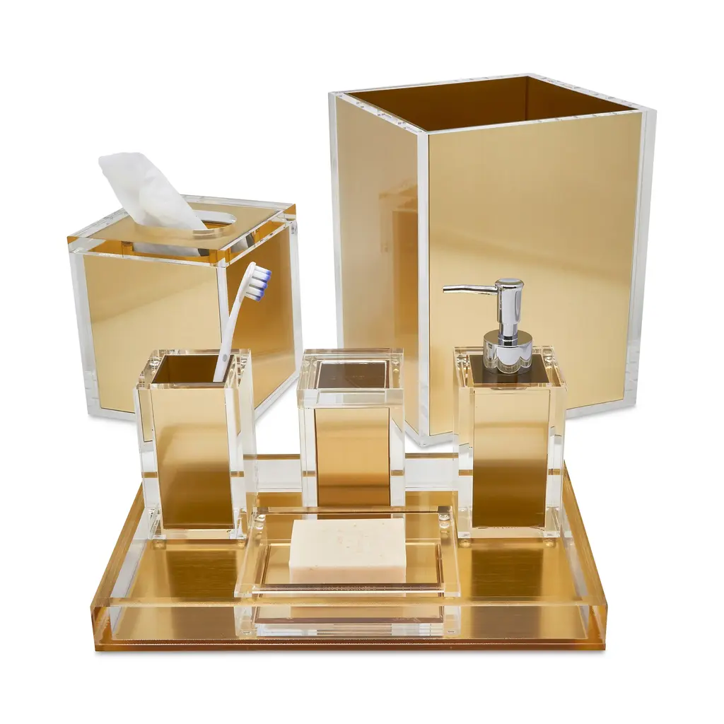 Shimmering in a golden glow, this collection of bath accessories from Tizo Design is crafted from gold-tinted lucite.