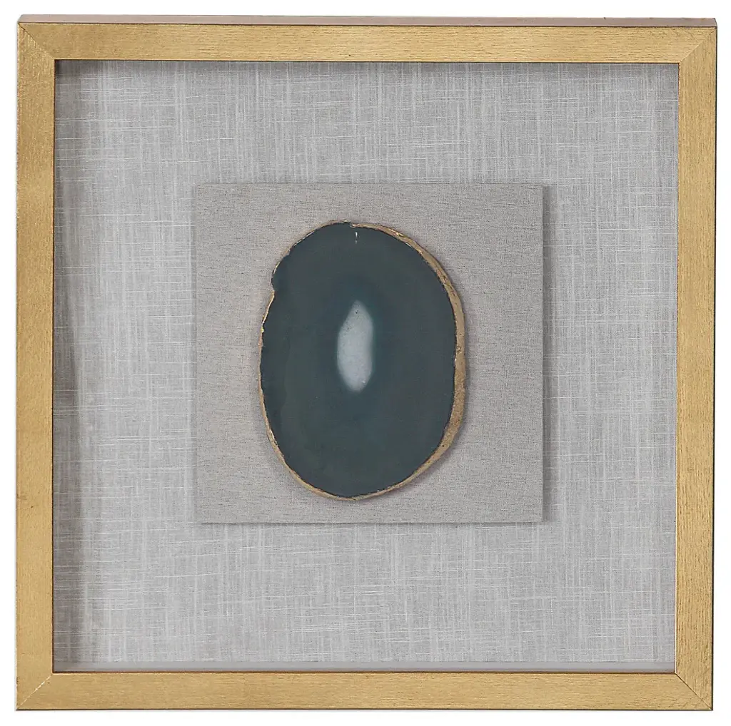 A Pine Wood Shadow Box Featuring A Hand Applied Gold Leaf Finish Showcases A Striking Emerald Green Agate Stone With White Veining, Accented With Hand Painted Gold Edging. Mounted On An Off-white Linen Backing.• 19.75" square x 2" deep. Weighs 8 lbs.; Glass Dimensions: 18.5" x 18.5"• Hand Finished Premium Pine Wood Frame with Natural Agate• Properly weighted hanging hardware attached.• Heirloom Quality - Expertly hand crafted and hand finished. Due to the hand crafted nature of this piece, each piece may have subtle differences.