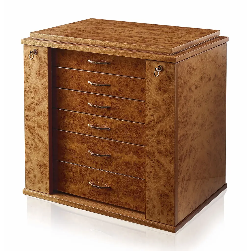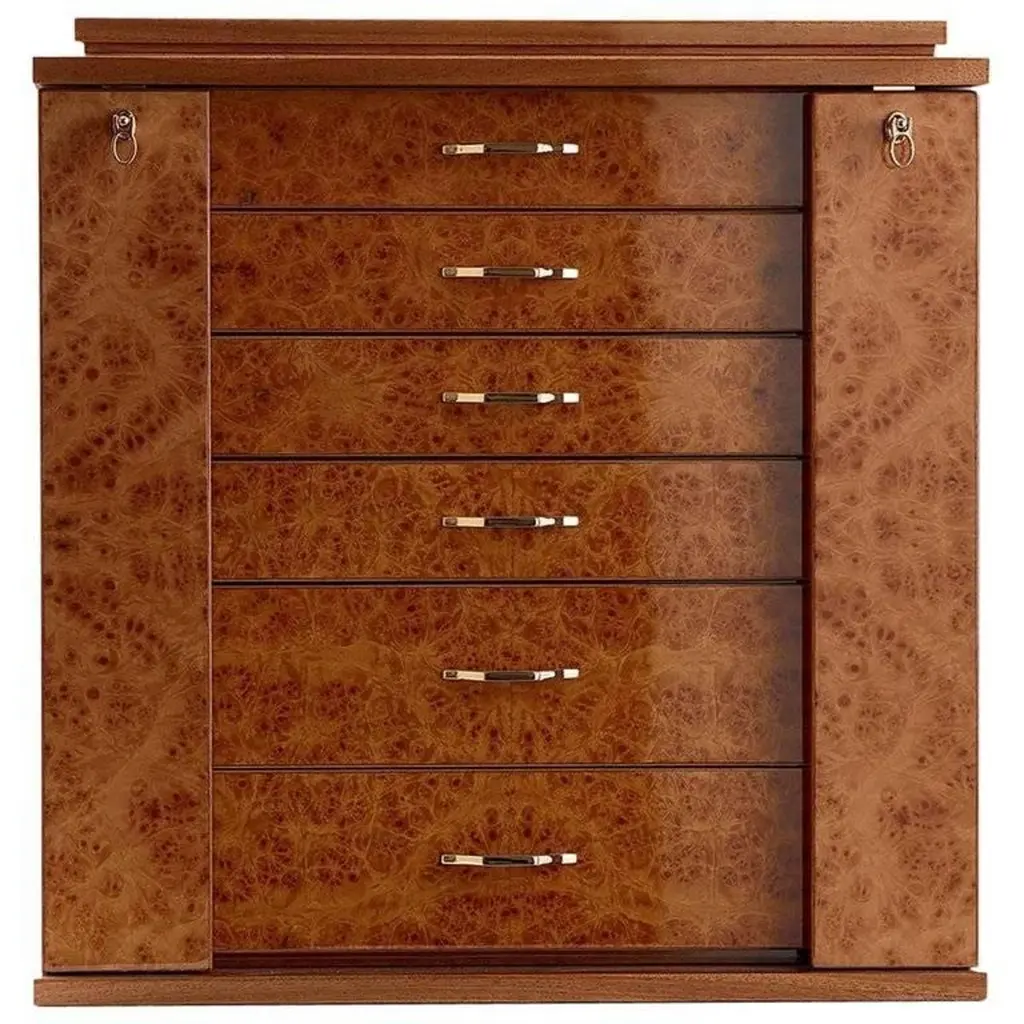 Since 1949, Agresti has crafted the pinnacle of luxury safes, trunks, and jewelry boxes in Florence, using only the finest materials, including full-grain leather, exotic woods, and textures like shagreen. As the premier name in high-end, custom solutions for safeguarding valuables, Agresti integrates cutting-edge security features: biometric access, secret compartments, unique keys, and hidden doorseverything you see in movies, they make real. Favored in multimillion-dollar estates, yachts, and private jets. Contact us to discover more about this exceptional product. Store and secure your precious jewelry in ultimate luxury with the Agresti Bijoux lockable jewelry chest. Crafted with polished briarwood and mahogany, lined with ultrasuede, and adorned with 24 karat gold plated brass accessories. Featuring necklace bars, lockable doors, and 5 drawers, with an adjustable mirror in the top section. Elevate your storage game with this elegant and exclusive piece.