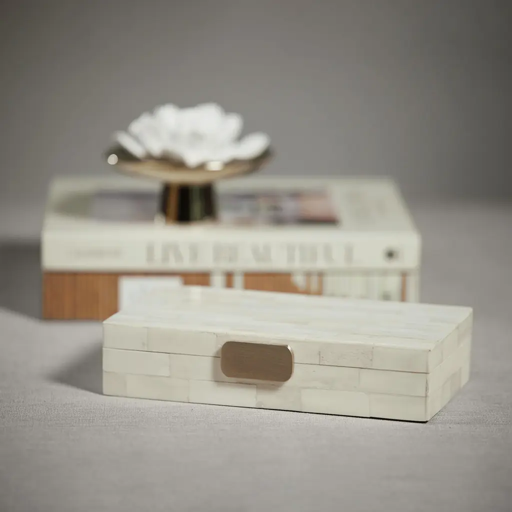 Random plank pattern of natural bone depicts a graphic design in this off-white decorative box. Finished with a rounded rectangular brass knob on the center. Keeps knick knacks under cover. It looks stunning on a bookshelf, table or mantel. A decorative box featuring a brick-like pattern of natural bone pieces A brass accent adds elegance and modern definition Single compartment wood interior Features hinged lid Materials: Buffalo Bone/Brass/MDF Care Instructions: Wipe with dry soft cloth
