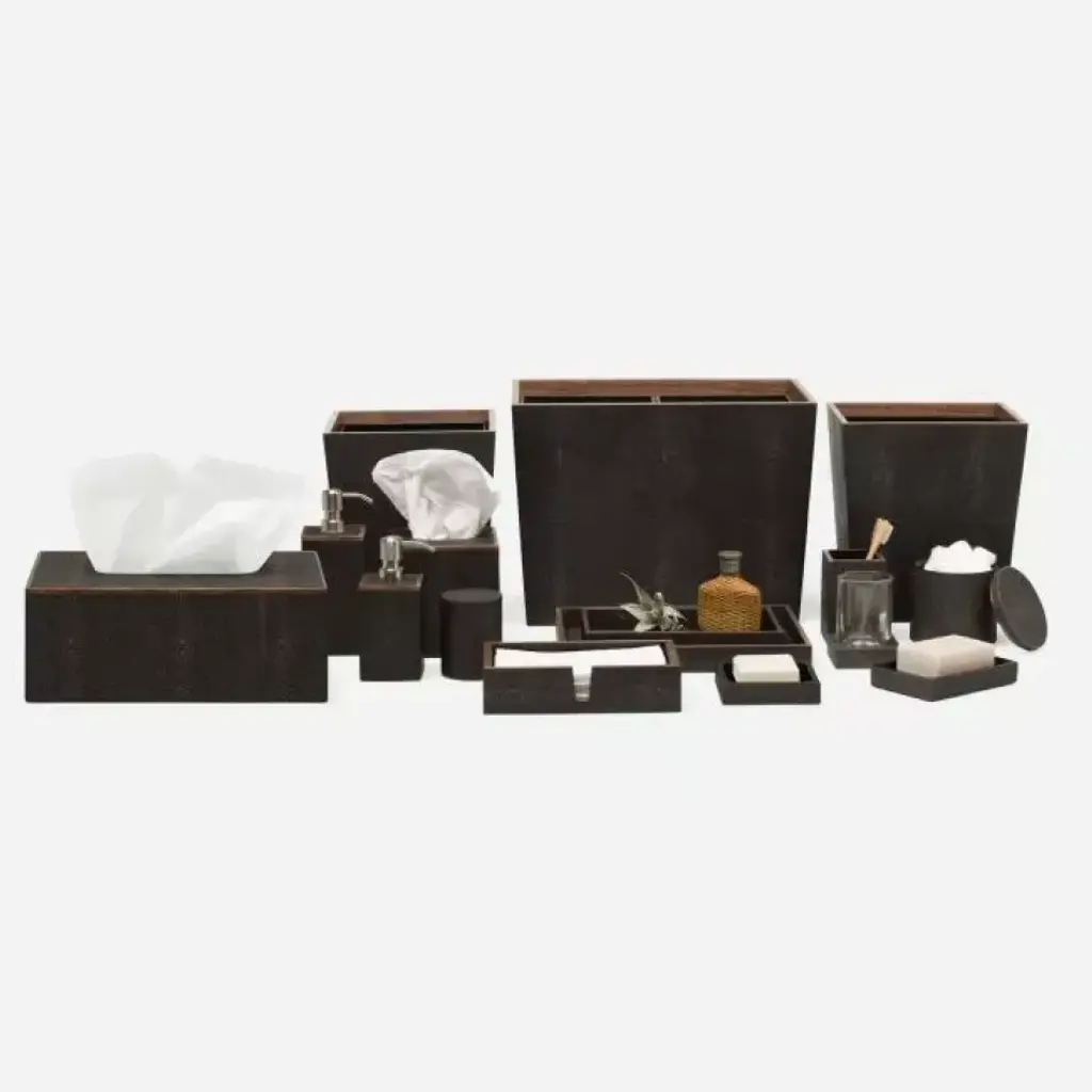Up a bath’s elegance and add an aesthetic edge with our striking realistic faux shagreen Manchester set. Each piece is crafted to highlight the natural “eye” pattern inspired by authentic shagreen, and topped with a veneer trim. The designers at Pigeon & Poodle believe the details of a home are just as important as the furniture. A gorgeous toothbrush holder or handcrafted canister can elevate an entire bath, the perfect frame can heighten the feel of a whole space, and a good-looking storage basket can be your look’s missing link. With thoughtful design and top-notch craftsmanship, Pigeon & Poodle create home accessories with the care and attention typically reserved for larger pieces of décor.