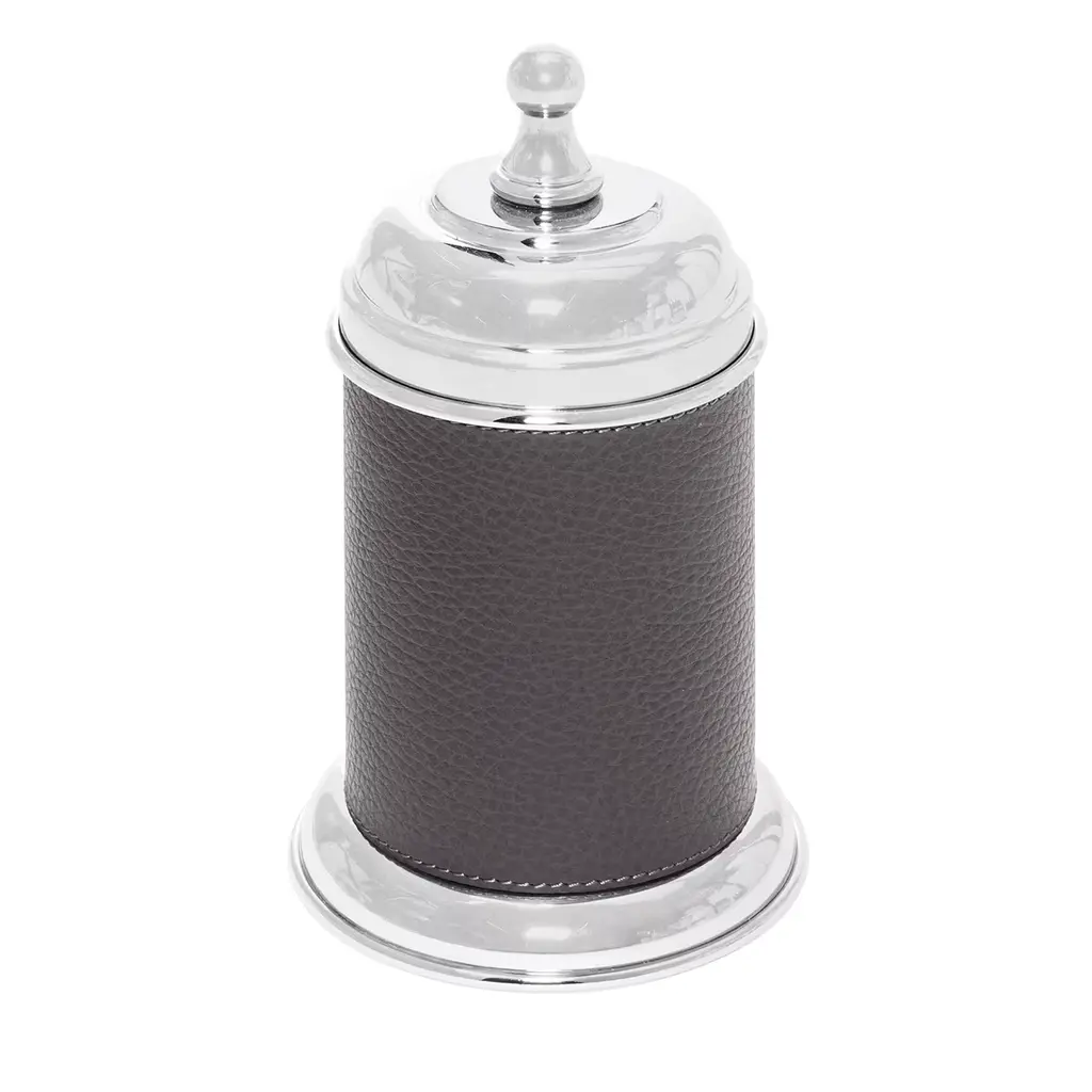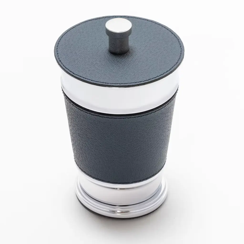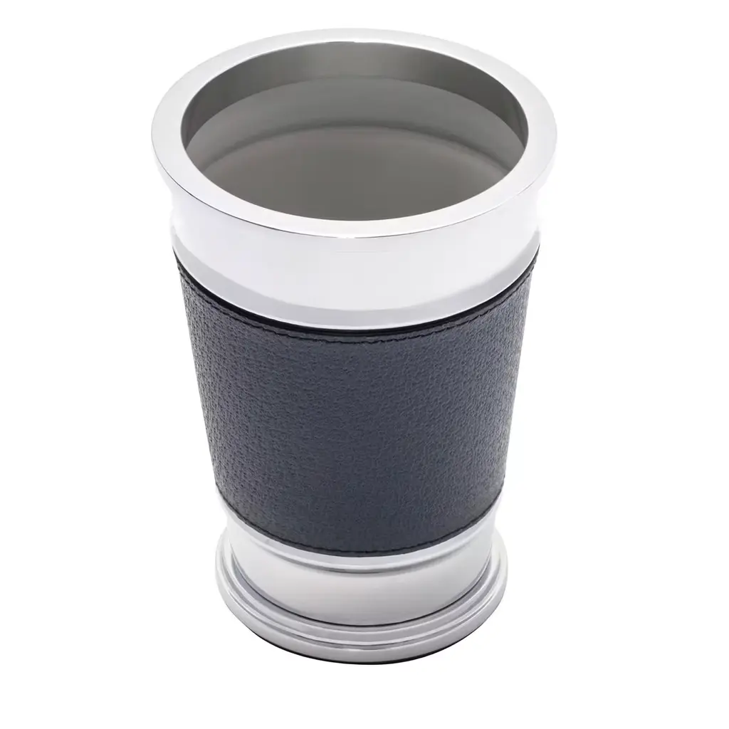 The pieces belonging to this bathroom set boast a characterizing inverted truncated cone metal structure with fine leather inserts. Featuring a series of decorative protrusions and indentations, the Manhattan collection retains a typically modern architectural appeal. Partially leather-covered metal structure. Non-slip waterproof rubber base underneath.