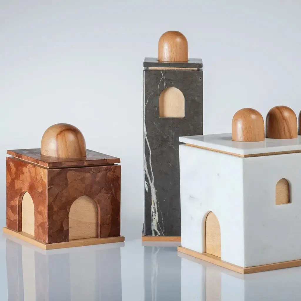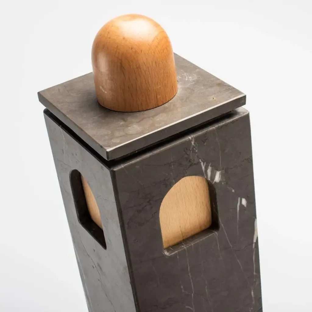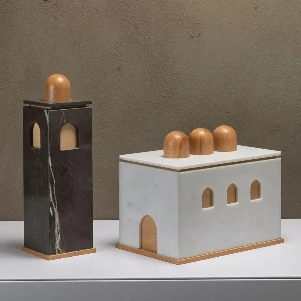 Graphite marble high quba is part of a collection of three containers that arise by putting together the artisan processing of wood and that of marble from brushed finish. Table architecture that inspired by the Arab-Norman style, of which tornite beech wood domes, which here do from handles for lids, are an unmistakable element. A church, a bell tower and a quba which, like chests, protect and guard our personal treasures within them. The Quba boxes by Gabriele d'Angelo are made in Italy.