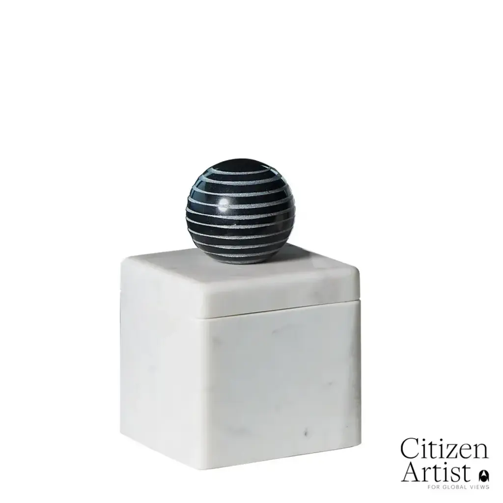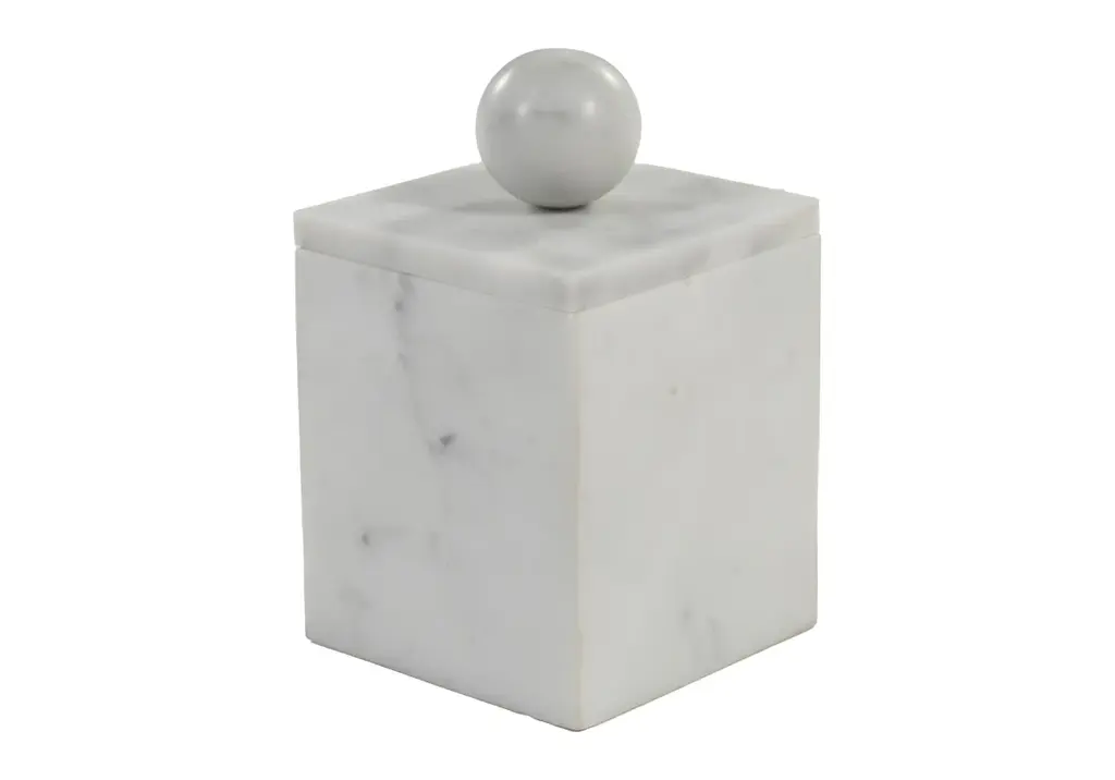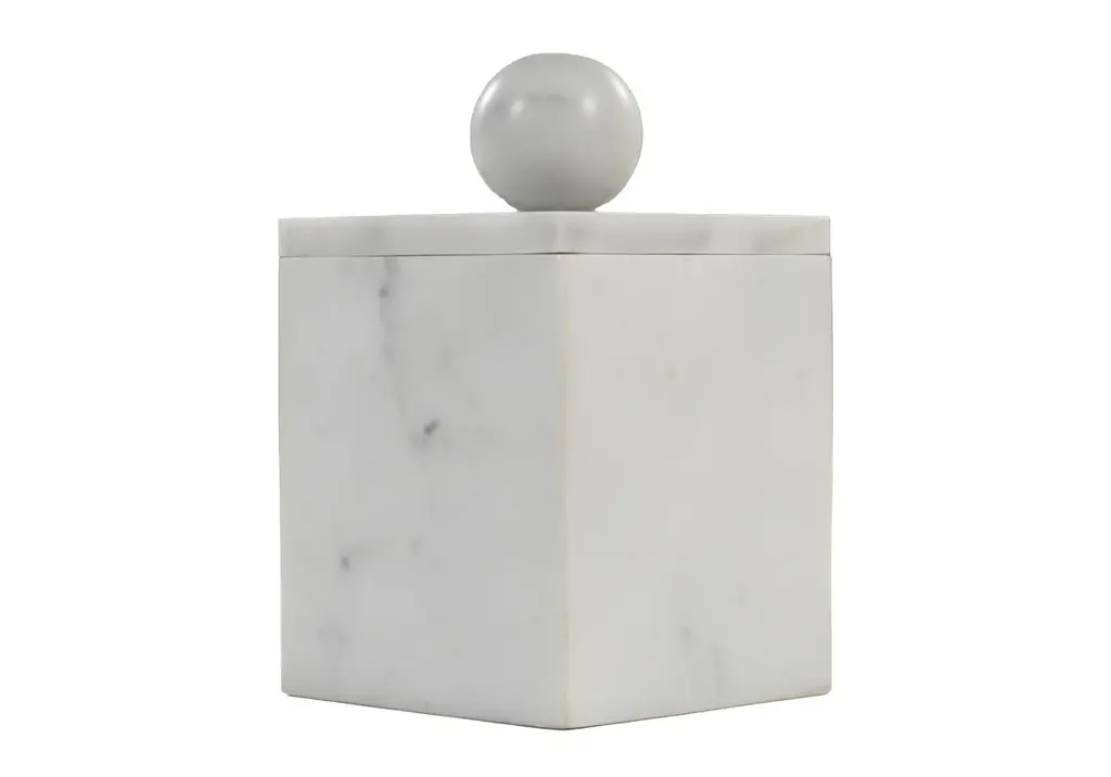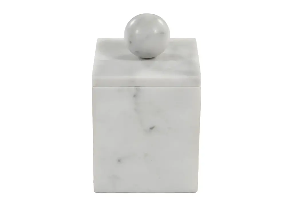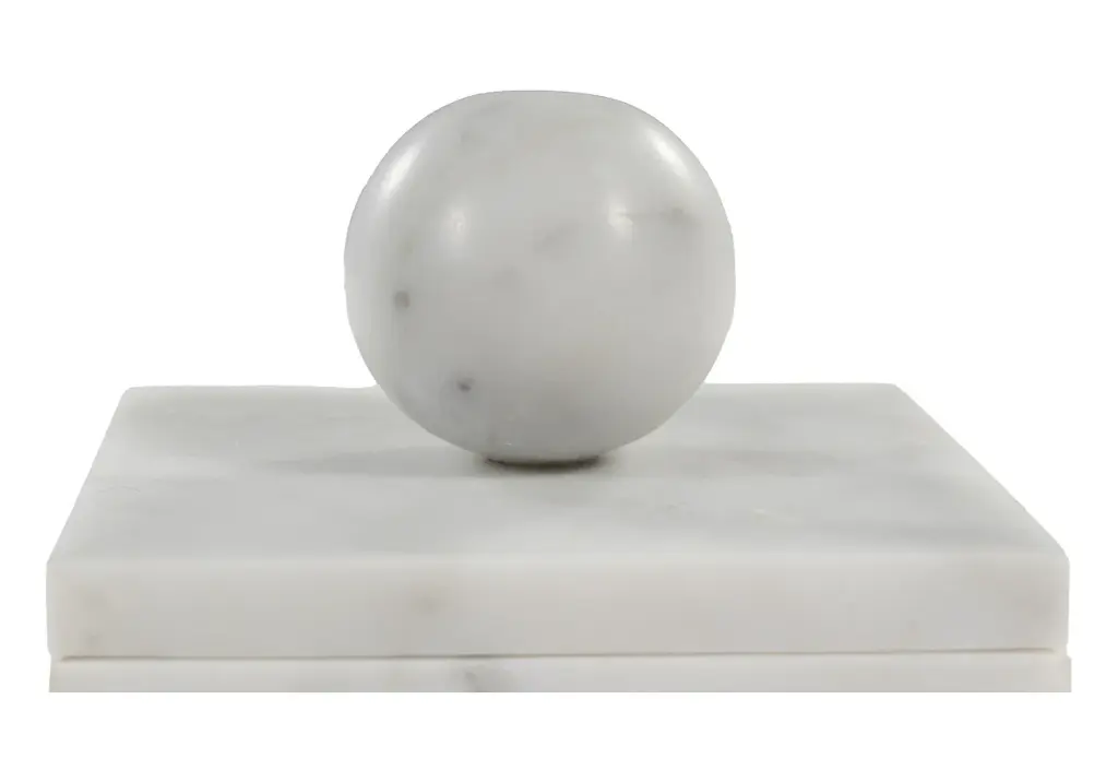 Entirely crafted from marble, this stunning box is a luxurious addition. Its petite size is contrasted by a thin lid and dark, rounded finial, for an added dimensional touch. Incredibly versatile, its natural veining lends visual texture and elegance, styling beautifully on consoles, coffee tables, and built-ins.
