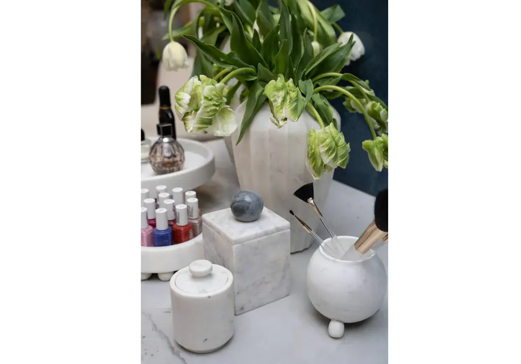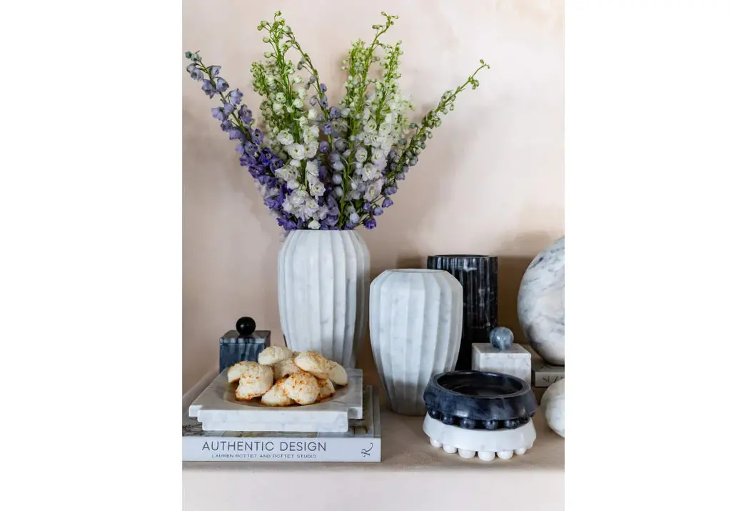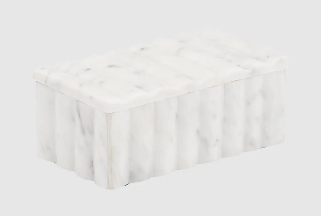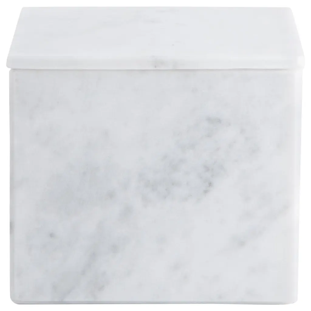 Entirely crafted from marble, this stunning box is a luxurious addition. Its petite size is contrasted by a thin lid and dark, rounded finial, for an added dimensional touch. Incredibly versatile, its natural veining lends visual texture and elegance, styling beautifully on consoles, coffee tables, and built-ins.