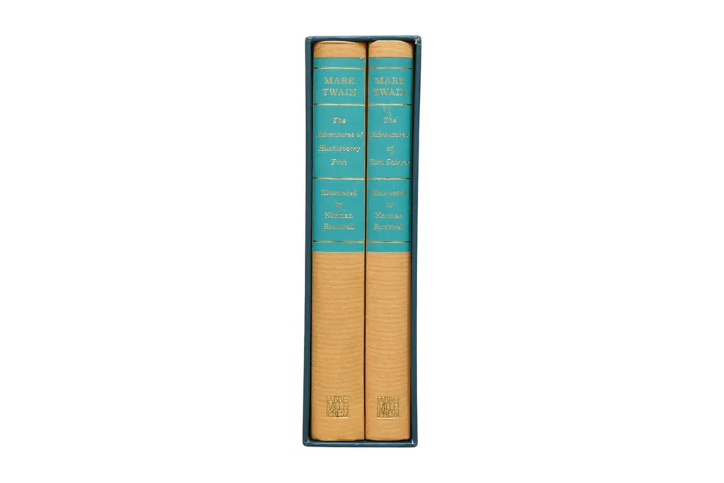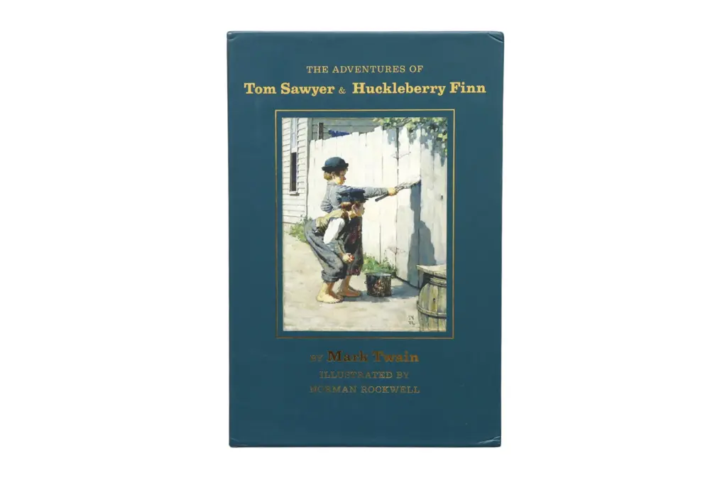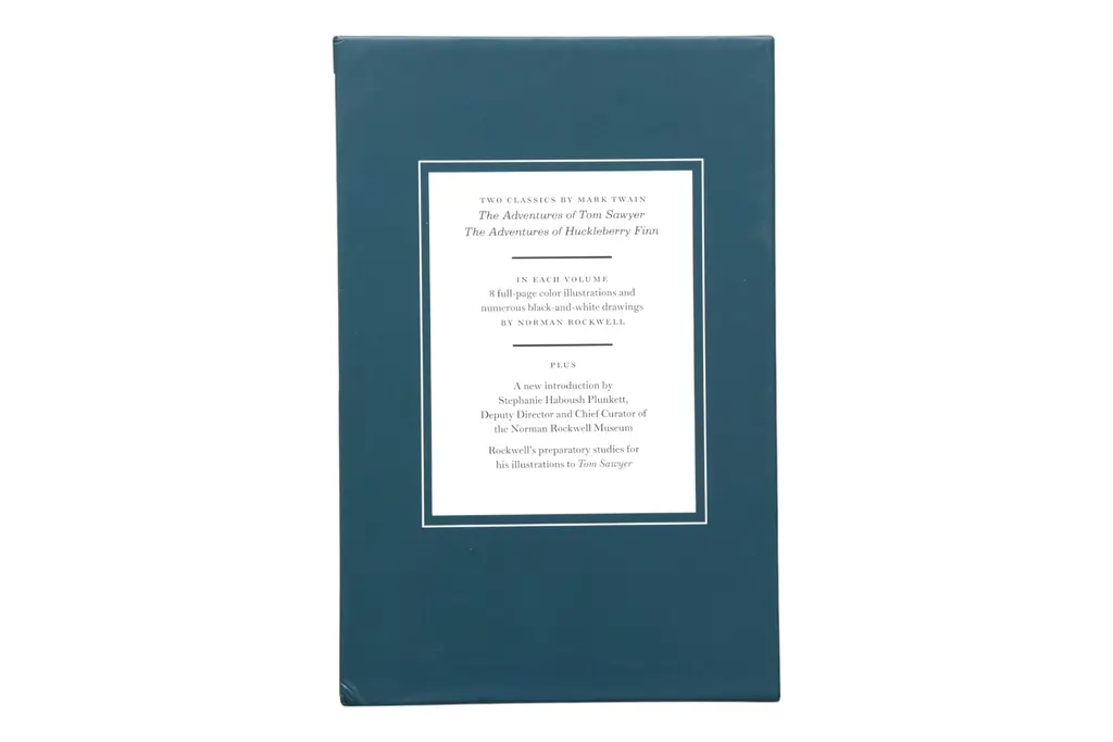 A boxed set of two Mark Twain hardcover books, with illustrations by Norman Rockwell. Includes The Adventures of Tom Sawyer and The Adventures of Huckleberry Finn. Published by Abbeville Press, stated Abbeville Press first edition.