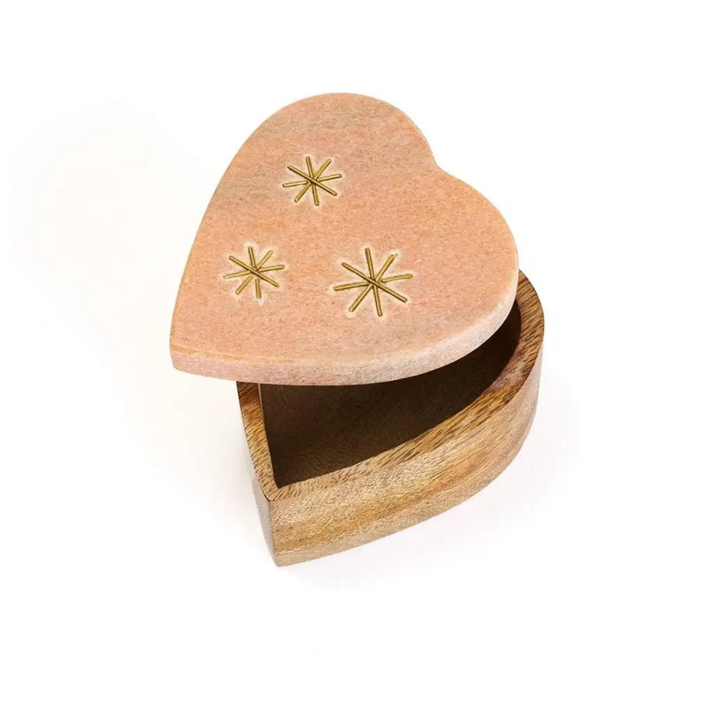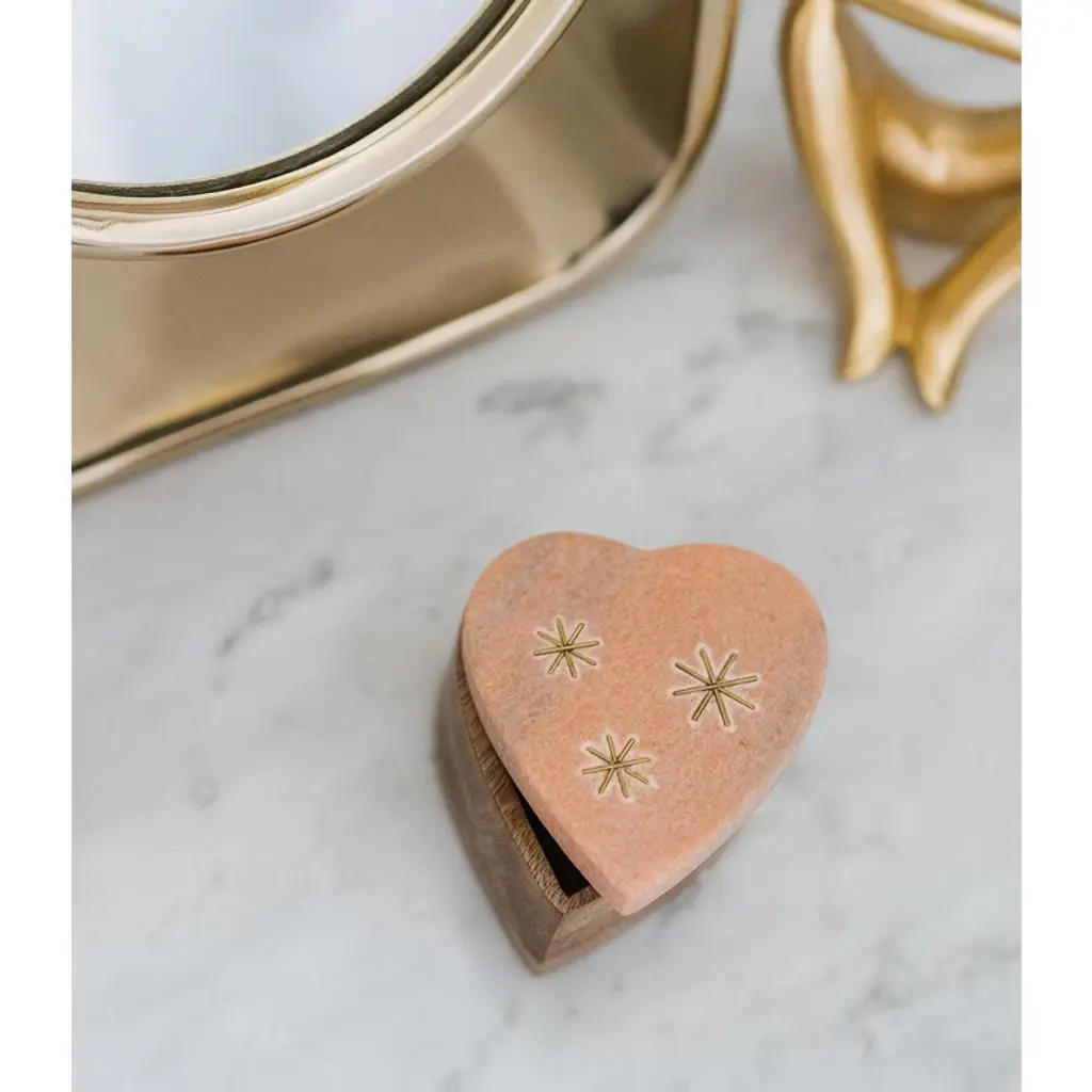 The pink marble featured in the Jaipuri collection is a nod to the "Pink City" of Jaipur India. A hand carved marble lids sits on top of this heart shaped, sustainably harvested mango wood box and features brass stars inlay. This keepsake or jewelry box is great for stylish safekeeping of small jewelry items, little mementos, coins or stationary items like paper clips or pins. The heart shape lends itself well towards a Valentines gift or as a engagement ring box or to give as a special anniversary gift. It can be gifted alone or as part of the larger Jaipuri collection gift set. It can be a gift itself or used as a gift box with another special gift inside.
