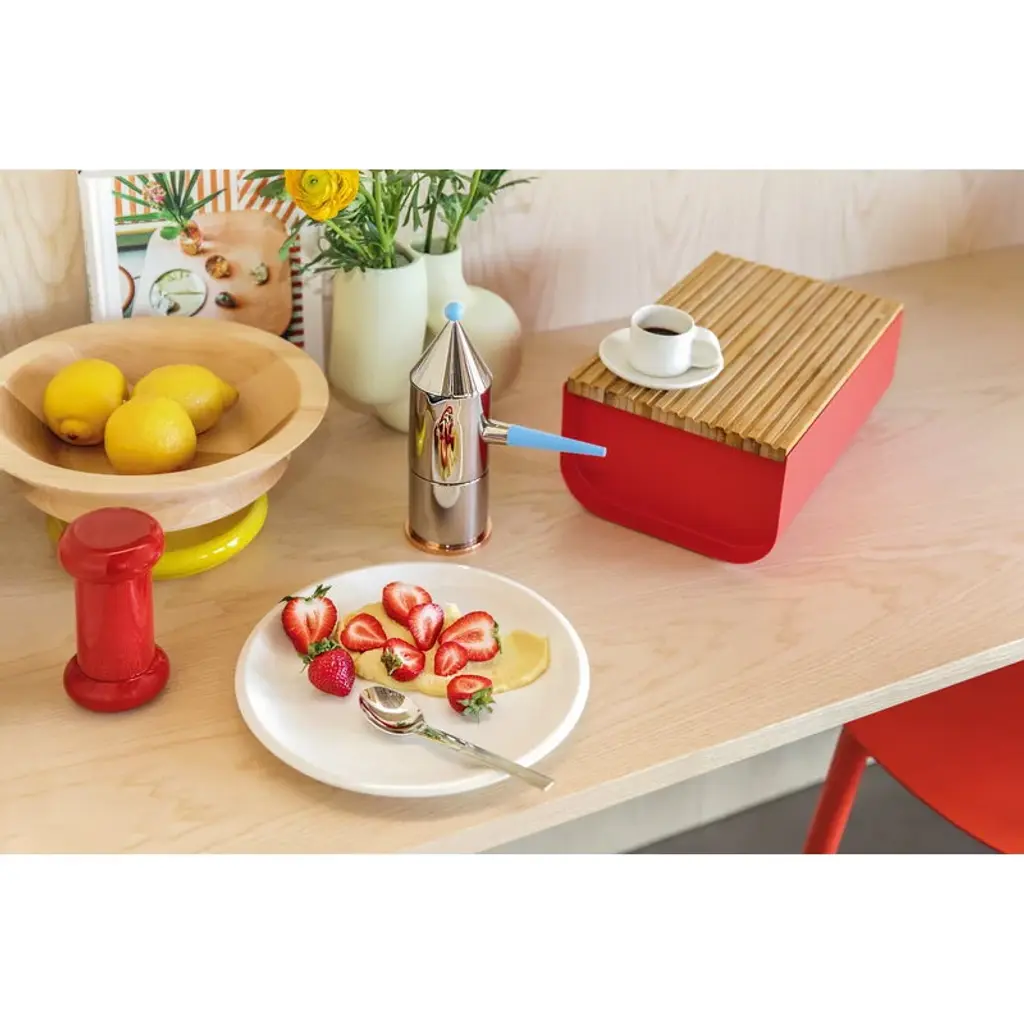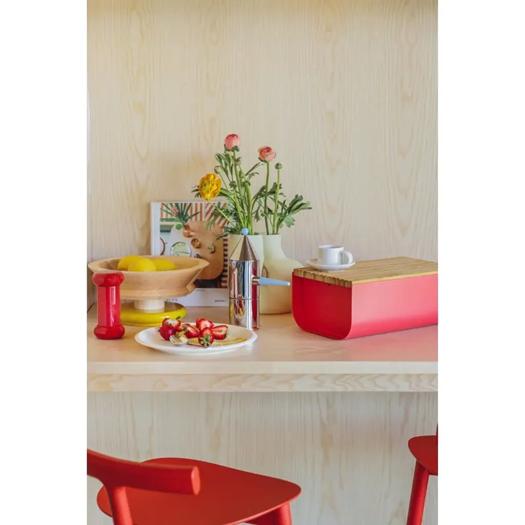 Alessi’s Mattina breadbox is a fresh and versatile addition to the kitchen decor. The breadbox was created by the Swiss design studio BIG-GAME with a mission to fill everyday routines with indulgence. The sleek and stylish metal container features a bamboo lid that can be used for slicing bread as well as for serving and sharing it.