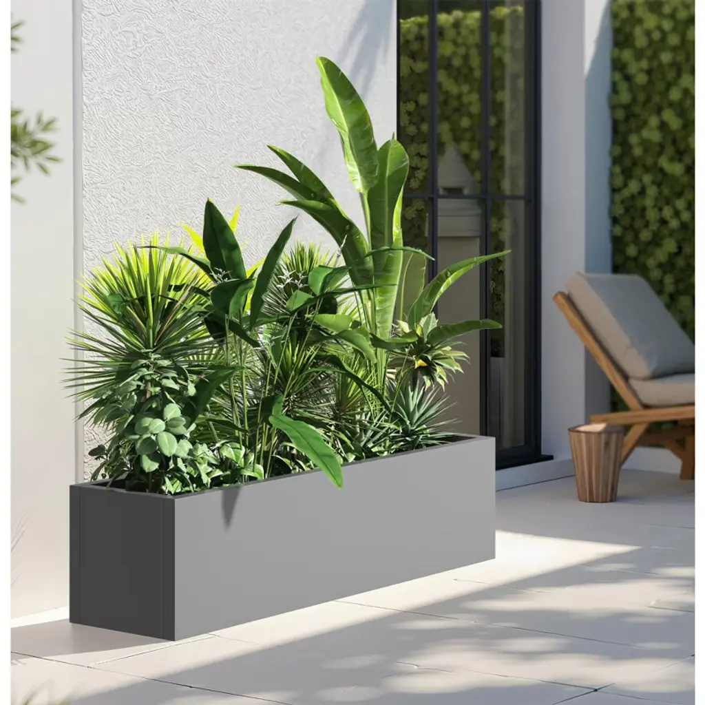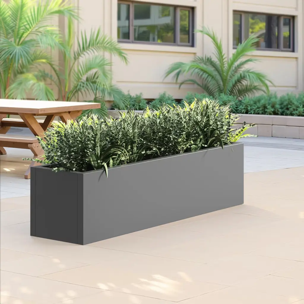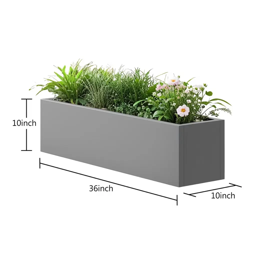 The MAYEERTY 36x9x9in planter box is a gray iron rectangle, neutral for versatile decor, fits small plants, and is weather-resistant easy to clean.