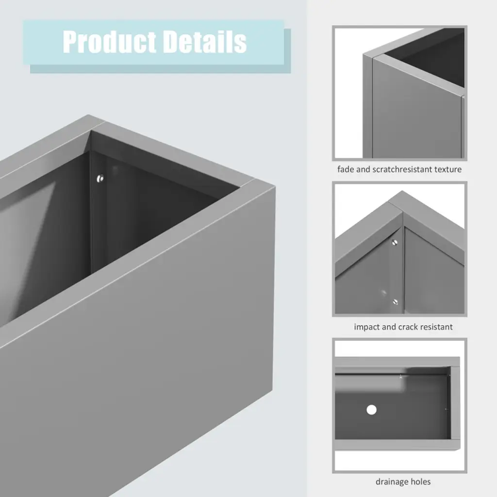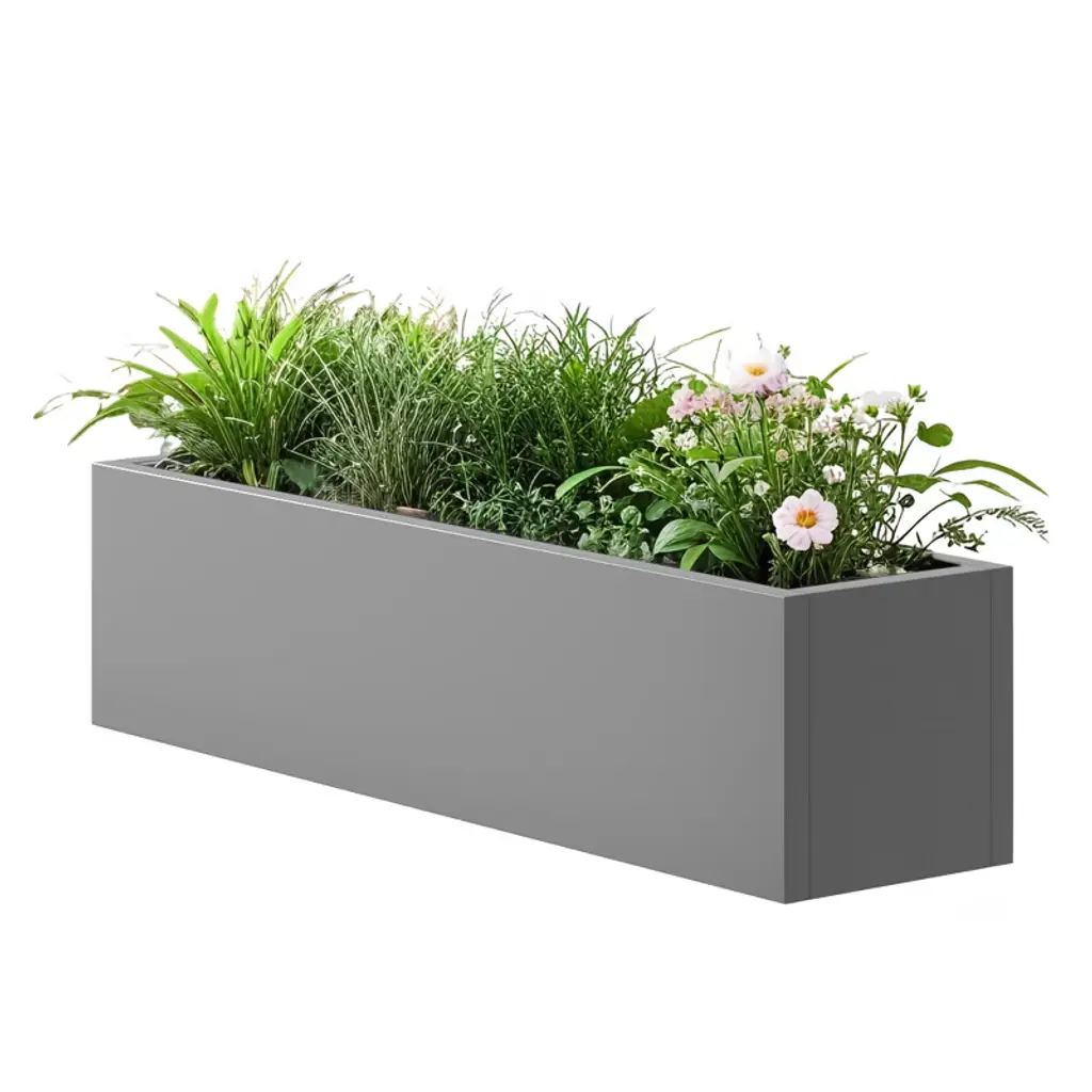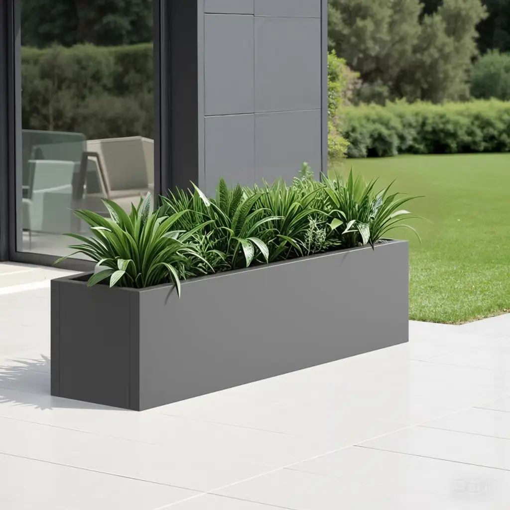 The MAYEERTY 36x9x9in planter box is a gray iron rectangle, neutral for versatile decor, fits small plants, and is weather-resistant easy to clean.