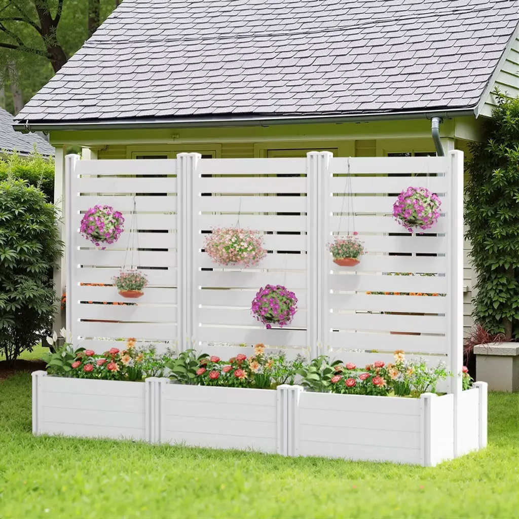 The MAYEERTY 71x35x24in tall PVC planter has a large capacity for tall plants (small trees, large shrubs). White PVC resists rot/moisture, and the 24in height adds vertical presence. Bright white finish suits modern outdoor spaces (large patios, gardens).