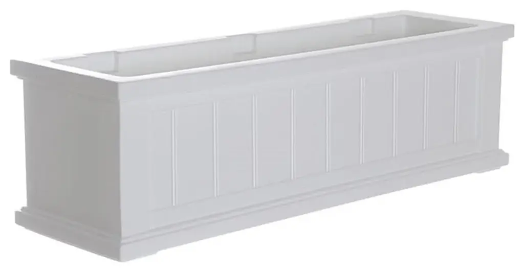 Our Cape Cod Collection perfectly captures the New England way of living - transforming your outdoor space into your own personal retreat. Its bead board panel design with rich architectural details fits in perfectly, whether its used in a rustic farmhouse or in a gorgeous cottage by the beach. These window boxes are made from 100% high-grade Polyethylene that make it weatherproof and have an ultra-tough construction. This collection is available in Black, Graphite Grey and White.Features: • Mayne products are made with 100% high-grade polyethylene resin. • The resin used in this window box has built-in UV inhibitors that ensure it does not fade easily. • Double wall design provides the soil with adequate insulation from surrounding weather conditions. • Built-in water reservoir provides your plants with a consistent source of moisture. • Mayne offers a 15-year residential warranty or a 5-year commercial warranty on this 3ft window box. • Mayne products are proudly designed in Canada and made in the USA.Specifications: • Color/Finish: White • Commercial/Residential: Both • Hardware: Included • Included: Instructions, fill port plug, 3 steel wall mounts • Material: Polyethylene Resin Plastic • Product Dimensions: 11"H x 11"W x 36"D • Product Weight: 13.5 lbs • Warranty: (Residential) 15 years; (Commercial) 5 years