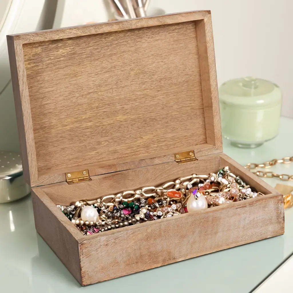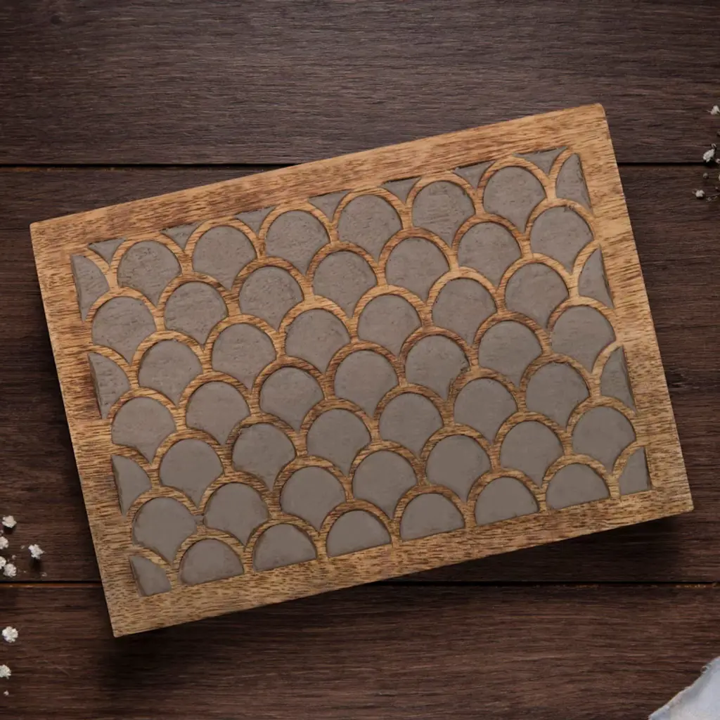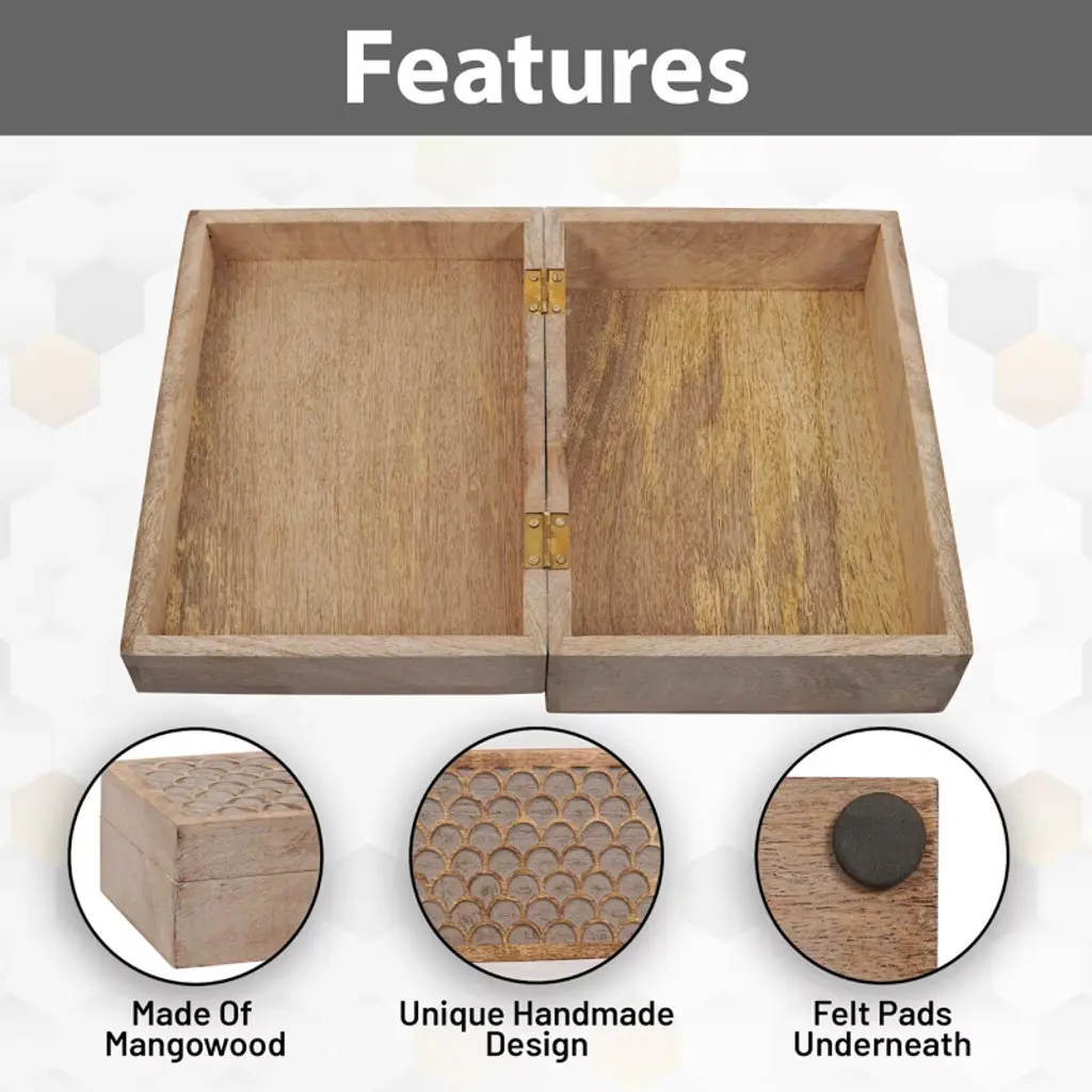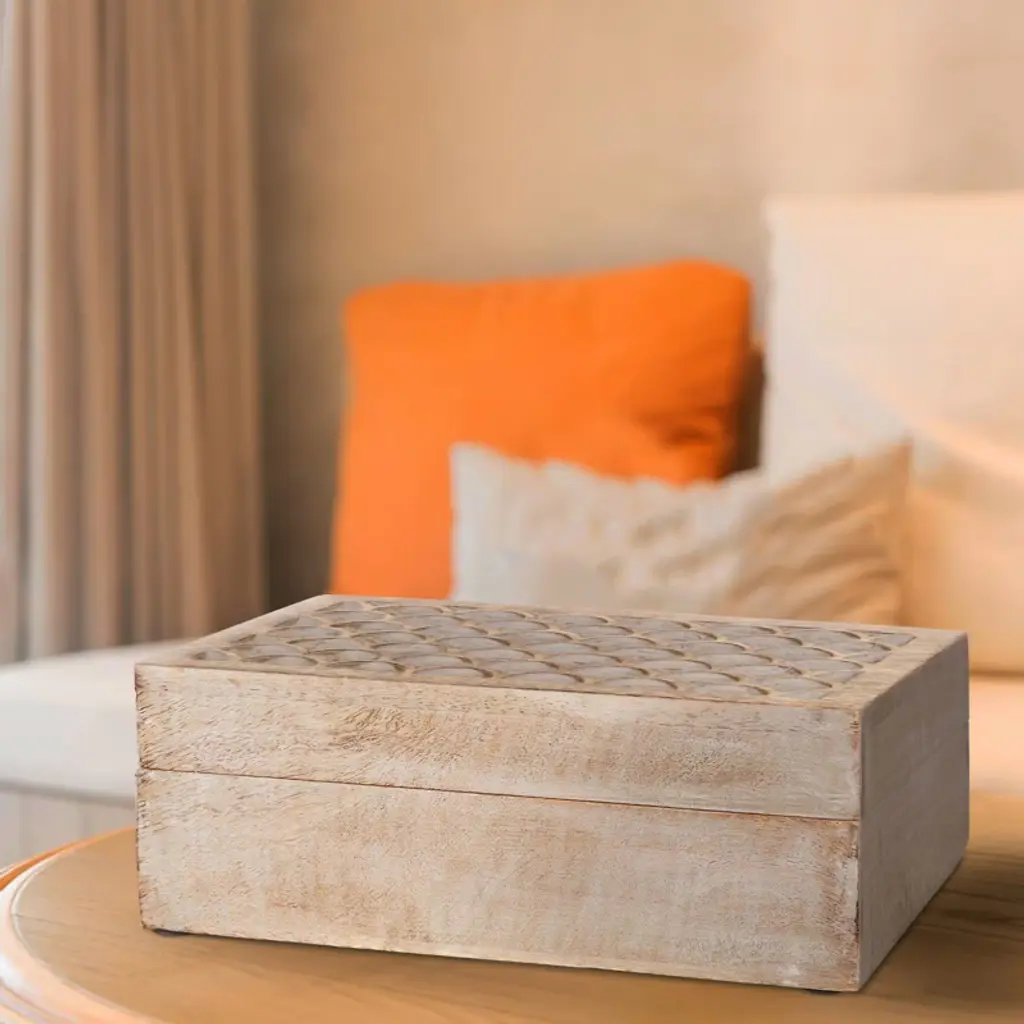 This decorative wooden storage box highlights artisan craftsmanship with elegant carvings and a lightly burnt finish. Its versatile design suits jewelry, stationery, or keepsakes, while the timeless look complements a variety of interiors. Each handmade piece is unique, ensuring no two are ever identical. Perfect as both a functional organizer and a striking accent, it also doubles as a thoughtful gift for weddings, holidays, or special occasions, bringing lasting charm to any space. Available sizes: Medium – 7.5 x 4.5 x 3" Large – 9 x 6 x 3.5" Extra Large – 10.5 x 7.5 x 4"