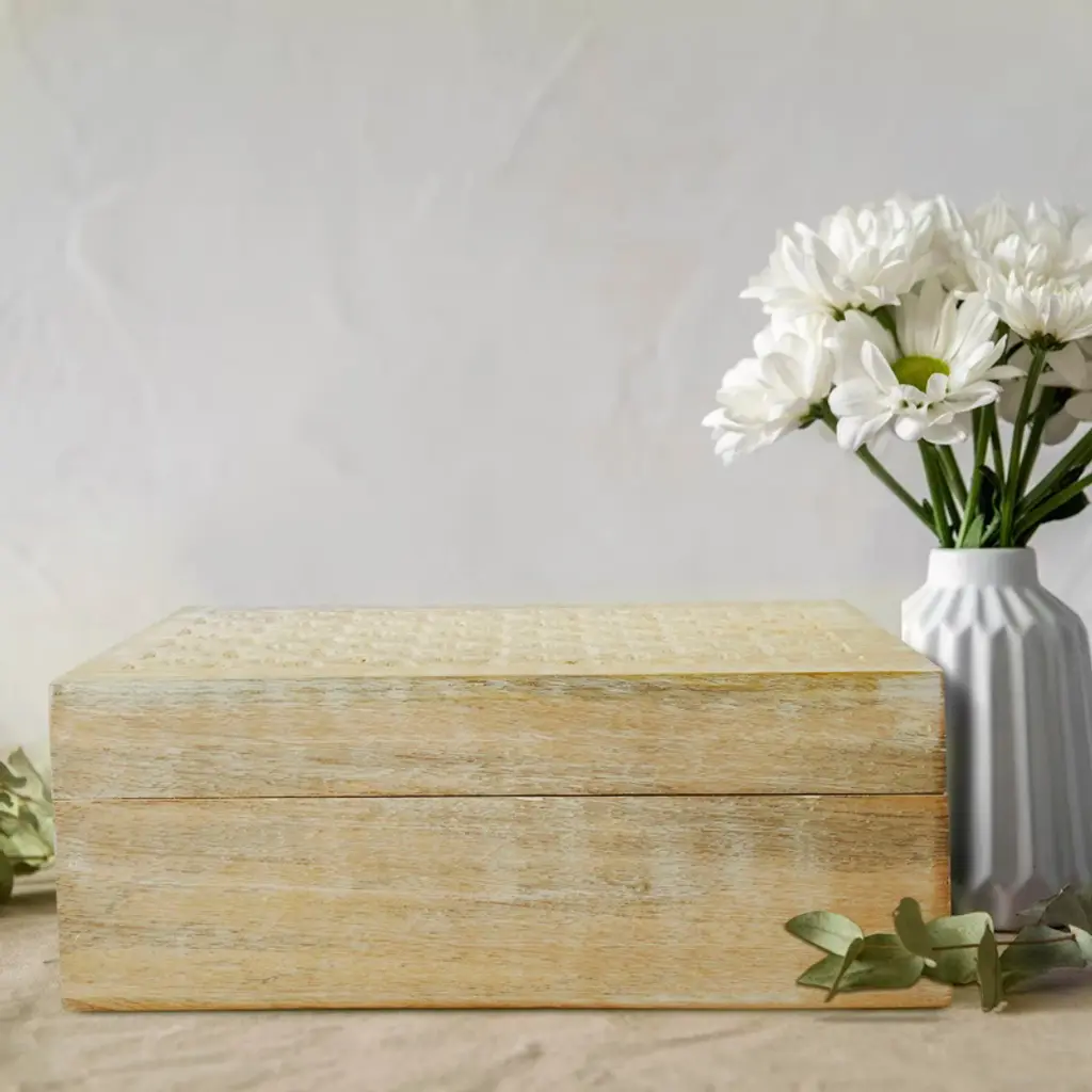 Carved by artisans with trellis-inspired patterns, this handmade wooden storage box is finished in rustic tones for authentic charm. Ideal for jewelry, keepsakes, or trinkets, it offers practical storage with decorative appeal. Each handcrafted piece carries slight variations, making it unique and one of a kind. Designed to complement traditional, modern, or coastal interiors, it adds timeless beauty to any room. Perfect as a gift, it suits weddings, birthdays, or festive occasions, celebrating artisan traditions with purpose. Available sizes: Medium – 7.5 x 4.5 x 3" Large – 9 x 6 x 3.5" Extra Large – 10.5 x 7.5 x 4"