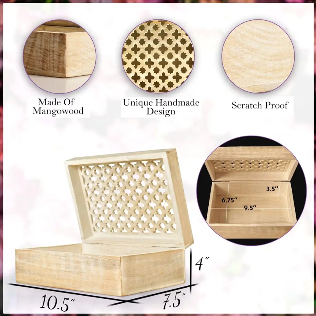 Carved by artisans with trellis-inspired patterns, this handmade wooden storage box is finished in rustic tones for authentic charm. Ideal for jewelry, keepsakes, or trinkets, it offers practical storage with decorative appeal. Each handcrafted piece carries slight variations, making it unique and one of a kind. Designed to complement traditional, modern, or coastal interiors, it adds timeless beauty to any room. Perfect as a gift, it suits weddings, birthdays, or festive occasions, celebrating artisan traditions with purpose. Available sizes: Medium – 7.5 x 4.5 x 3" Large – 9 x 6 x 3.5" Extra Large – 10.5 x 7.5 x 4"