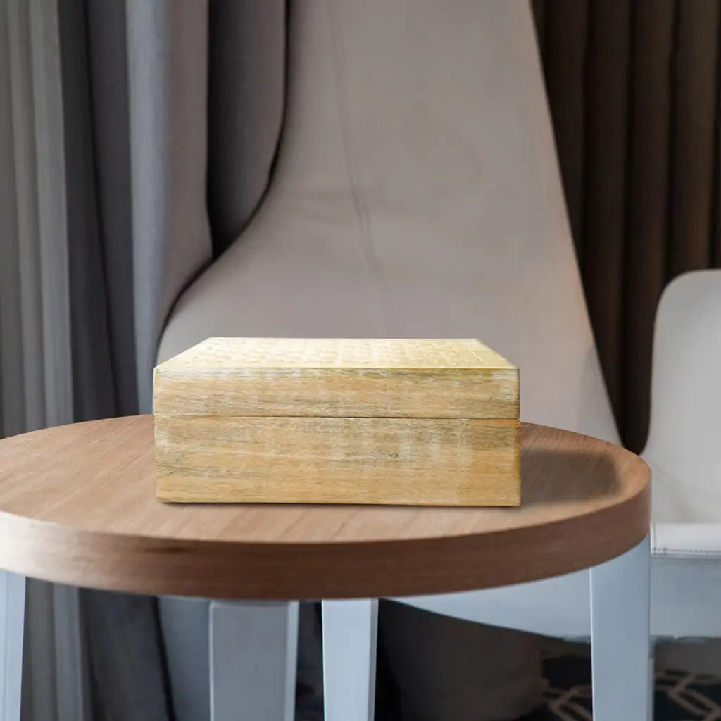 Carved by artisans with trellis-inspired patterns, this handmade wooden storage box is finished in rustic tones for authentic charm. Ideal for jewelry, keepsakes, or trinkets, it offers practical storage with decorative appeal. Each handcrafted piece carries slight variations, making it unique and one of a kind. Designed to complement traditional, modern, or coastal interiors, it adds timeless beauty to any room. Perfect as a gift, it suits weddings, birthdays, or festive occasions, celebrating artisan traditions with purpose. Available sizes: Medium – 7.5 x 4.5 x 3" Large – 9 x 6 x 3.5" Extra Large – 10.5 x 7.5 x 4"