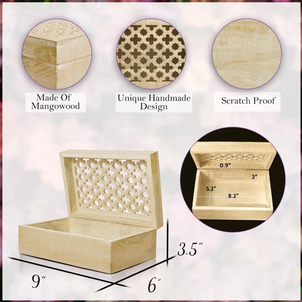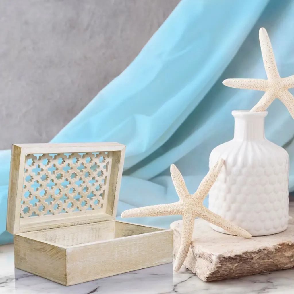 This artisan-made wooden box features intricate trellis carvings and a distressed white finish that enhances its timeless appeal. Compact versions store jewelry and trinkets, while larger designs organize keepsakes or stationery. Every handmade piece has unique variations that reflect skilled craftsmanship. Decorative and practical, it suits a range of interior styles, from rustic to contemporary. A thoughtful and versatile gift, it makes a lasting choice for weddings, birthdays, or housewarmings, blending artisan artistry with everyday function. Available sizes: Medium – 7.5 x 4.5 x 3" Large – 9 x 6 x 3.5" Extra Large – 10.5 x 7.5 x 4"