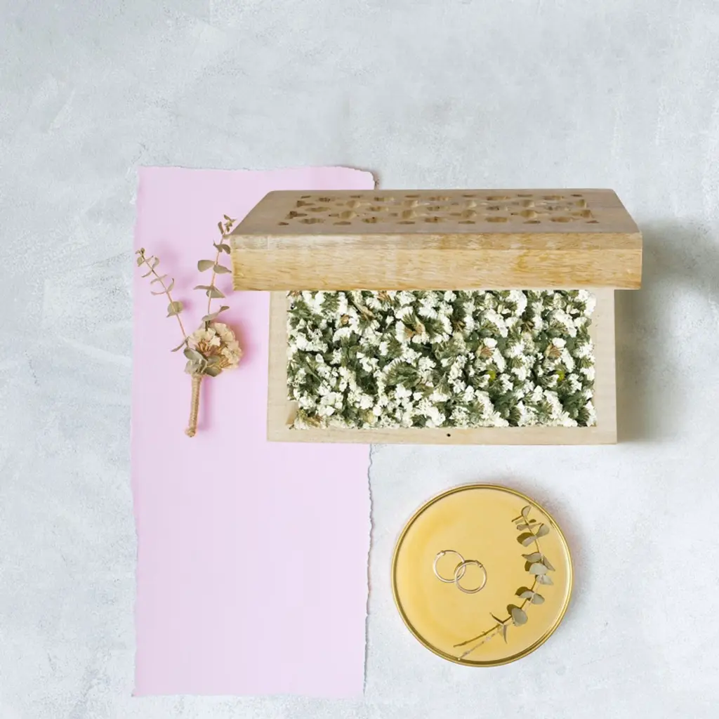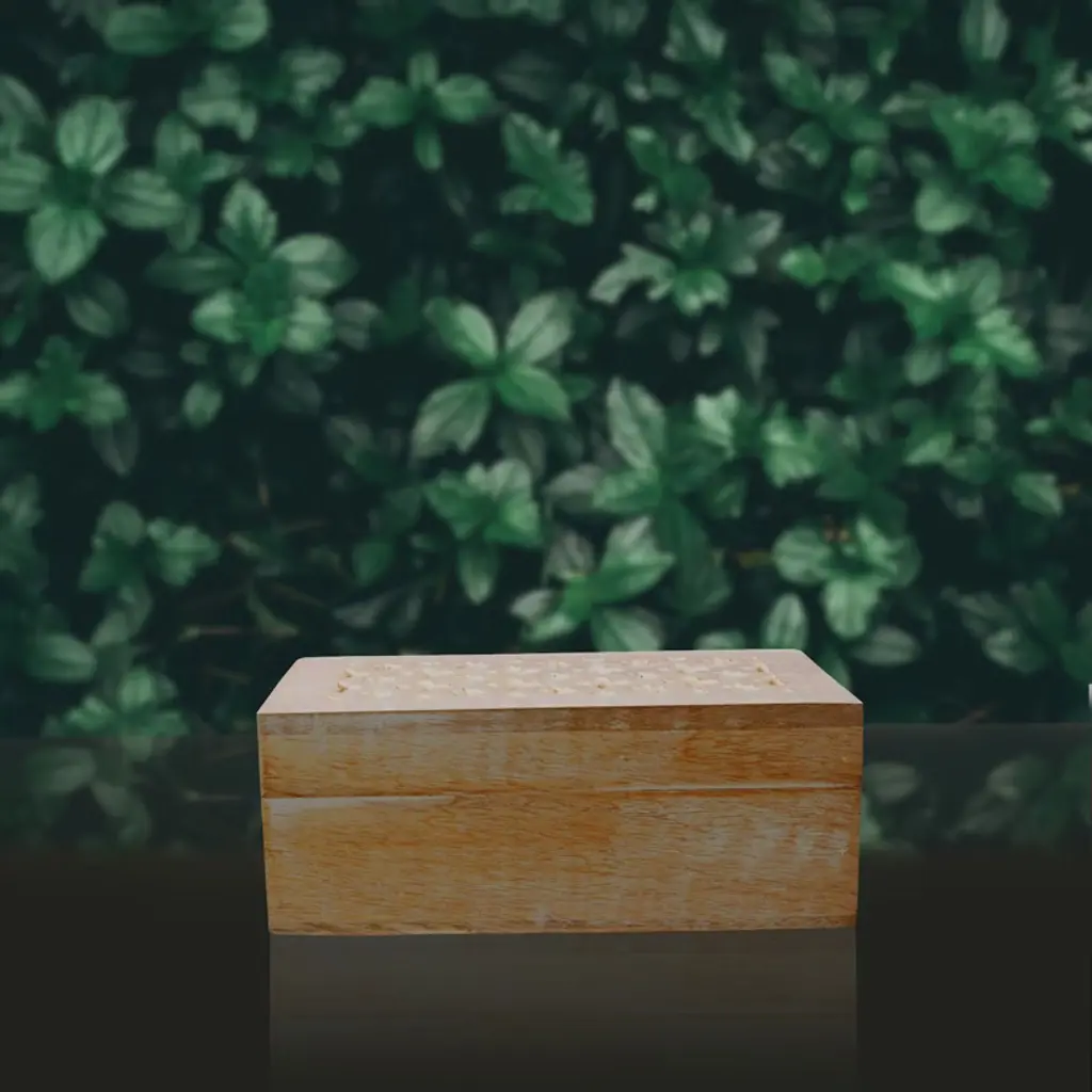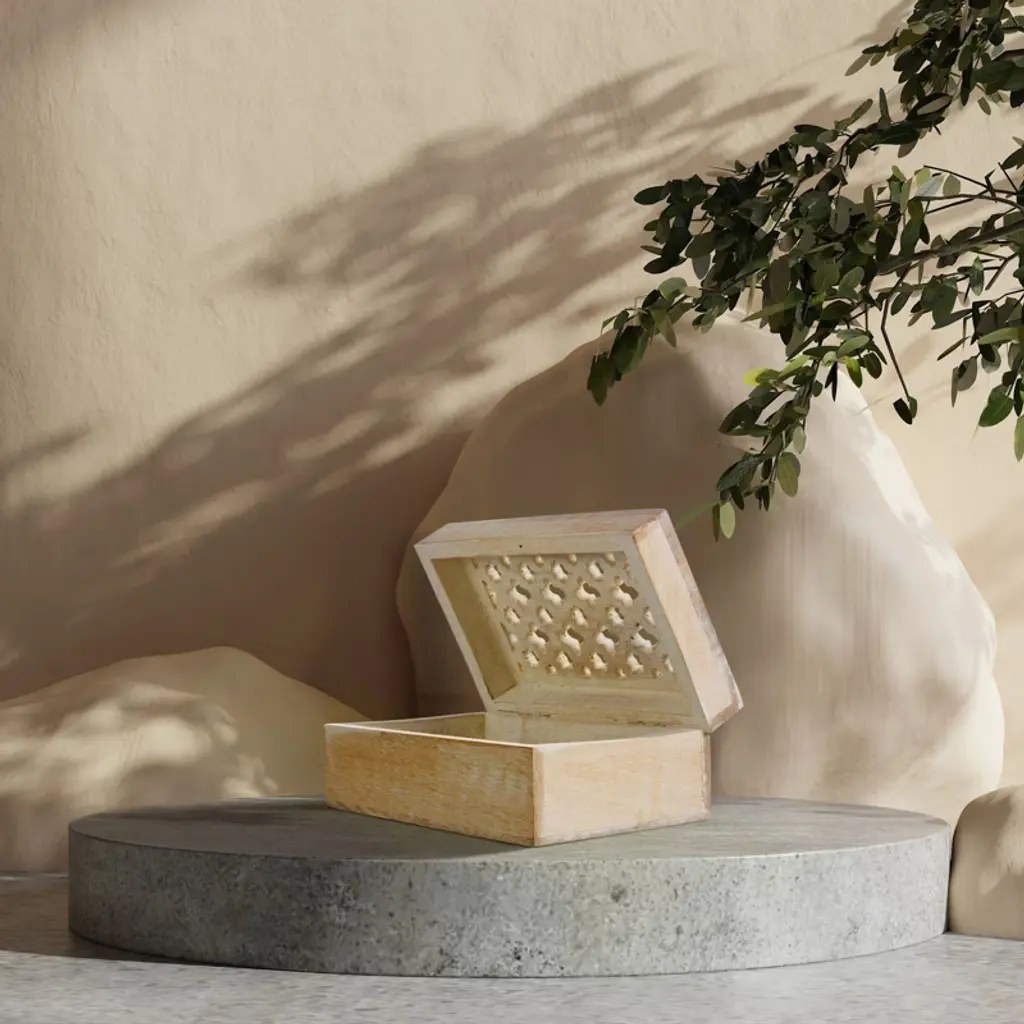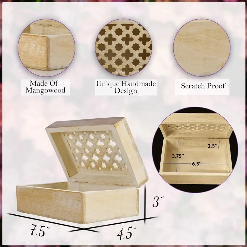 Handcrafted from natural mango wood, this decorative storage box features trellis-inspired carvings with a rustic finish. Each artisan-made piece is unique, carrying subtle variations in tone and detailing. Perfect for jewelry, keepsakes, or small trinkets, it also doubles as a charming accent for shelves or consoles. Blending beauty with functionality, it fits seamlessly into modern or traditional interiors. A versatile gift idea, it works beautifully for weddings, birthdays, or housewarmings, celebrating both utility and craftsmanship. Available sizes: Medium – 7.5 x 4.5 x 3" Large – 9 x 6 x 3.5" Extra Large – 10.5 x 7.5 x 4"