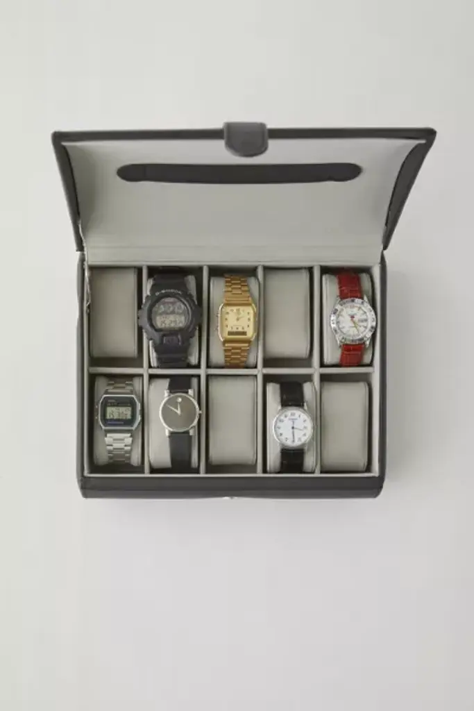 Keep your watches organized with this storage box from Mele and Co Crafted from vegan leather lined with grey suede lining, this storage box is equipped with ten sections each complete with a padded watch cushion. Features a slim strap under the lid that's perfect for securing your small essentials. **Features** \- Watch storage box from Mele and Co \- 10 Sections with padded watch cushions \- Slim strap under lid for additional storage \- Tabbed magnetic snap closures **Content + Care** \- Sueded fabric, polyurethane/fiberboard \- Wipe clean \- Imported **Size** \- Dimensions: 9.5"l x 8.25"w x 3.75"h \- Weight: 1.7 lbs