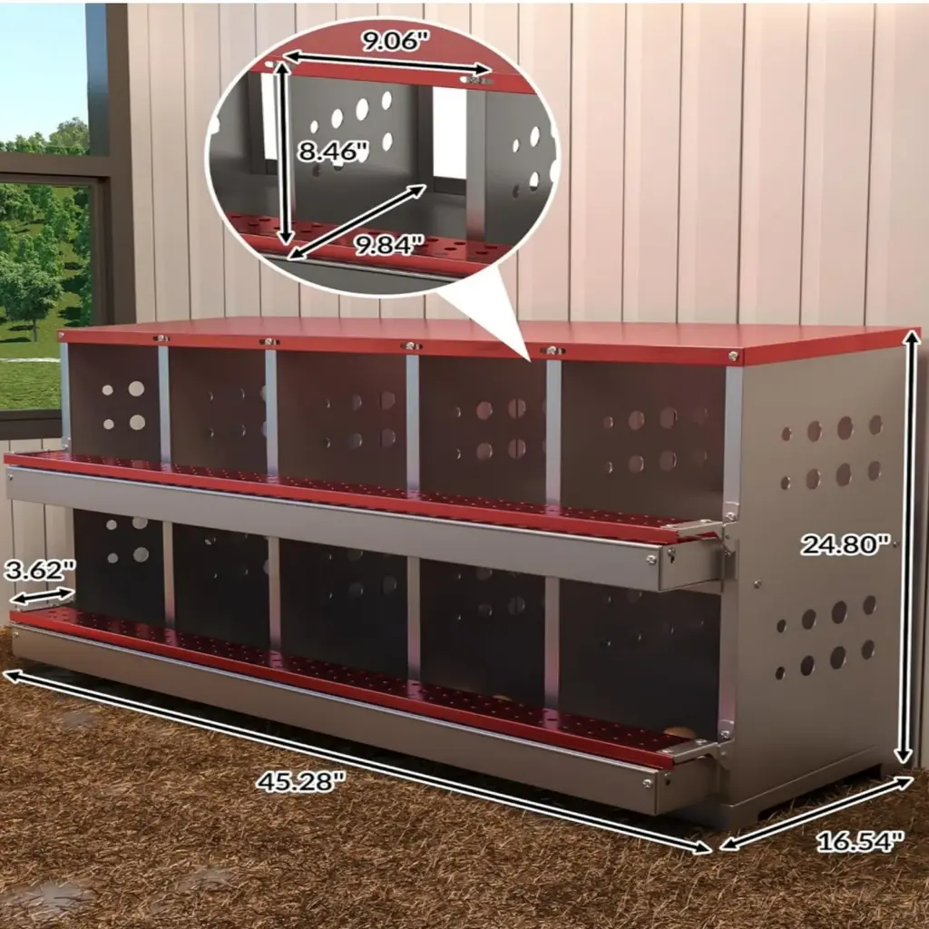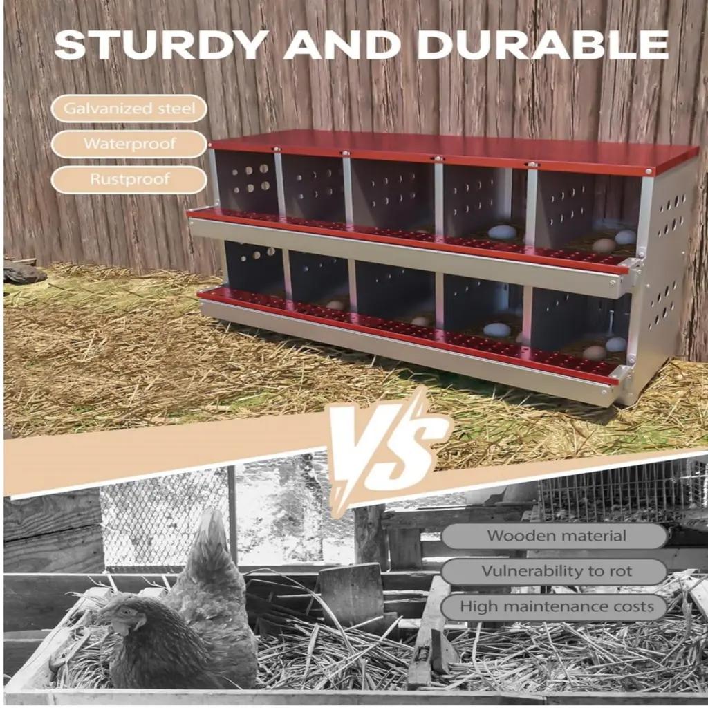 [Comfortable Nesting Environment] - The Hipicute chicken nesting box boosts egg production by providing a welcoming space for hens, complete with plastic eggs to ease them into the new setup. It features a built-in hanging hole for 18-20 inch mounting and an integrated perch for hens to observe their surroundings and regulate heat. Ten roomy compartments (9.84"D x 9.06"W x 8.46"H each) ensure optimal comfort[Automatic Egg Collection] - Eliminate tedious manual egg gathering with our Hipicute roll-away nesting box system that promptly collects eggs just after they're laid. Its sloped design and upper protective panel deter chickens from eating the eggs while minimizing breakage and contamination for enhanced safety and efficiency[Quick Installation] - Every Hipicute laying box for hens comes complete with the necessary screws, nuts, and clear instructions to facilitate a straightforward setup in about 30 minutes. Our support team is ready to help if you need assistance[Designed for Lasting] - Constructed from galvanized steel, this Hipicute nesting box for laying eggs is waterproof, rustproof, and built to last, guaranteeing reliable performance even in demanding barn environments[Easy to Clean] - The Hipicute roll-out nesting box is engineered for effortless maintenance; a quick rinse with water is all that's needed. The gently sloped roof channels water away, while the bottom grate and side ventilation holes enhance airflow to speed up drying, reducing cleaning time and keeping the box consistently dry and ready for use