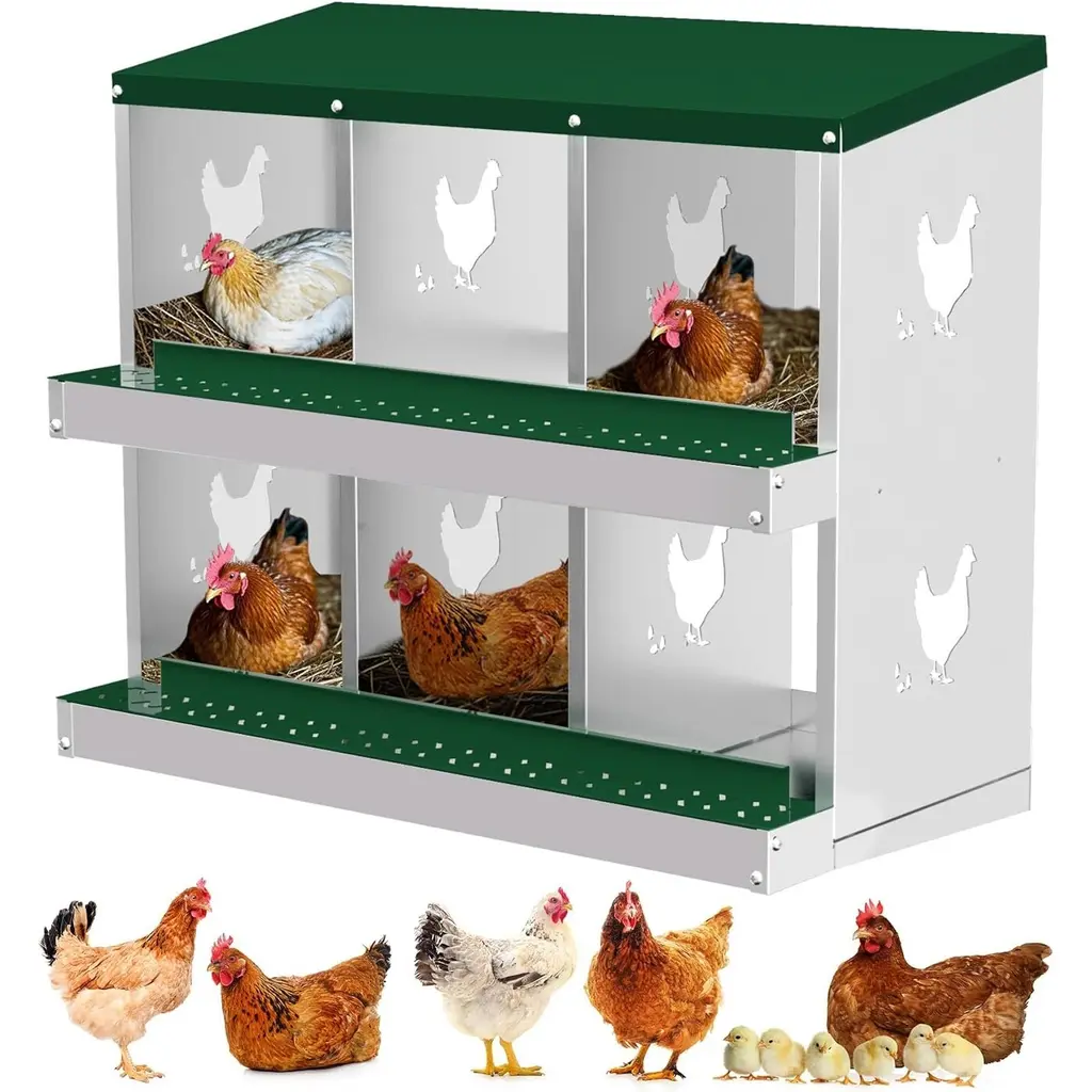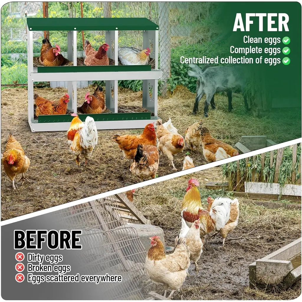 [INNOVATIVE EGG COLLECTION SYSTEM] Effortless Egg Safety: The chicken laying boxes features an innovative design with a gentle tilt that allows eggs to roll into a secure collection area, significantly reducing the breakage. This smart design promotes cleanliness in the nesting area, making egg collection a breeze. For added protection, consider placing padding under the lid your eggs further. [COMFORTABLE AND HEALTHY ENVIRONMENT] Enhancing Hen Welfare: Designed with the well of your hens in mind, our chicken nesting boxes provides ample space and strategically placed ventilation holes. This allows for optimal airflow, keeping the nesting area dry and cool. A good environment not only promotes comfort but also enhances egg production, ensuring your hens are happy and productive. With these features, you can create the ideal setting for your poultry to thrive. [DURABILITY AND CONSTRUCTION] Built to Last: Our chicken nesting box is meticulously crafted from heavy-duty galvanized steel, ensuring it withstands the rigors of outdoor conditions. Unlike flimsy plastic options that can wear out quickly, this robust design is resistant to rust, providing a stable and secure environment for your poultry. With this nesting box, you can invest in a long-term solution for your chickens and other fowl [VERSATILE USE FOR MULTIPLE POULTRY TYPES] An Essential Addition to Your Farm: The nesting boxes is not only perfect for chickens but is also adaptable for ducks, geese, and even rabbits. Whether you are a hobby farmer or managing a larger poultry operation, this heavy-duty metal coop features roll-away egg collection, a perch, and a lid cover for added egg protection. It is an essential tool for creating a sustainable and efficient farm setup, catering to a variety of poultry needs [SIMPLE INSTALLATION WITH FLEXIBLE OPTIONS] Quick and Easy Setup: Our nesting boxes for chickens comes with all the necessary screws and nuts, along with clear, step-by-step instructions that make installation a straightforward process. Whether you choose to mount it on the wall, use the high feet for elevated placement, or set it directly on the ground, the versatile installation options allow you to customize the setup to best fit your poultry environment.