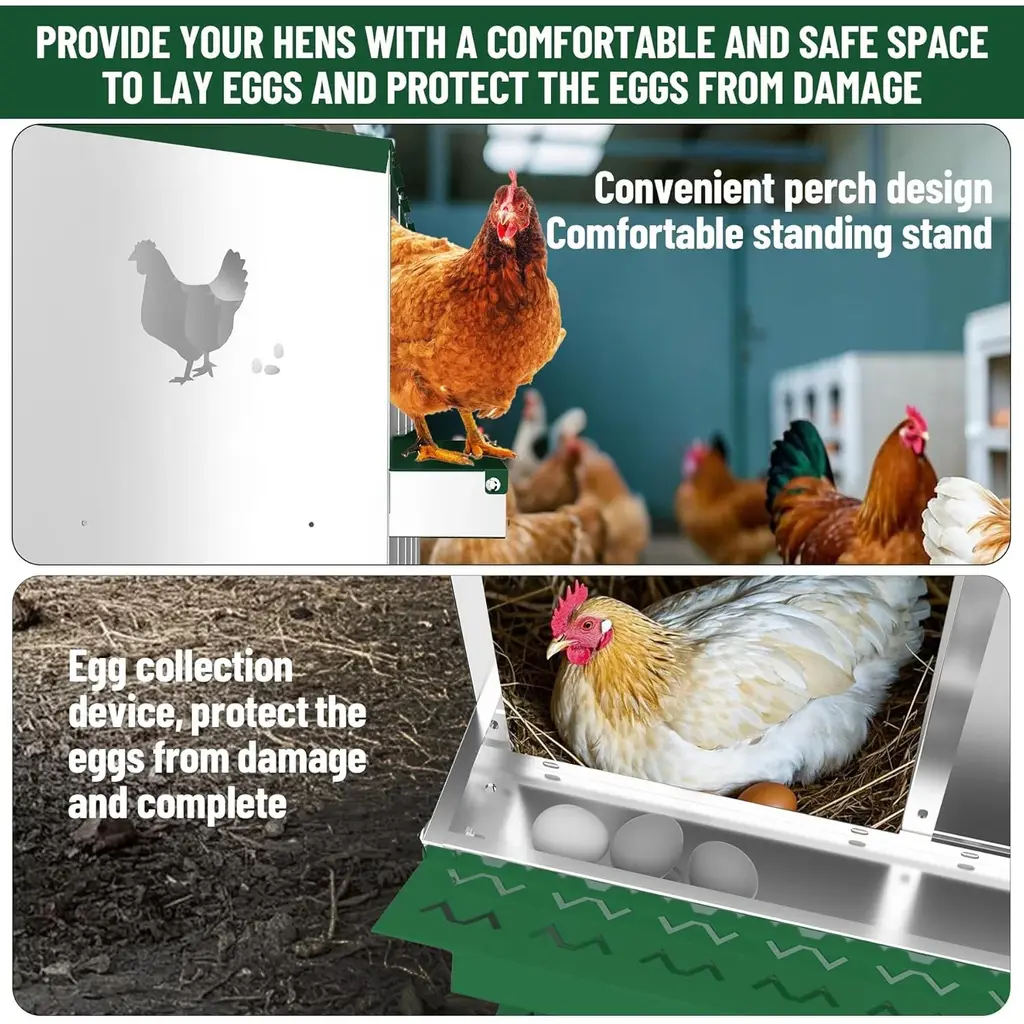[INNOVATIVE EGG COLLECTION SYSTEM] Effortless Egg Safety: The chicken laying boxes features an innovative design with a gentle tilt that allows eggs to roll into a secure collection area, significantly reducing the breakage. This smart design promotes cleanliness in the nesting area, making egg collection a breeze. For added protection, consider placing padding under the lid your eggs further. [COMFORTABLE AND HEALTHY ENVIRONMENT] Enhancing Hen Welfare: Designed with the well of your hens in mind, our chicken nesting boxes provides ample space and strategically placed ventilation holes. This allows for optimal airflow, keeping the nesting area dry and cool. A good environment not only promotes comfort but also enhances egg production, ensuring your hens are happy and productive. With these features, you can create the ideal setting for your poultry to thrive. [DURABILITY AND CONSTRUCTION] Built to Last: Our chicken nesting box is meticulously crafted from heavy-duty galvanized steel, ensuring it withstands the rigors of outdoor conditions. Unlike flimsy plastic options that can wear out quickly, this robust design is resistant to rust, providing a stable and secure environment for your poultry. With this nesting box, you can invest in a long-term solution for your chickens and other fowl [VERSATILE USE FOR MULTIPLE POULTRY TYPES] An Essential Addition to Your Farm: The nesting boxes is not only perfect for chickens but is also adaptable for ducks, geese, and even rabbits. Whether you are a hobby farmer or managing a larger poultry operation, this heavy-duty metal coop features roll-away egg collection, a perch, and a lid cover for added egg protection. It is an essential tool for creating a sustainable and efficient farm setup, catering to a variety of poultry needs [SIMPLE INSTALLATION WITH FLEXIBLE OPTIONS] Quick and Easy Setup: Our nesting boxes for chickens comes with all the necessary screws and nuts, along with clear, step-by-step instructions that make installation a straightforward process. Whether you choose to mount it on the wall, use the high feet for elevated placement, or set it directly on the ground, the versatile installation options allow you to customize the setup to best fit your poultry environment.