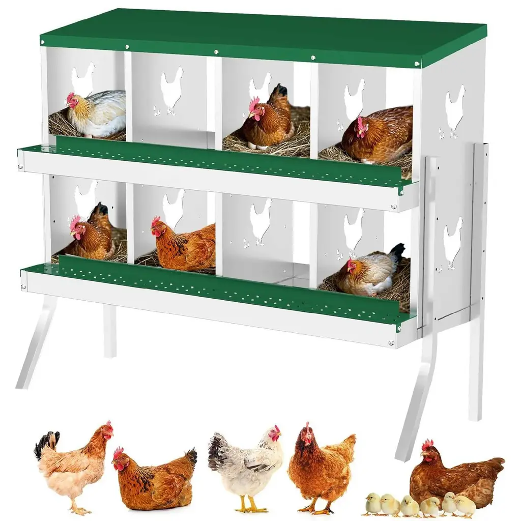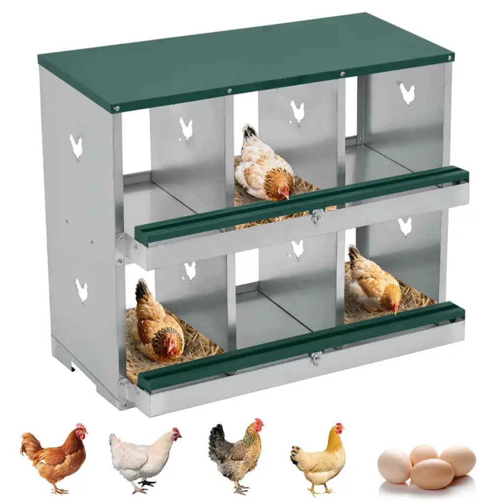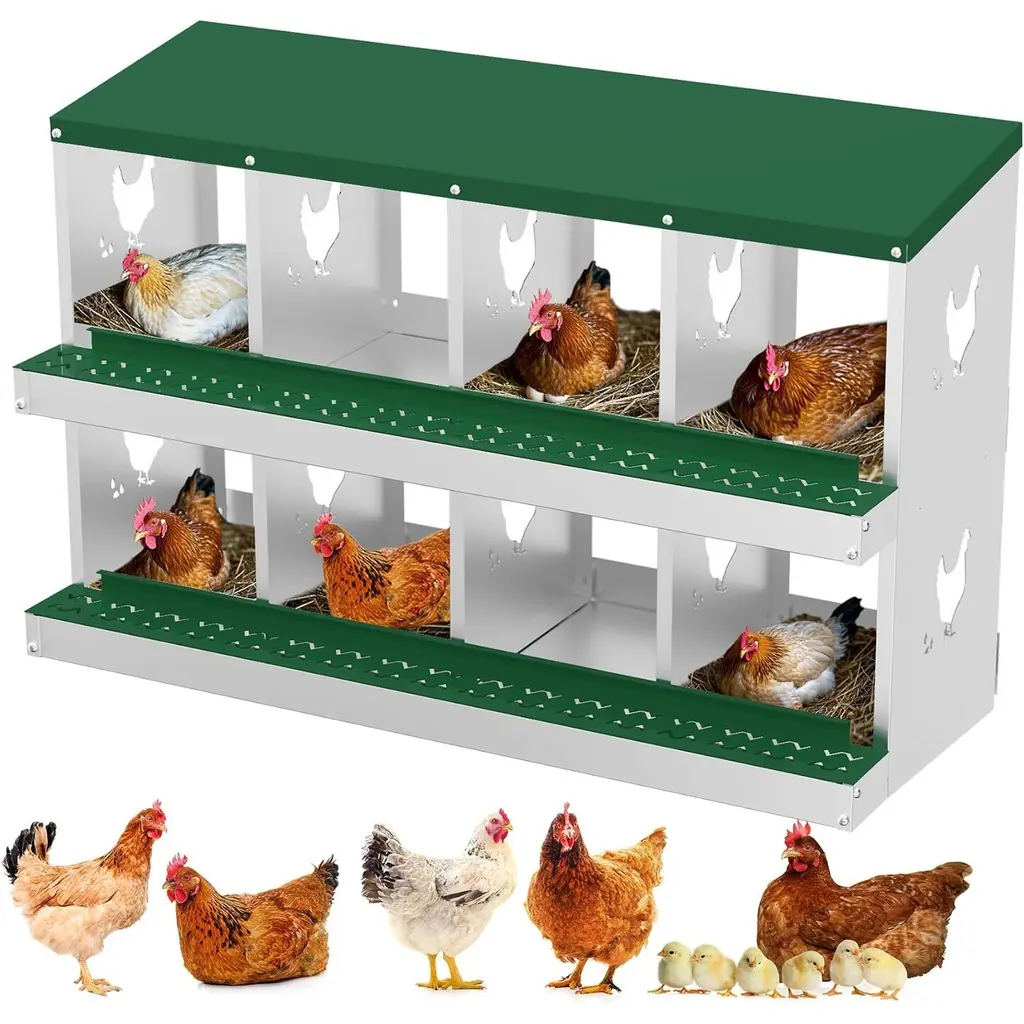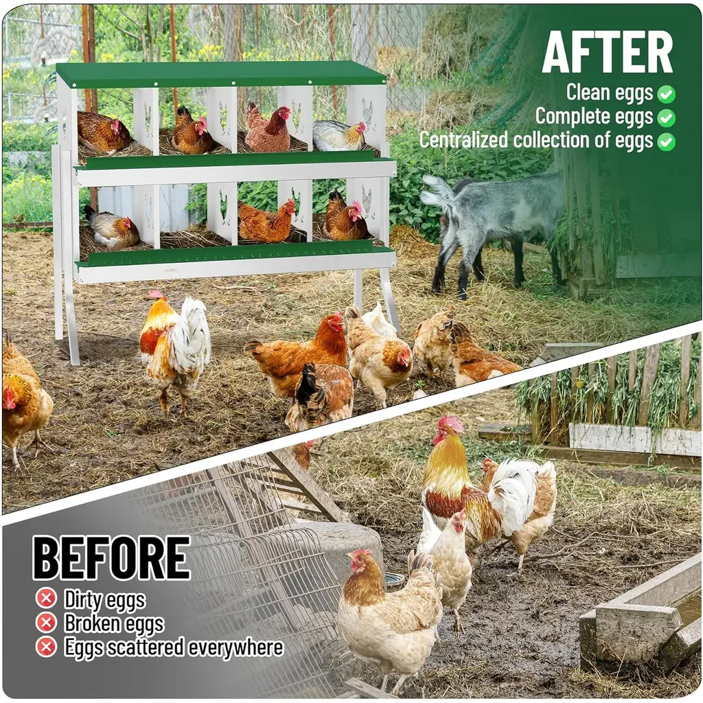 [INNOVATIVE EGG COLLECTION SYSTEM] Effortless Egg Safety: The chicken laying boxes features an innovative design with a gentle tilt that allows eggs to roll into a secure collection area, significantly reducing the breakage. This smart design promotes cleanliness in the nesting area, making egg collection a breeze. For added protection, consider placing padding under the lid your eggs further. [COMFORTABLE AND HEALTHY ENVIRONMENT] Enhancing Hen Welfare: Designed with the well of your hens in mind, our chicken nesting boxes provides ample space and strategically placed ventilation holes. This allows for optimal airflow, keeping the nesting area dry and cool. A good environment not only promotes comfort but also enhances egg production, ensuring your hens are happy and productive. With these features, you can create the ideal setting for your poultry to thrive. [DURABILITY AND CONSTRUCTION] Built to Last: Our chicken nesting box is meticulously crafted from heavy-duty galvanized steel, ensuring it withstands the rigors of outdoor conditions. Unlike flimsy plastic options that can wear out quickly, this robust design is resistant to rust, providing a stable and secure environment for your poultry. With this nesting box, you can invest in a long-term solution for your chickens and other fowl [VERSATILE USE FOR MULTIPLE POULTRY TYPES] An Essential Addition to Your Farm: The nesting boxes is not only perfect for chickens but is also adaptable for ducks, geese, and even rabbits. Whether you are a hobby farmer or managing a larger poultry operation, this heavy-duty metal coop features roll-away egg collection, a perch, and a lid cover for added egg protection. It is an essential tool for creating a sustainable and efficient farm setup, catering to a variety of poultry needs [SIMPLE INSTALLATION WITH FLEXIBLE OPTIONS] Quick and Easy Setup: Our nesting boxes for chickens comes with all the necessary screws and nuts, along with clear, step-by-step instructions that make installation a straightforward process. Whether you choose to mount it on the wall, use the high feet for elevated placement, or set it directly on the ground, the versatile installation options allow you to customize the setup to best fit your poultry environment.