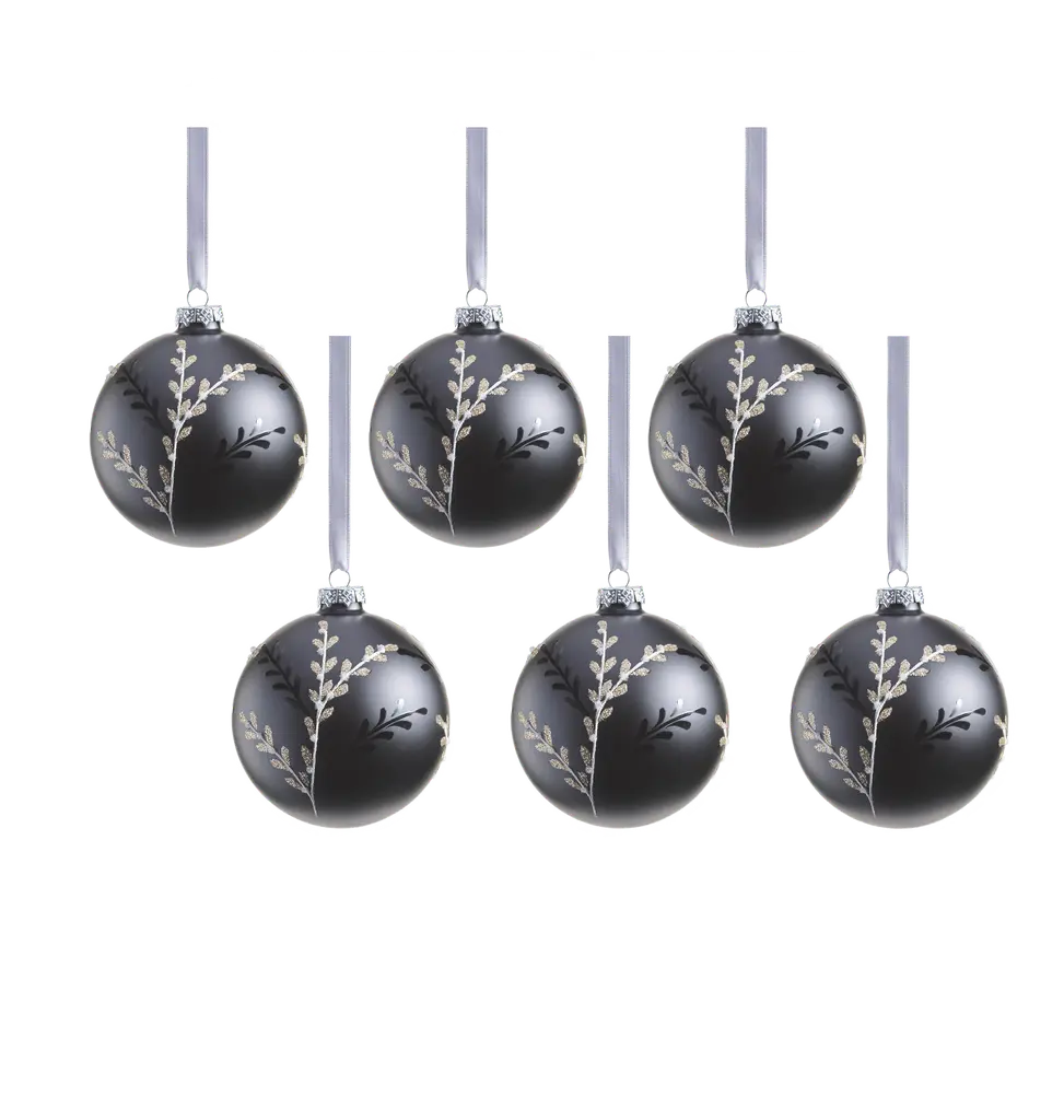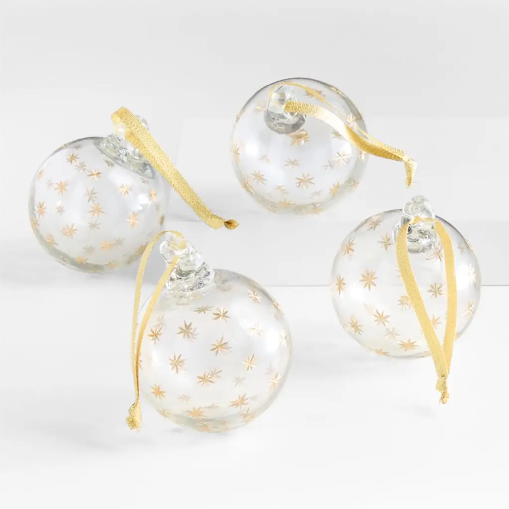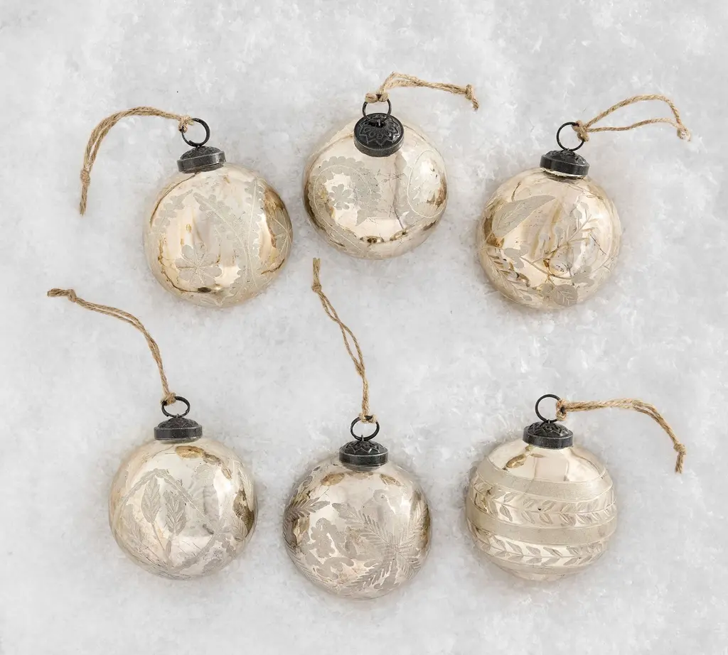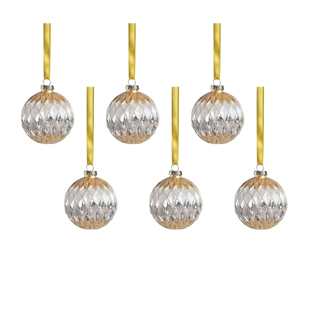 A flurry of snowflakes gilds this ornament set with wintry wonder. Clear and silver glass shape the six spheres, each etched with a variety of intricate golden flakes and adorned with gleaming caps and ribbons. We love the modern mixed-materials look this set creates on the Christmas tree.