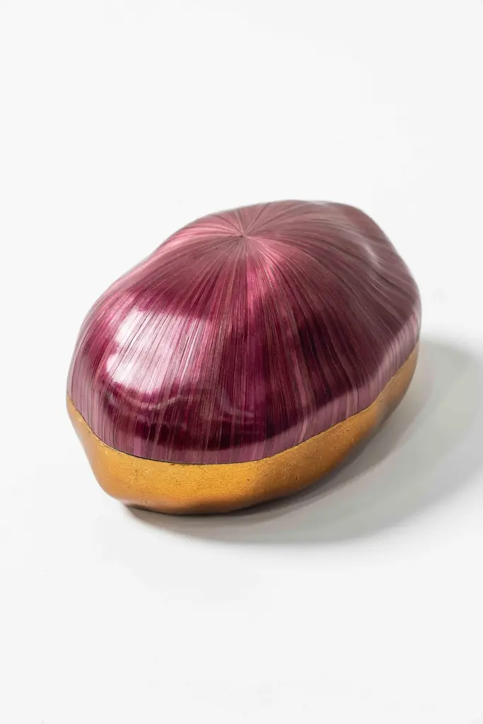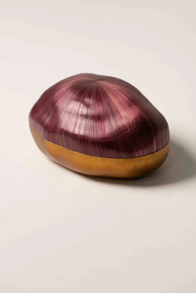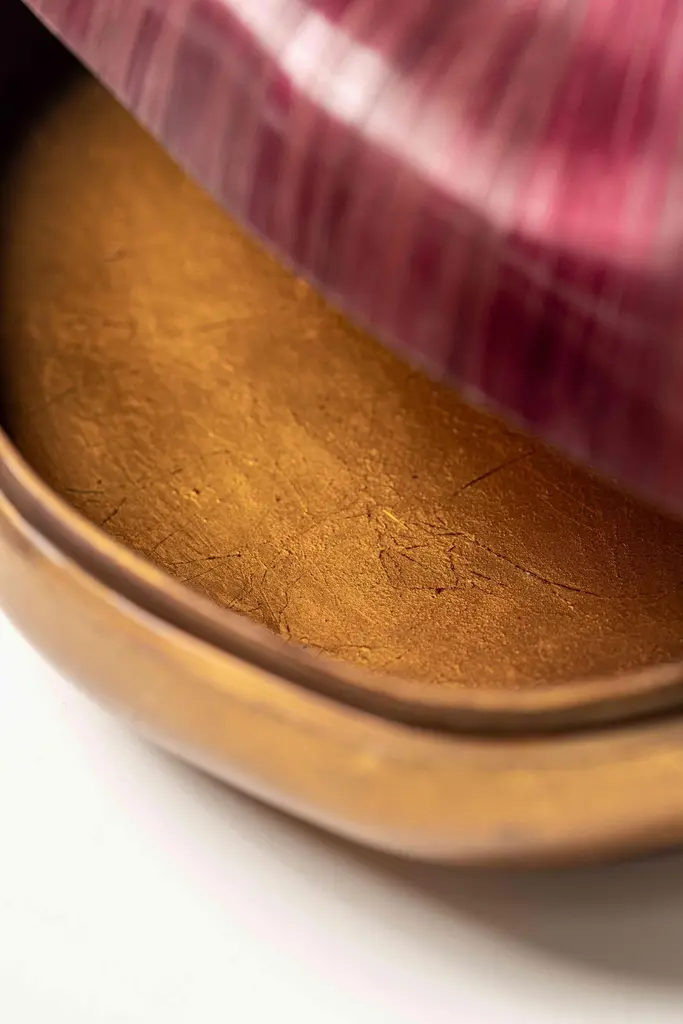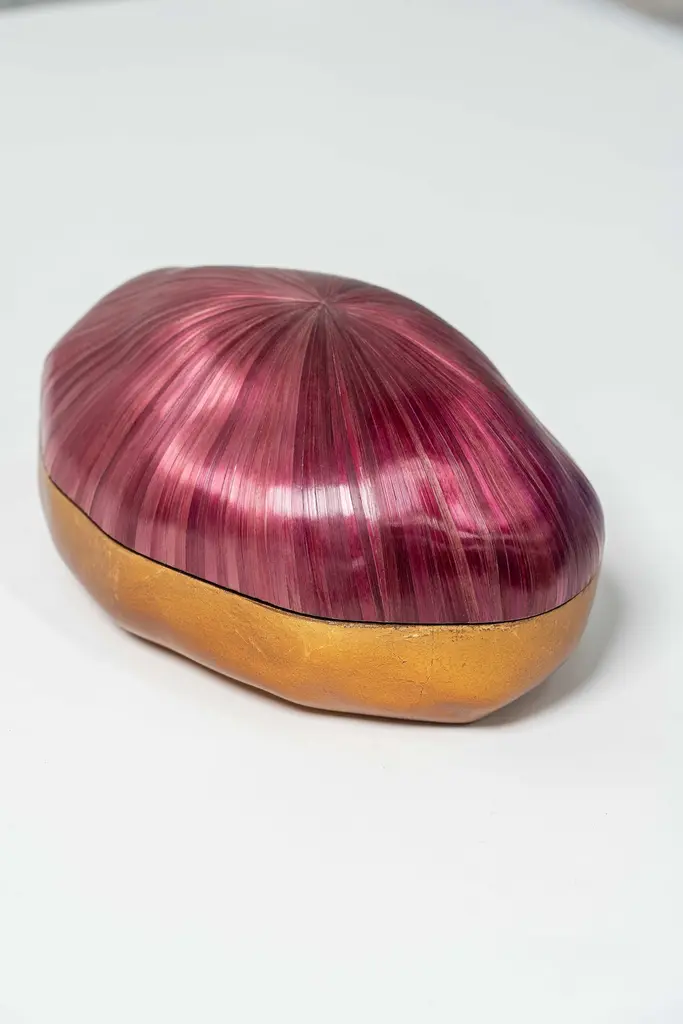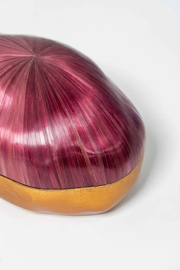 A gleaming maroon straw marquetry box with a gold foiled base. Compact, refined and irresistibly cosmic in its allure. The finishes, colours, size can be customised according to specifications. Finest quality straw sourced from France and handcrafted by skilled Indian artisans. The brand reimagines 'Marqueterie de Paille' or French Straw Marquetry. Scarlet Splendour’s straw marquetry reinterprets this historic craft. Experience a modern take on a centuries-old tradition, where artistry and innovation converge. Unrealism by Scarlet Splendour is a 21st-century art form, imagined by the Co-Founders, Ashish and Suman. It immerses the meditative mind into a surreal universe of vibrant colours and fluidity. Transcending the constraints of structure. This trance-like experience echoes the ancient practice of deep meditation. Influencing notions of divine human potential and an elevated existence. Inspired by the mastery of artisans who wove rye stalks into intricate designs,