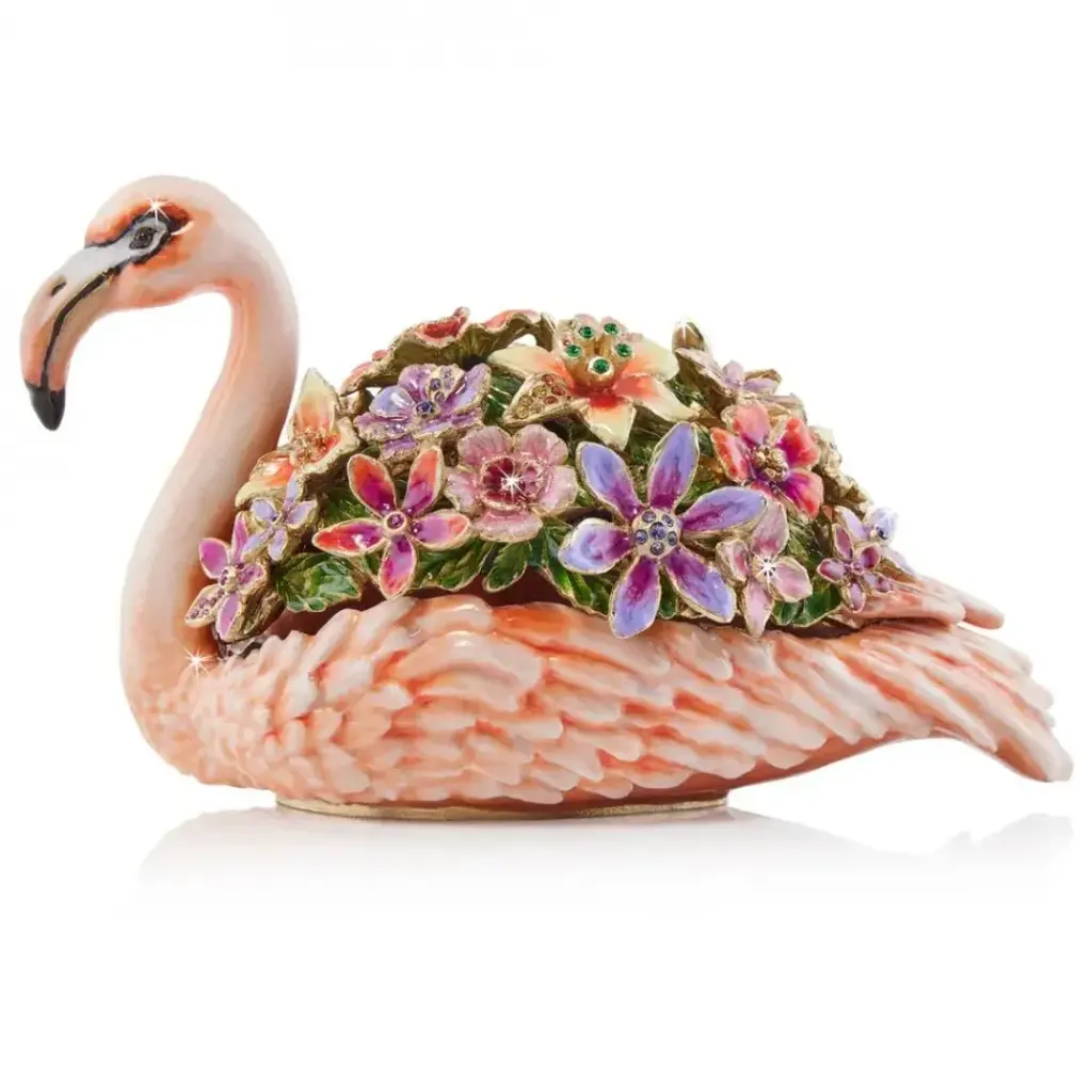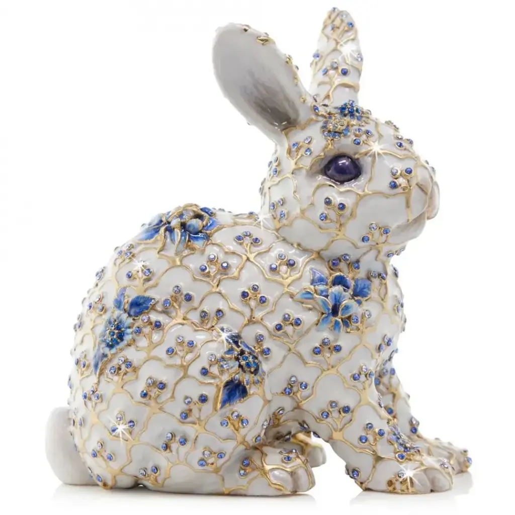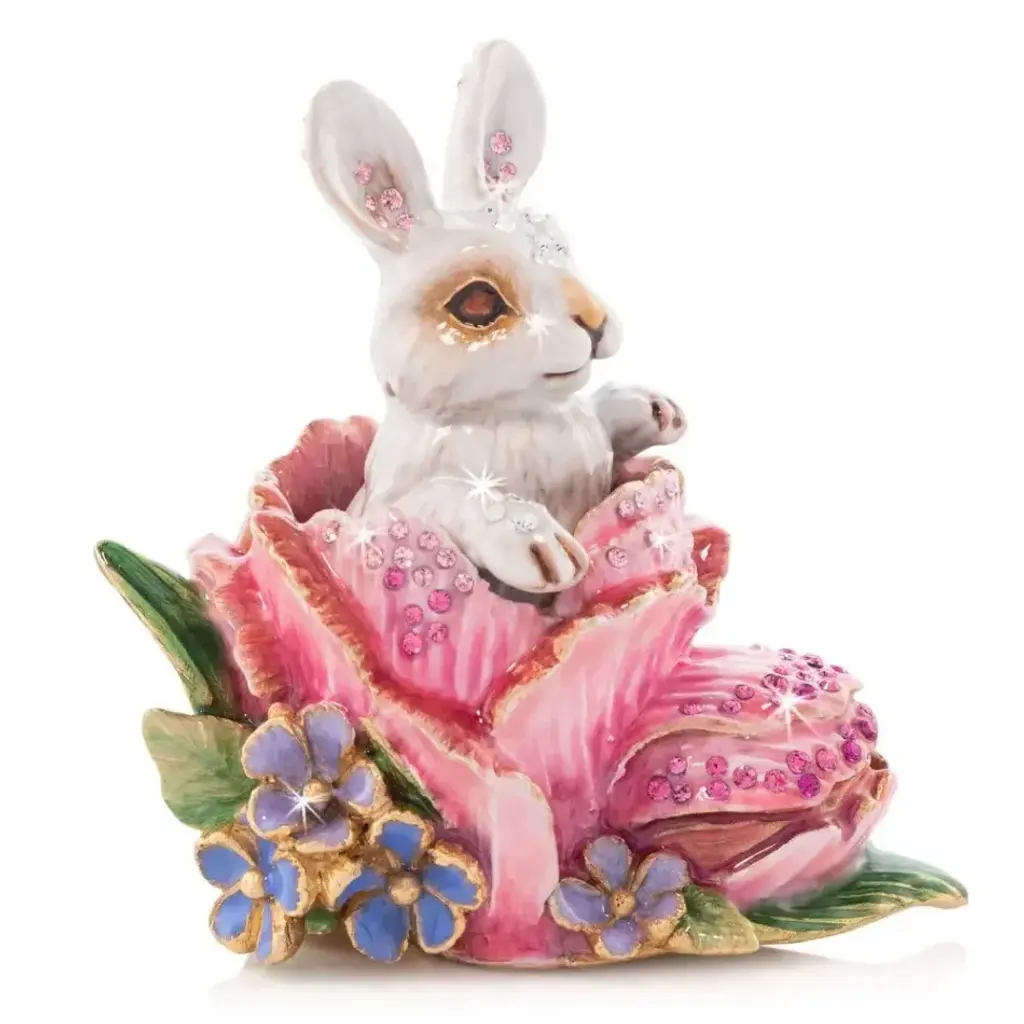 Sitting gracefully amongst perfectly parted pink tulip petals, our friendly rabbit is watching over your treasured keepsakes. This bunny box is a must have for any Jay Strongwater collector.