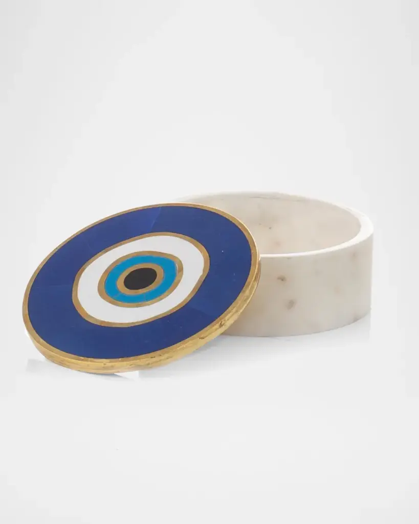 Handcrafted round marble box. Natural brass lid with evil eye inlay. 4.5"Dia. x 1.75"T. Imported. About Michael Aram: American artist Michael Aram studied art in New York in the late 1980s before traveling to India on an inspirational journey, where he discovered a rich metalworking tradition that inspired his turn toward handcrafted design. Michael Aram established a home and workshop in New Delhi, where he began crafting objects ranging from tableware to furniture, all of which reflect the hand of the artisan. The tension of line, form, and meaning is a distinguishing characteristic of Aram's extraordinary designs, inspiring thoughtful appreciation and bringing a sense of ceremony in their day-to-day use. Each Michael Aram piece is handmade, so no two items are exactly alike.
