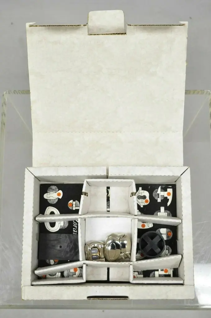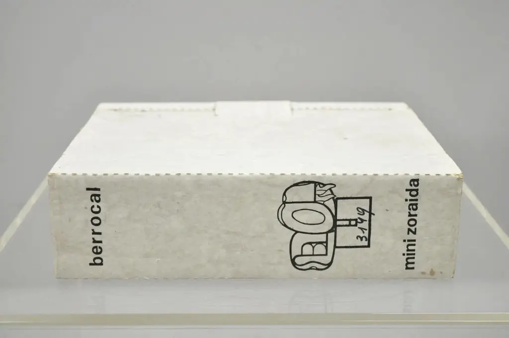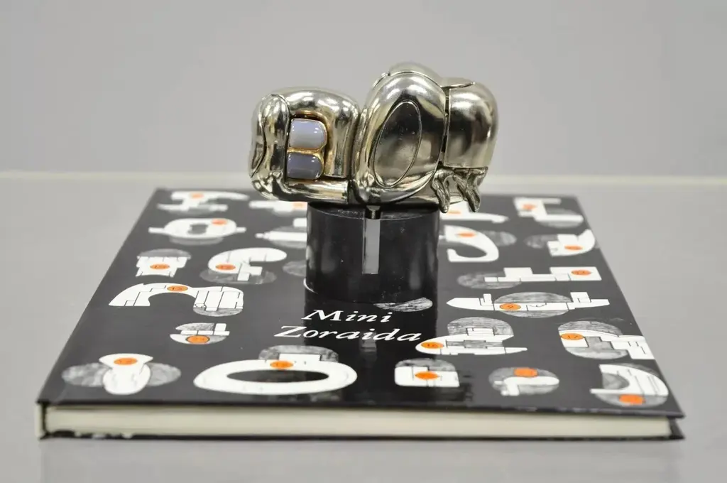 Vintage Miguel Berrocal La Mini Zoraida Nickel Plated Puzzle Sculpture with Box and Book. Includes puzzle sculpture, stand, original box, book, and packaging. ***Serial number and jewel color may vary. Quantity of sculptures available***. Circa Mid 20th Century. Measurements: Figure: 2" H x 3" W x 1.5" D. Box: 3" H x 11" W x 9" D.