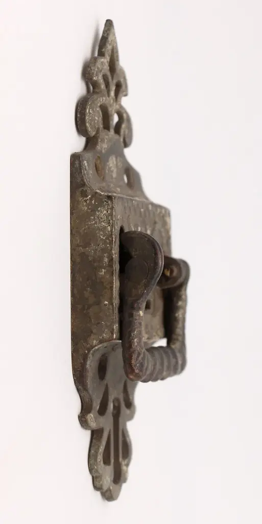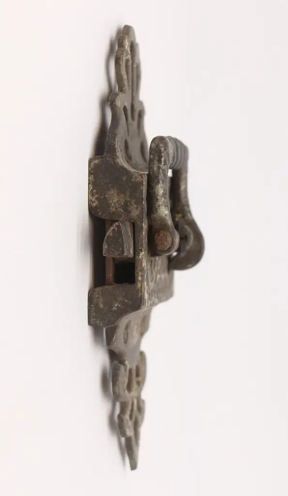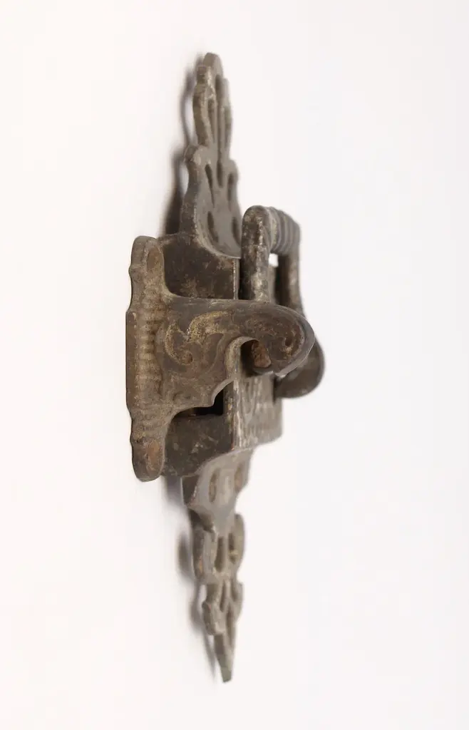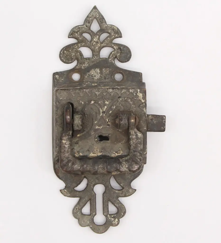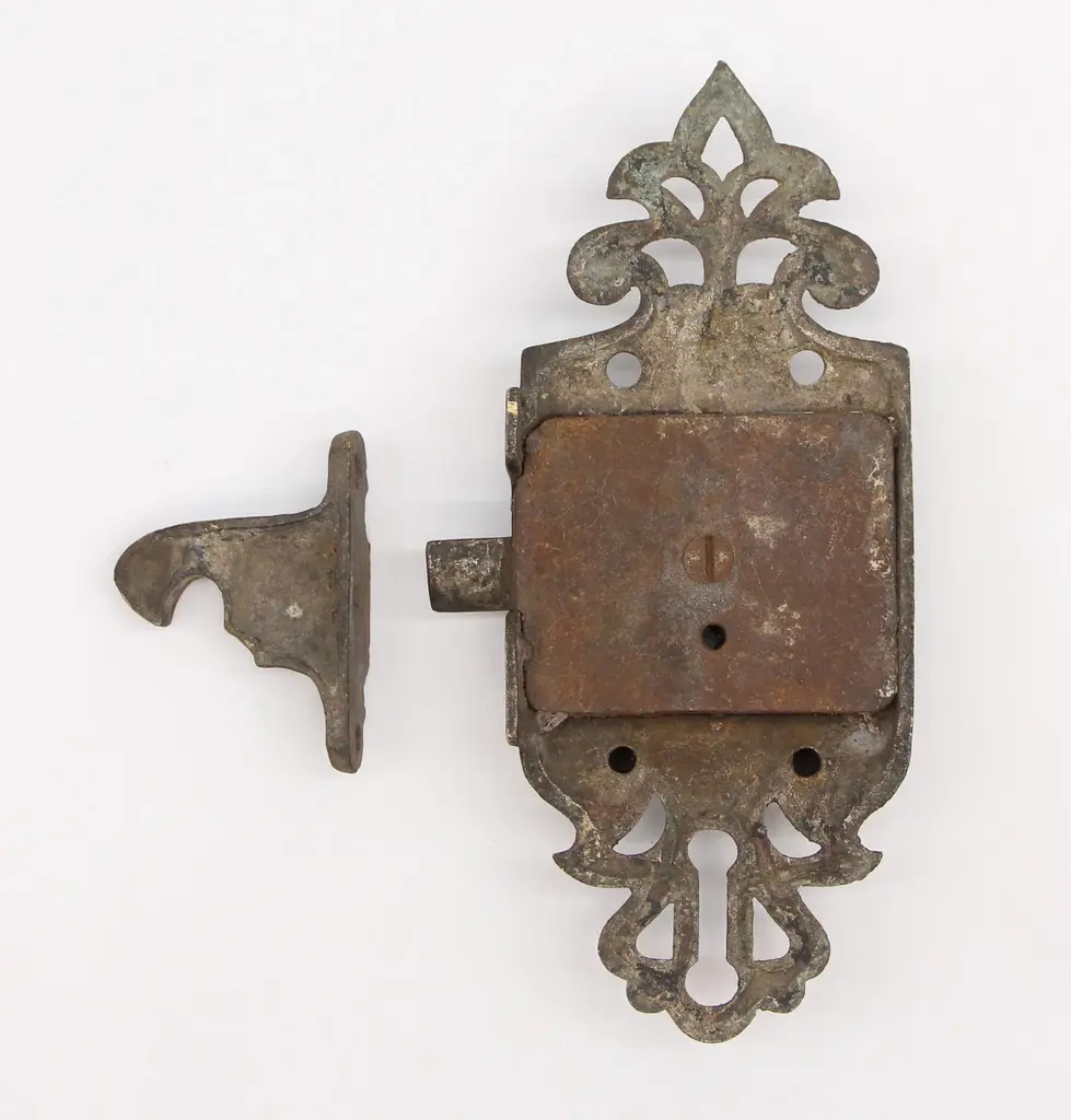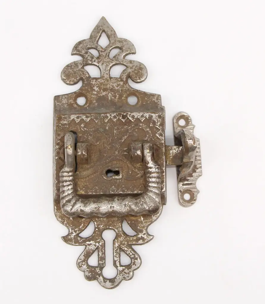 Left swing ice box latch with ornate details. Patinas vary. The original mounting screws are not available. Good condition with surface wear from prior use. Priced each. FINISHES VARY-Please see the photos. The manufacturer and exact date of creation are unknown. The dimensions are Latch 6.5 in. L x 2.625 in. W x 1.25 in. D, catch 2.25 in. L x 1.75 in. D x 0.625 in. W.