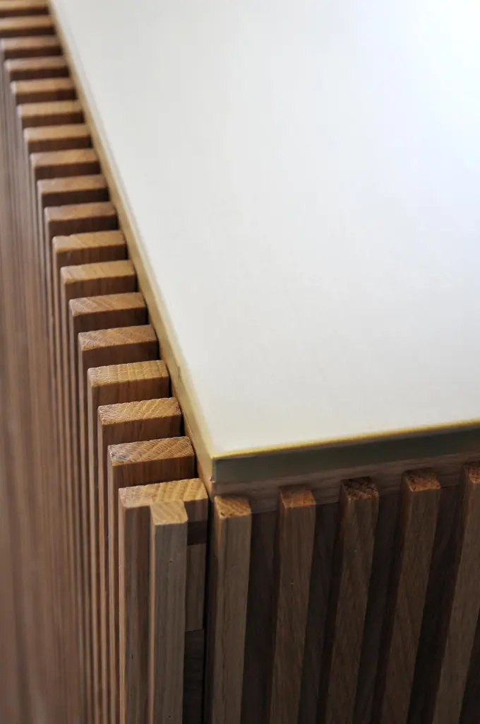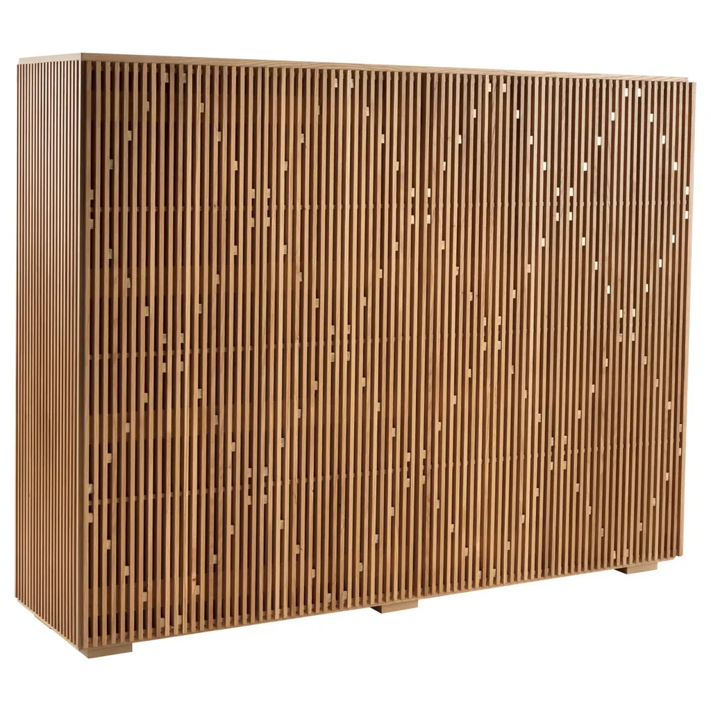Inspired by Marco Polo’s famous travel tales, Il Milione, which recounts Venice’s encounter with the East, this collection by Debonademeo for Medulum captures the profound cultural exchange between two civilizations. Venice, the gateway to the Orient, was transformed by the introduction of exotic fabrics, carpets, and embroideries that influenced its architecture, applied arts, and craftsmanship. This blend of cultures is reflected in the collection of essential storage containers, featuring wooden slats alternating with brass details—evoking the intricate weave of warp and weft found in fine textiles. Made from wood particleboard veneered in oak, national walnut, or Canaletto walnut, with solid wood doors, brass accents, and optional glass shelves, the collection offers a refined balance of history, elegance, and functionality for modern interiors.