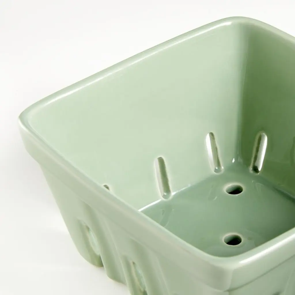 The classic farmers market berry box is reimagined in porcelain as a charming, functional kitchen accent. Fill the whimsical green piece with fresh blackberries, blueberries and raspberries for a sweet addition to the breakfast table. A Crate and Barrel exclusive, the berry basket is glazed in mint green and doubles as a colander for rinsing and straining berries.