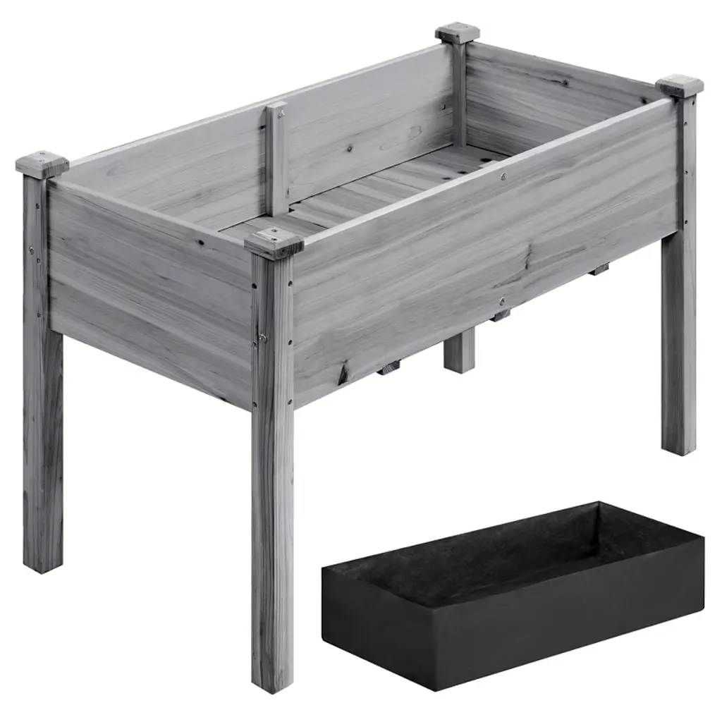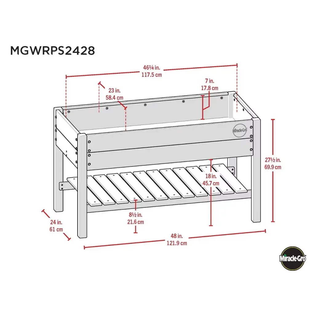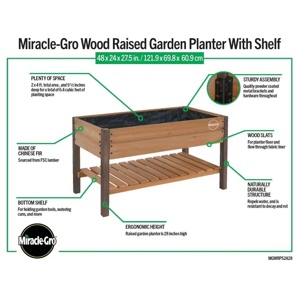 Bring a garden to your deck, patio, or backyard with a Miracle-Gro Wood 2 x 4 ft. Raised Garden Planter with Shelf. Made of Chinese Fir sourced from FSC lumber, this attractive raised garden planter is naturally durable, repels water, and is resistant to decay and rot. Quality hardware and powder coated metal brackets give stability to this 28-inch-tall planter, which has a 9 ½-inch deep bed. The floor of the bed is made of wood slats, and it includes a flow through plastic liner.