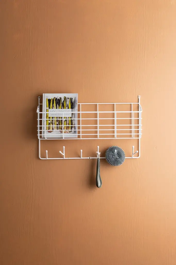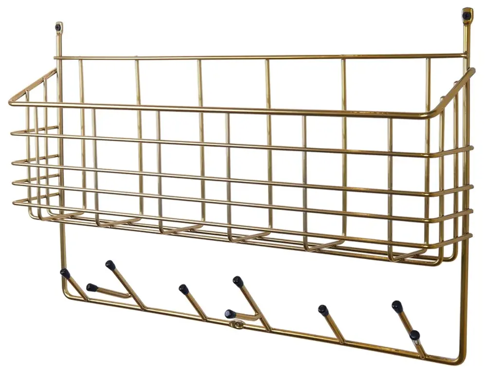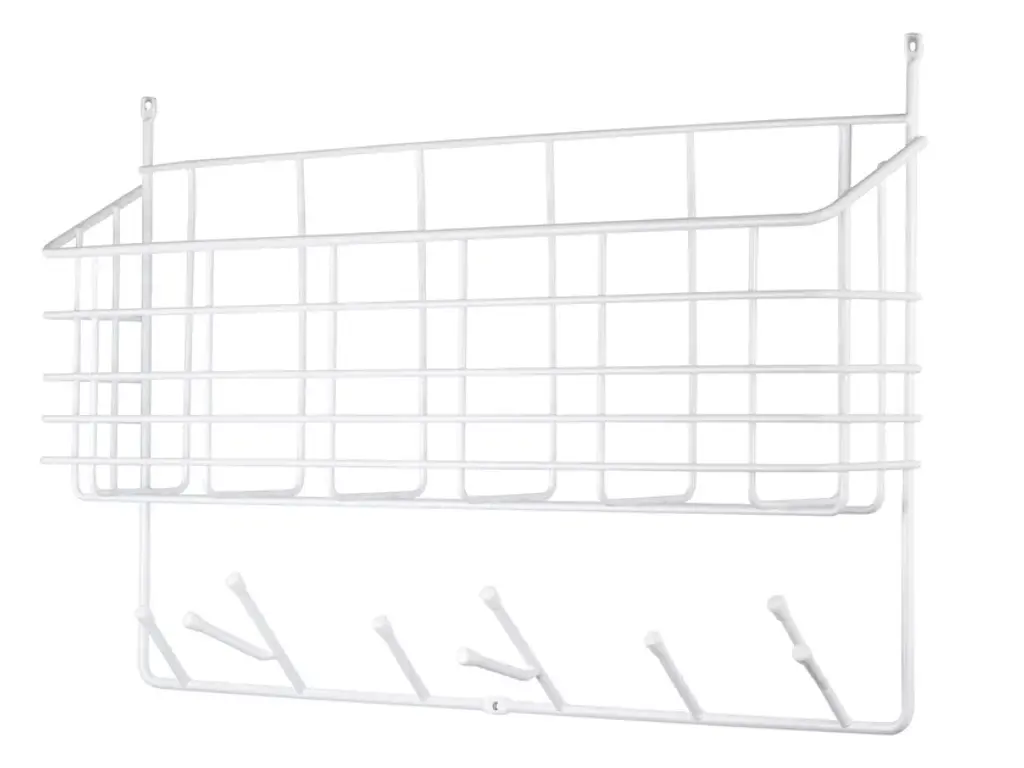 Mitten shelf is an highly practical wall mounted basket with hooks. Made of recycled metal, produced in the Swedish forests. Material: Powder coated metal wireManufactured: SwedenColors: white, black, brass matte Classic is a signature collection made to fit in everyone’s home, no matter the size of it. Made from recycled metal that will last many years, it's a really good investment.Slow Production in Classic: The Classic collection is made of recycled powder coated metal wire. The products are simple yet functional to create a timeless design that future generations will ask to inherit.