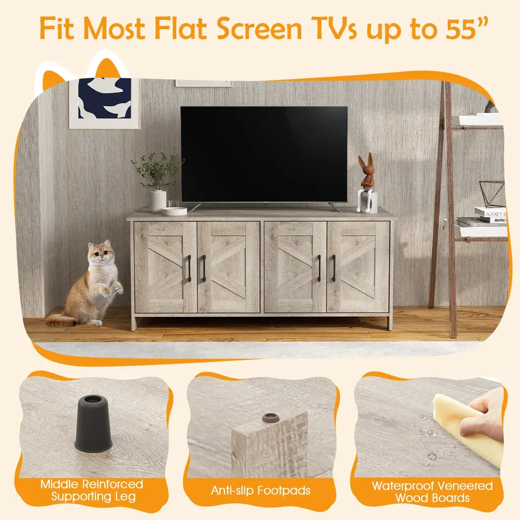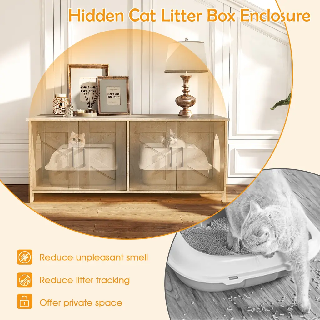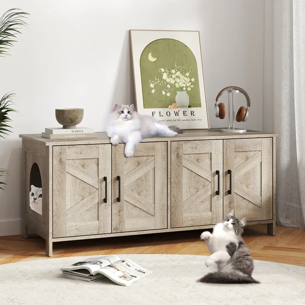 Specification:Key Features: Description: This modern cat litter box enclosure offers a stylish and functional solution for homes with multiple cats. With a spacious double-room design, it accommodates two litter boxes or a litter box and a cat bed, providing a private and secure space for your pets. The multifunctional furniture also doubles as a TV stand, storage cabinet, or end table, adding versatility to any room. Crafted from durable engineered wood and MDF, it features a rustic oak or white finish and a unique barn door design to complement your home decor. Its sturdy structure, anti-slip footpads, and easy-to-clean surfaces ensure long-lasting performance.