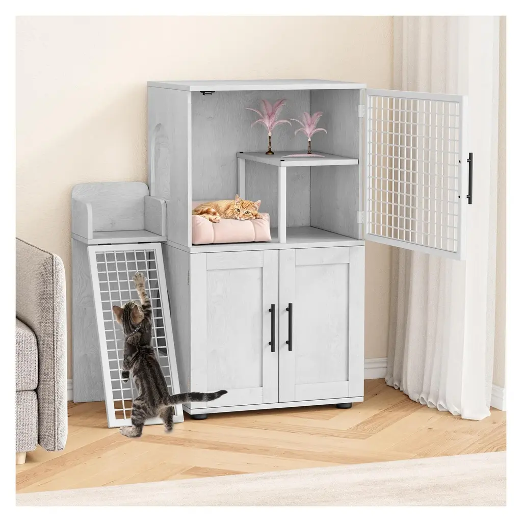 Stylish Cat Litter Box: This cat litter box stands out with its modern and stylish design, transforming an essential pet item into a chic piece of furniture. The spacious tabletop area provides a comfortable resting spot for your cat while also serving as an attractive decorative surface for your home. Easy-Cleaning & Odor-Free: The hidden litter box design offers your cat a private space to use the bathroom, effectively containing messes and odors. This feature keeps litter and waste concealed, preventing unpleasant smells and keeping your living area clean and tidy. Overall Dimensions: The litter box measures 33.8" L x 19.6" D x 24.2" H (including 1.9" legs), with an inner space of 23" L x 19" W x 16" H. The entrance size is 8.6" W x 13.6" H, providing ample space for comfortable access while maintaining a discreet enclosure. Simple Assembly: The cat litter box furniture comes with clear installation instructions and all necessary tools, ensuring a straightforward assembly process. You can easily put it together quickly and efficiently, allowing you to set it up without hassle. Weight Limit: This hidden cat litter box is designed for cats weighing up to 11 lbs, making it suitable for most small to medium-sized cats. However, it is important to note that it is not designed for larger breeds such as Maine Coons, ensuring the best fit for your feline friend.