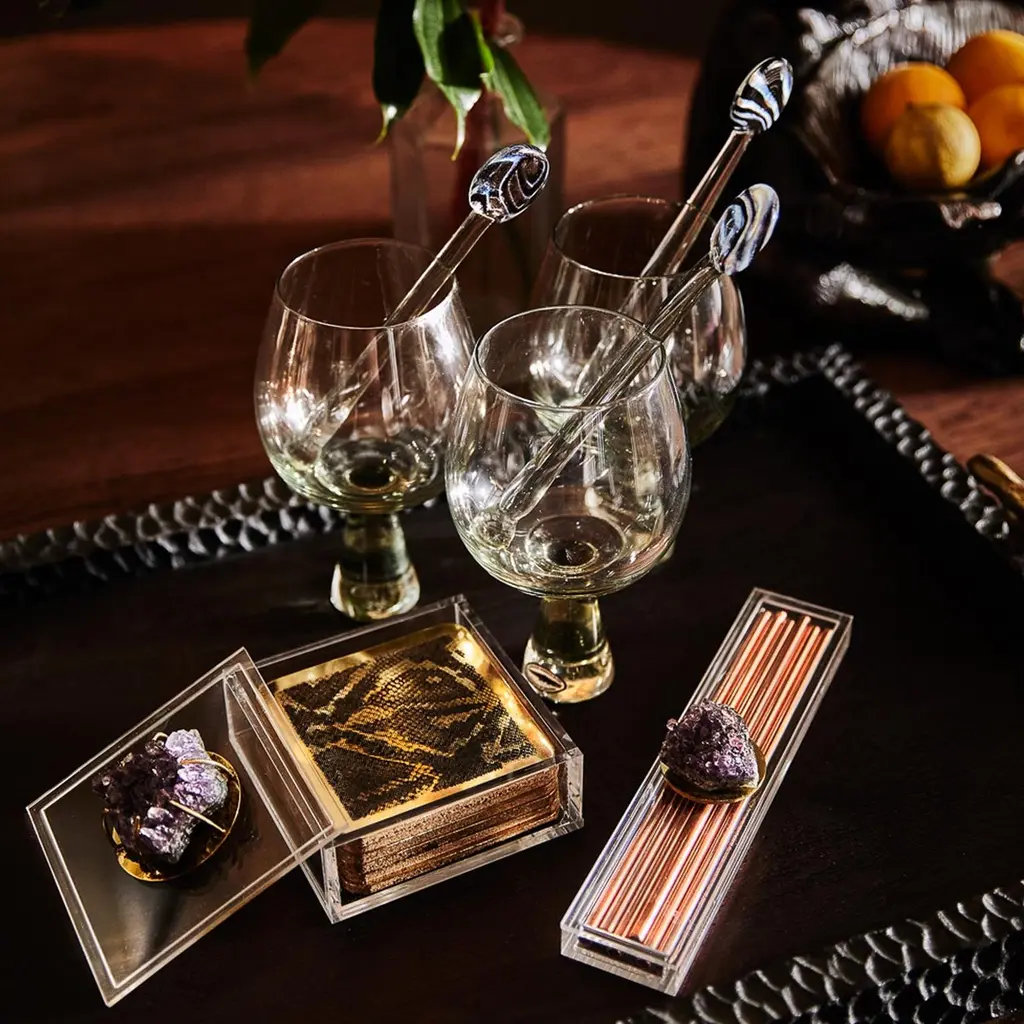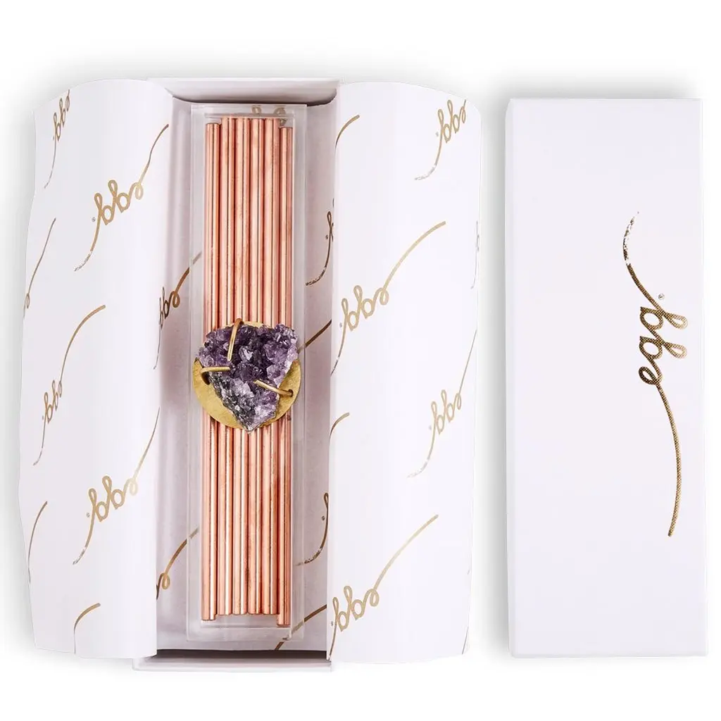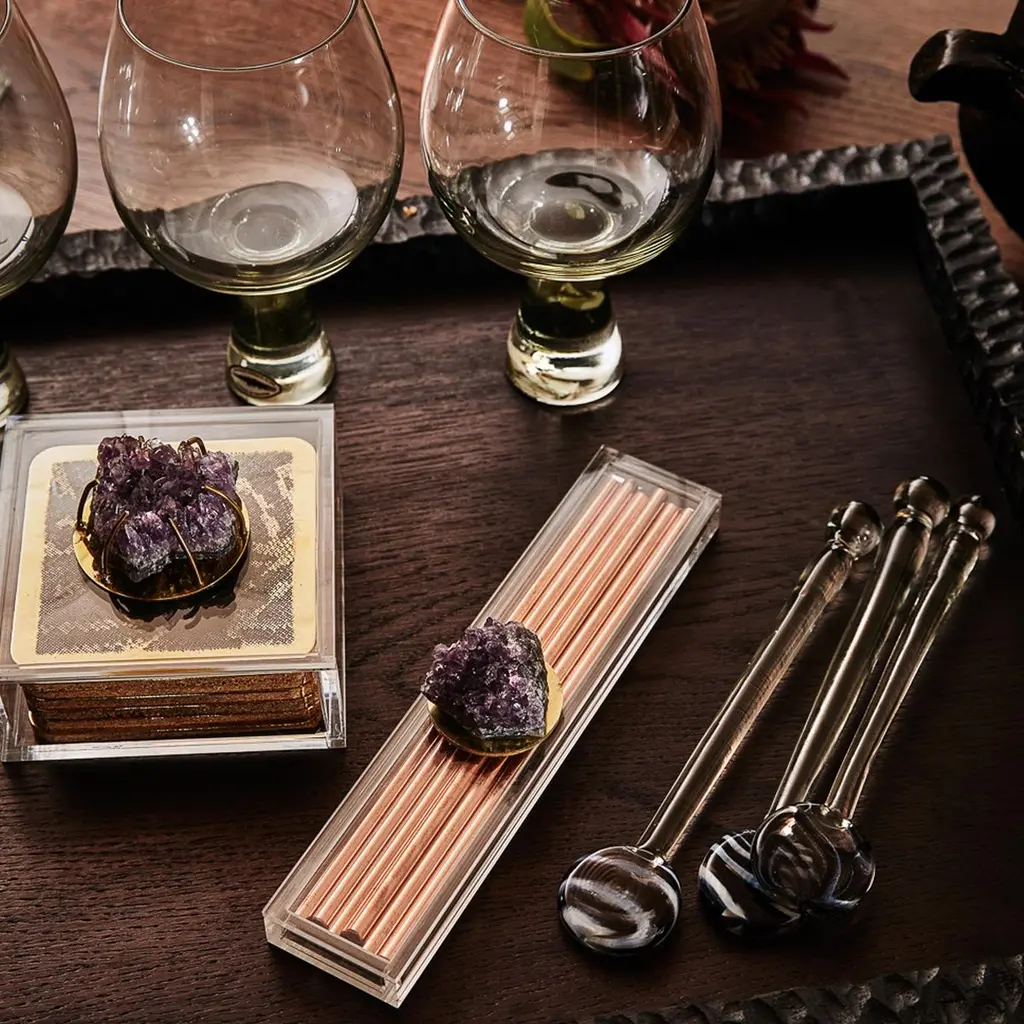 These modern copper straws are presented in a Lucite box decorated with a Rose Quartz Agate cabochon. This unique and bespoke copper straw set is part of the Egg Designs Dawa luxury bar set collection and will be a great addition to any home cocktail bar.There are six straws per box and each box is delivered with Egg Designs gift packaging which makes it the perfect luxury gift for any special occasion. The decorative boxes are also available with coasters to add to your bar collection.