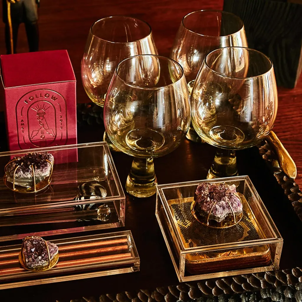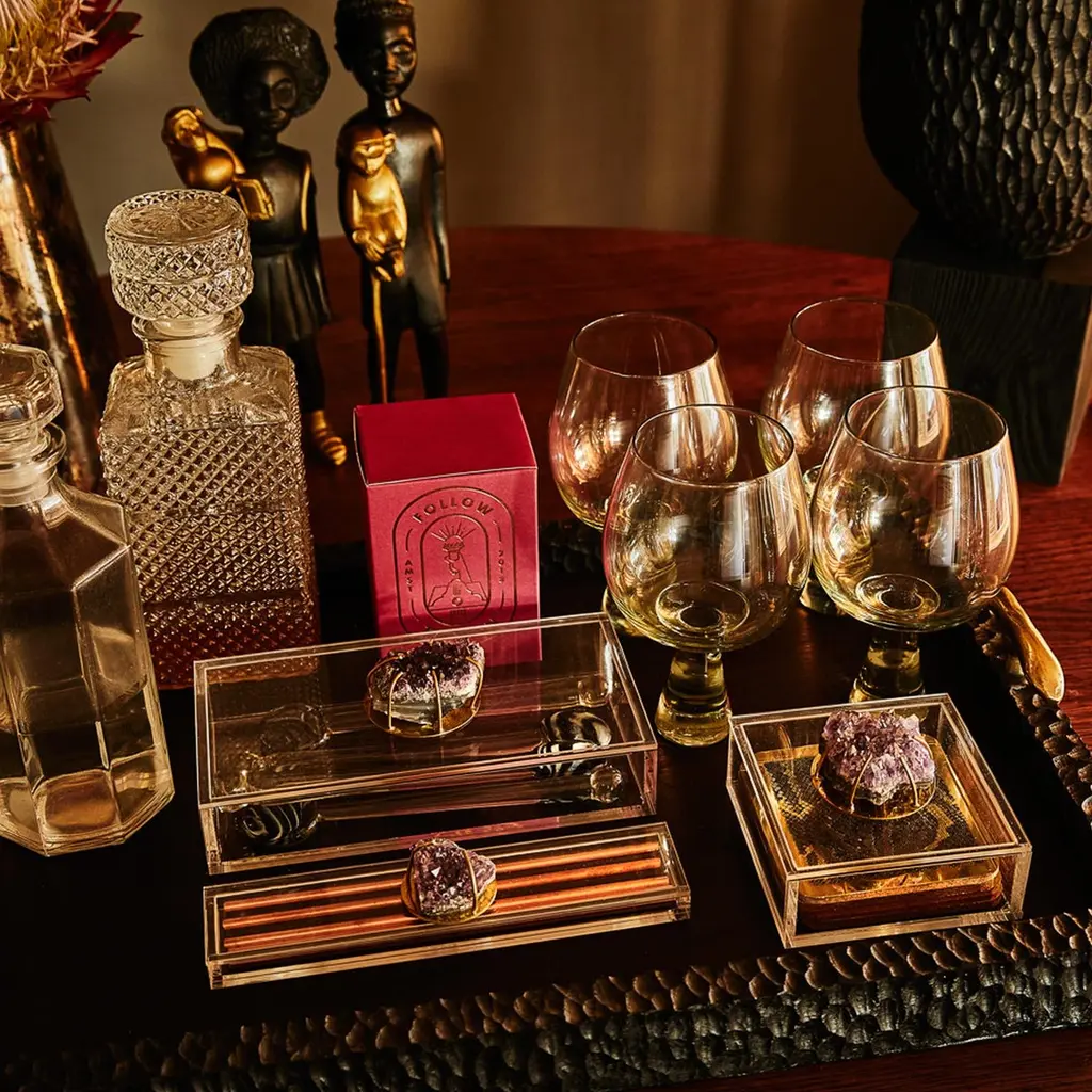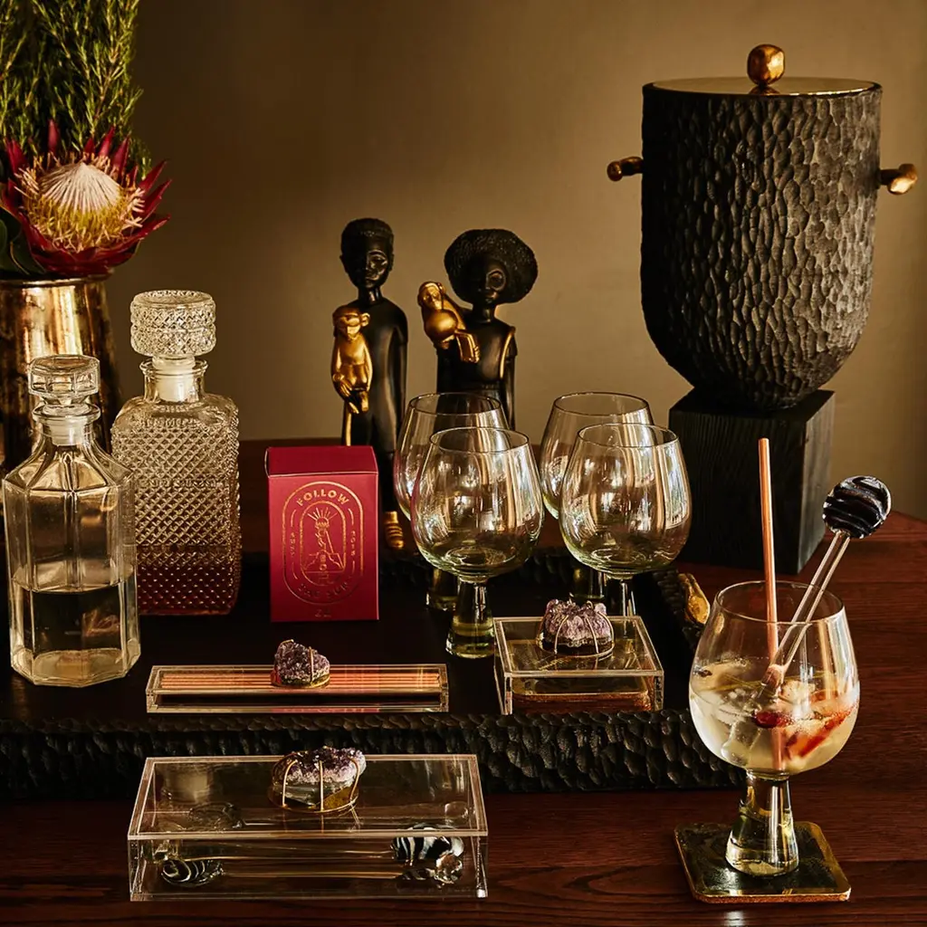 These modern copper straws are presented in a Lucite box decorated with a Rose Quartz Agate cabochon. This unique and bespoke copper straw set is part of the Egg Designs Dawa luxury bar set collection and will be a great addition to any home cocktail bar.There are six straws per box and each box is delivered with Egg Designs gift packaging which makes it the perfect luxury gift for any special occasion. The decorative boxes are also available with coasters to add to your bar collection.