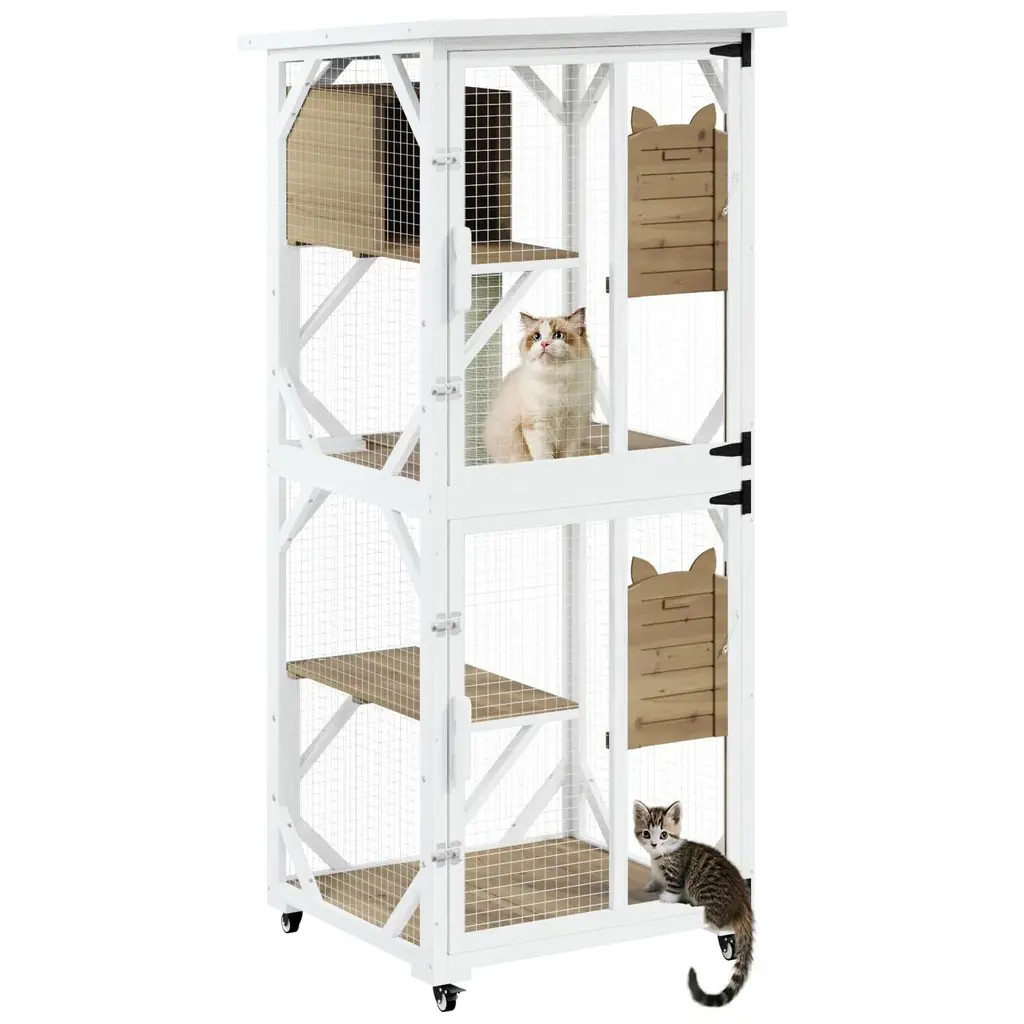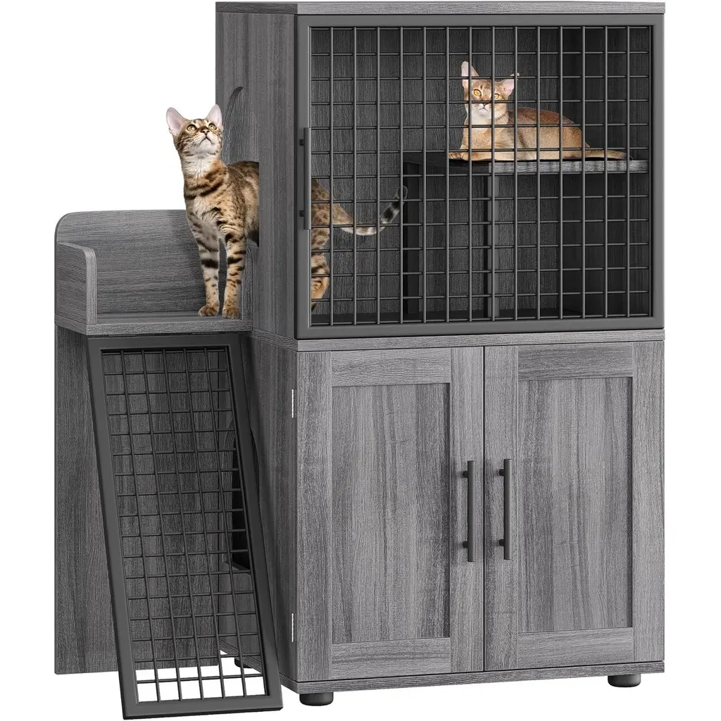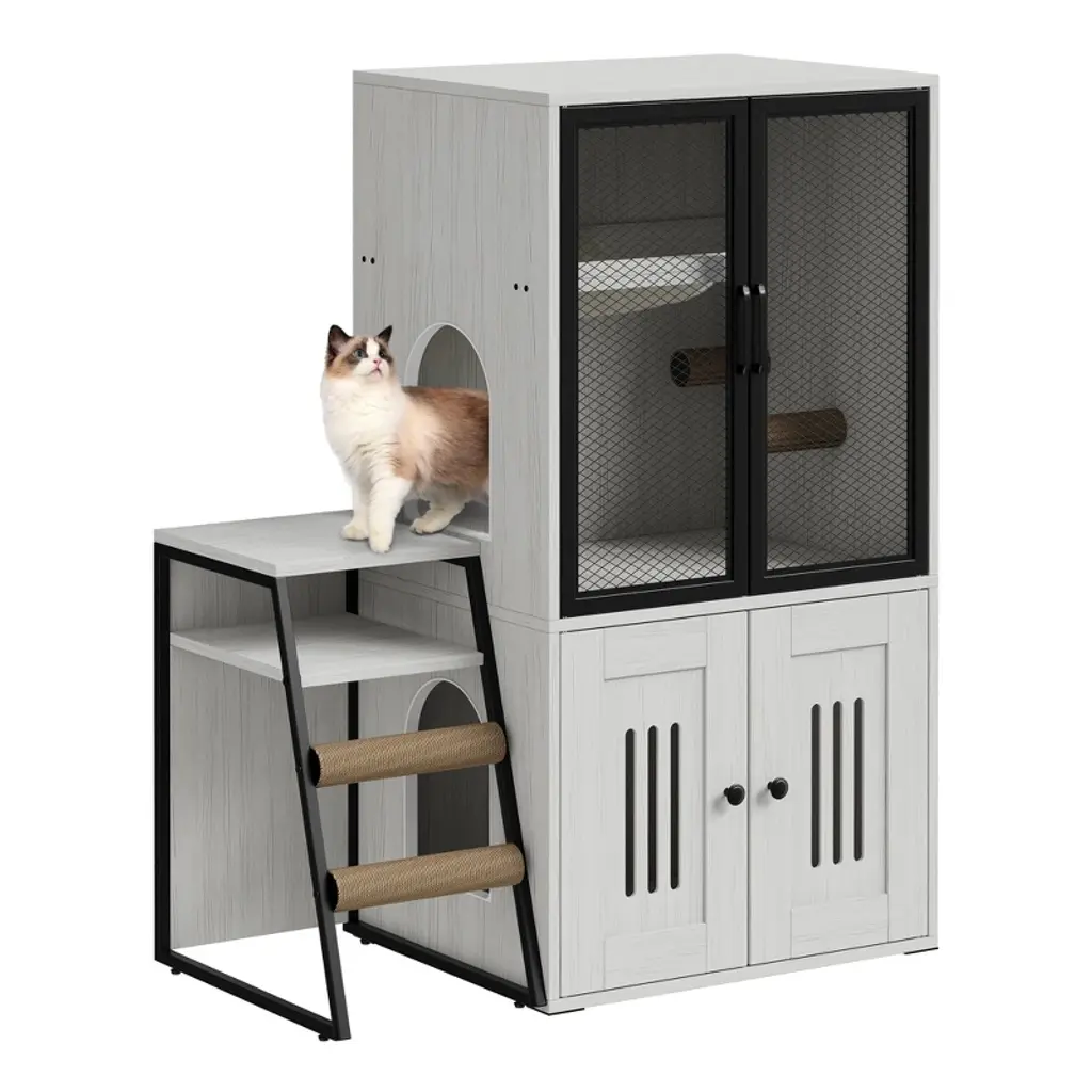 Ample Storage Space:This corner cabinet features adjustable concealed shelves on both the upper and lower levels, allowing for customizable height configurations to meet your unique storage needs and maximize capacity.Farmhouse Corner Cabinet Design:With its rustic barn door aesthetic, this cabinet adds a delightful vintage charm to your living room, bedroom, kitchen, or bathroom, infusing any space with a touch of rustic elegance.Secure Stability:Designed with a 90° right-angle structure, this corner pantry cabinet fits perfectly into the corners of two walls. Its sturdy base and anti-tip mechanism securely attach to the wall, enhancing safety and stability.Waterproof Material:Crafted with a waterproof finish and rustproof coating, these bathroom corner cabinets are built to withstand various indoor environments. They're designed for easy cleaning and maintenance, making them ideal for bathrooms and kitchens.Easy Assembly & Exceptional Customer Service:Our wooden corner cabinet comes with detailed instructions and numbered components for hassle-free assembly. Should you have any questions or concerns, our dedicated customer service team is ready to assist you.Introducing the Modern Villa Cat Litter Box Enclosure, a stylish and multifunctional addition to your home that seamlessly blends convenience with aesthetic appeal. This innovative design features a private litter box compartment and a cozy resting area, making it a perfect retreat for your feline friend. With a climbing ladder and spacious playground, your cat can enjoy playtime and relaxation in a safe and secure environment. Constructed from sturdy MDF and high-quality iron, this cat house ensures stability and longevity while offering ventilation for your pet's comfort. Ideal for any room, it cleverly conceals litter box odors and clutter, enhancing your home's decor. Easy to assemble with clear instructions, the Villa Cat Litter Box Enclosure is the perfect solution for modern pet owners seeking style and functionality.