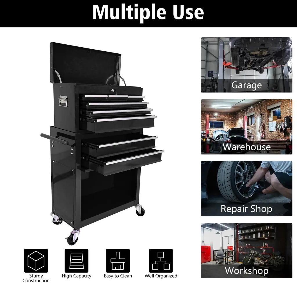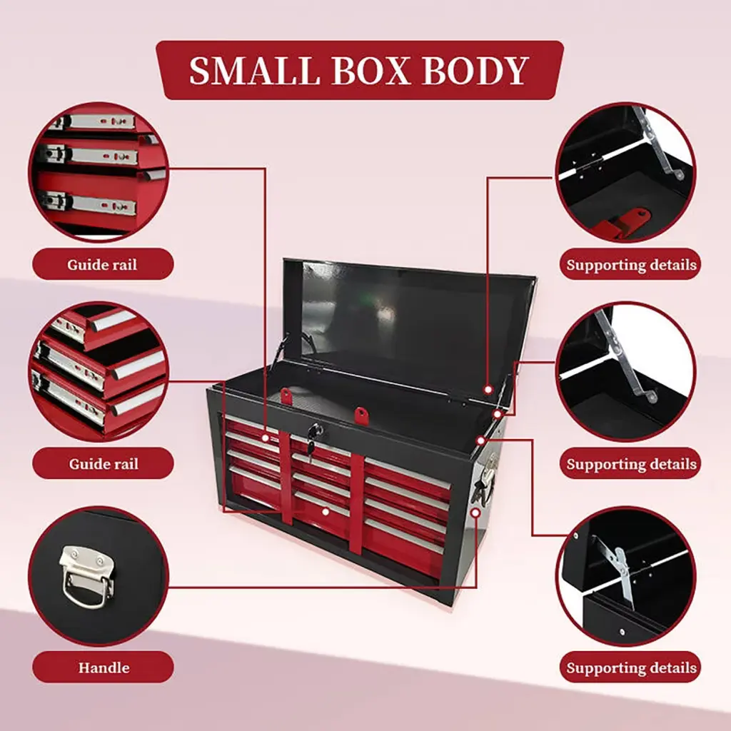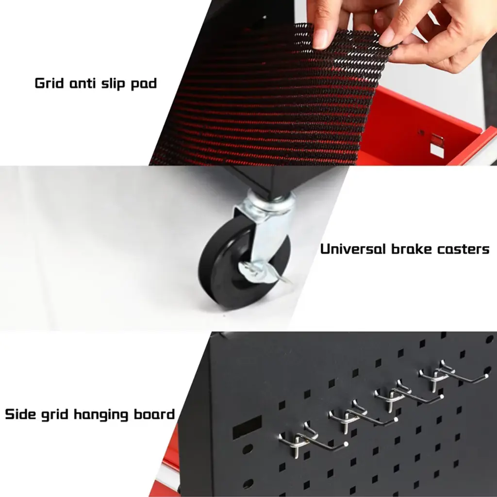 2-in-1 combination tool cabinet design, with the upper part being a tool cabinet and the lower part being a movable tool cart. It can be used alone or in combination, and when storing, the tool cabinet can be placed inside the tool cart to reduce space.The combination tool cart has a total of 8 drawers, 1 base cabinet, and hook holes on the side, which can be used and has a large storage space.The tool cabinet is equipped with a lock and two levers to prevent the drawer from sliding out when moving. The drawer is also equipped with anti slip pads to prevent internal tools from moving and scratching the product.The product is made of cold-rolled steel plate, which is sturdy and durable. It is packaged in a 1A drop box to prevent damage during transportation.