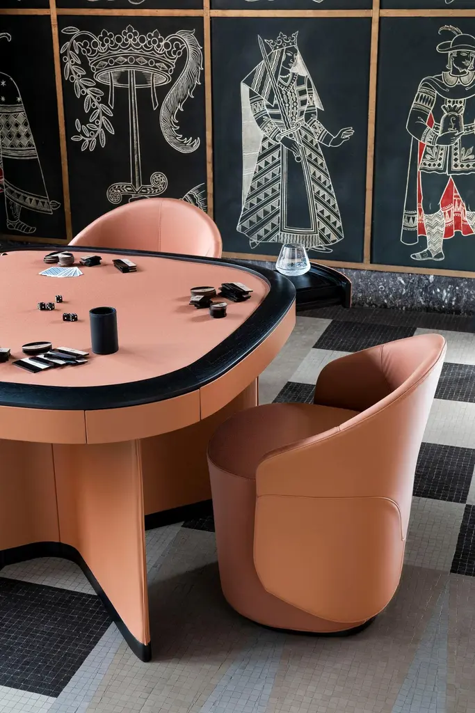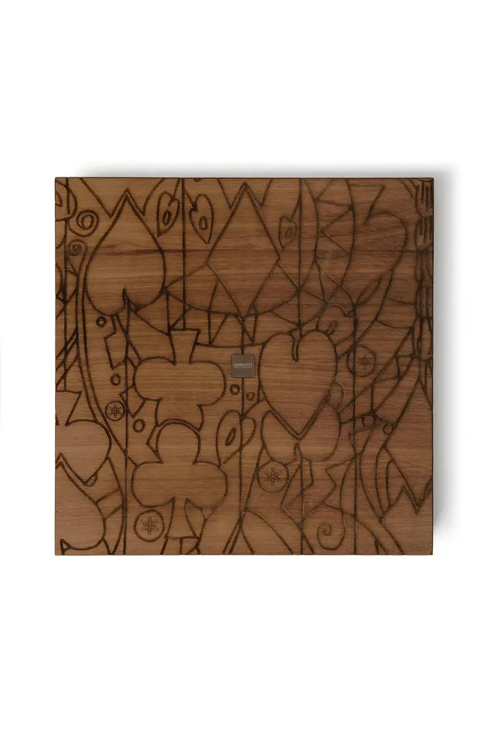 Poker box made of solid canaletto walnut and smoked methacrylate.The lid is engraved with texture based on a design by Roberto Cambi. The box consists of 292 chips, a leather cup, five dice, and a set of Centotto poker card decks (designed by Roberto Cambi).