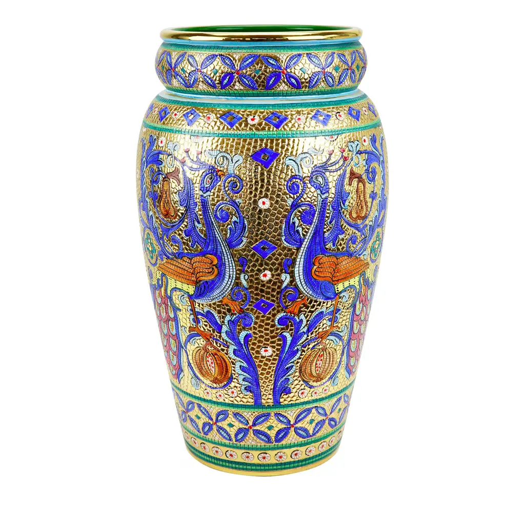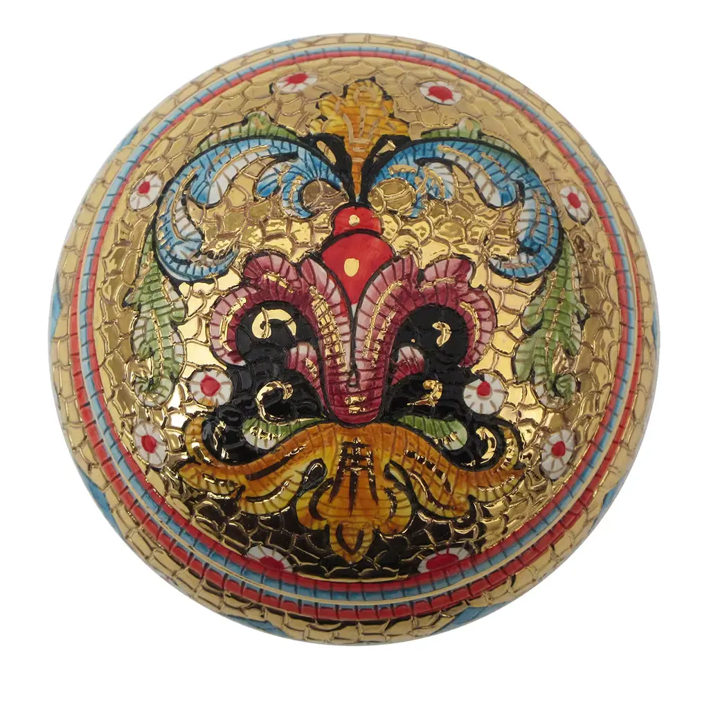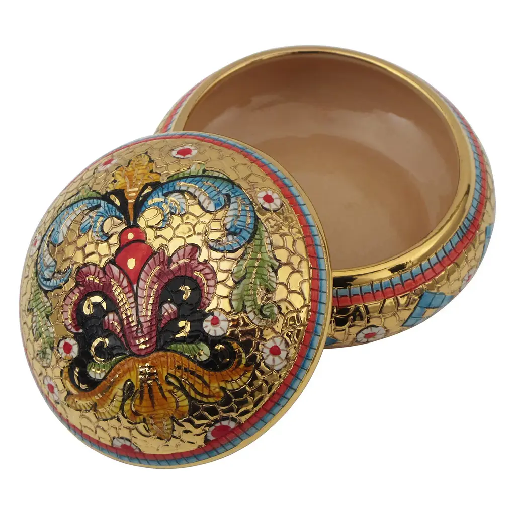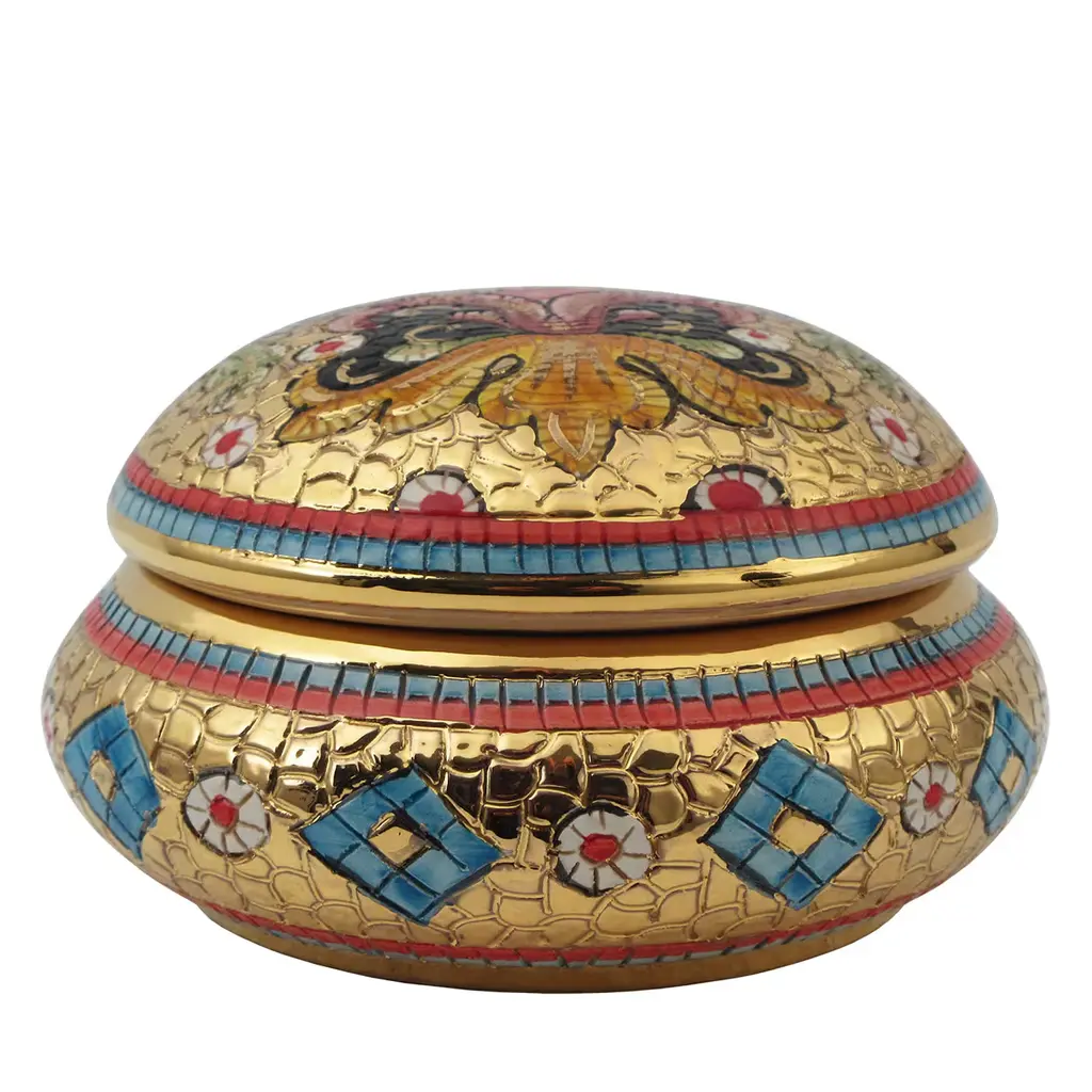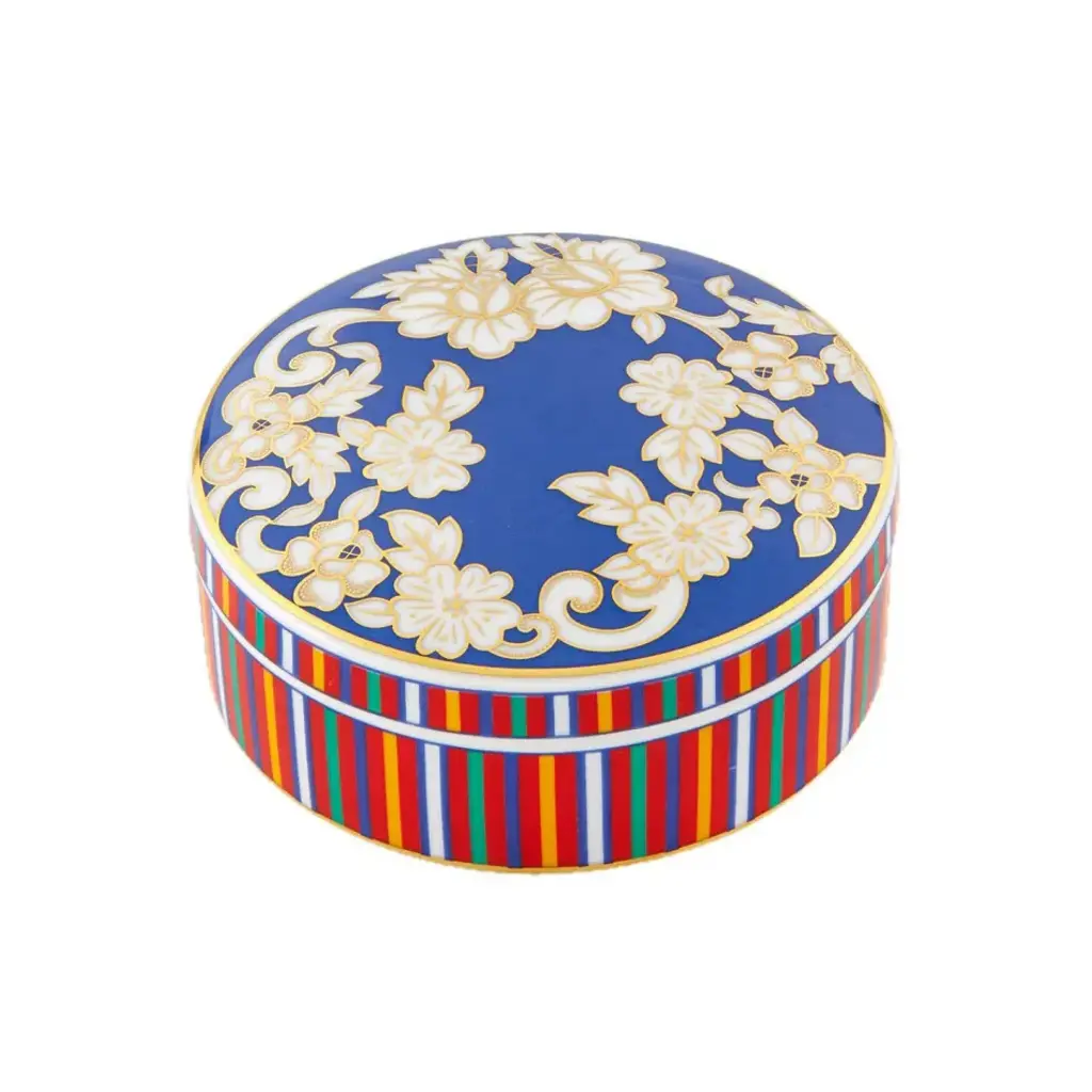 This splendid jewelry box with lid is crafted using traditional methods combined with a decorative technique developed by Sambuco resulting in a dynamic, mosaic-like decoration. By hand etching the piece and decorating it as if it were made of tiles, the craftsmen at Sambuco create stunning floral motifs that blur the lines with to abstract patterns. The details are hand painted in pure gold and subsequently set with a third firing in a kiln. This versatile work of art can be cherished in any room in the house or gifted for a special occasion.