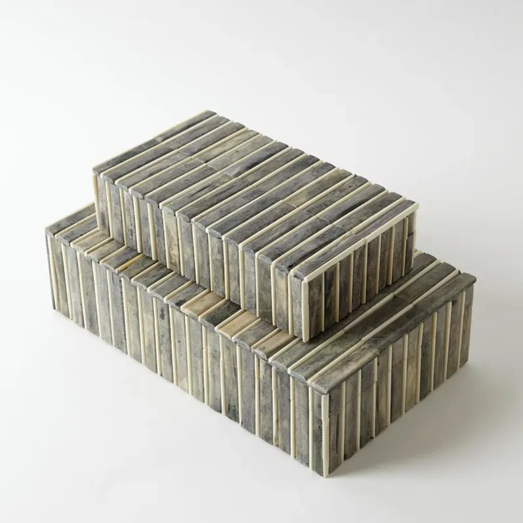 Boxes not sold as a set, each size is to be purchased separately. Honeycombs of the lustrous mother of pearl connect to create a sublimely detailed covering on Mother of Pearl Box. The icy and more neutral shades of the pearl contrast and give depth to these gorgeous pieces. Open to reveal a perfect storage spot for your favorite small trinkets. A lacquered finish protects the mother pearl.
