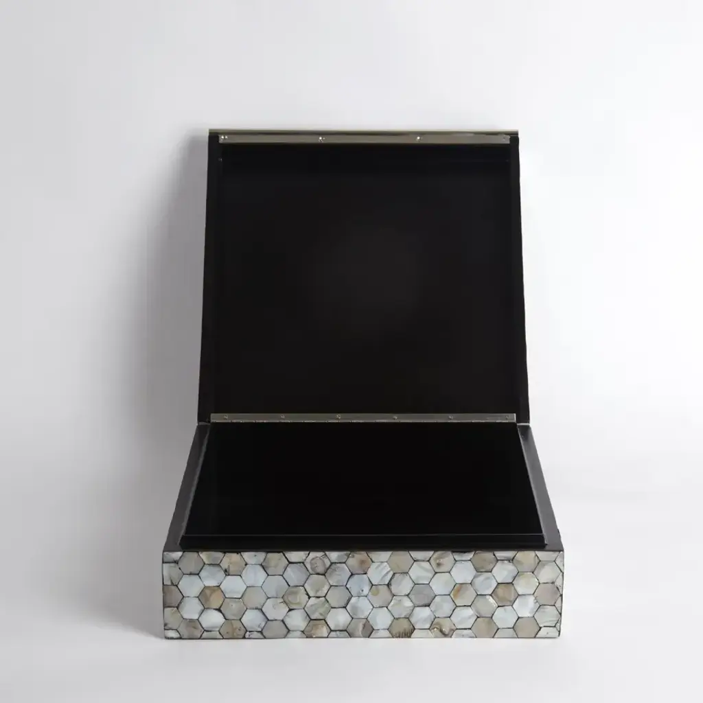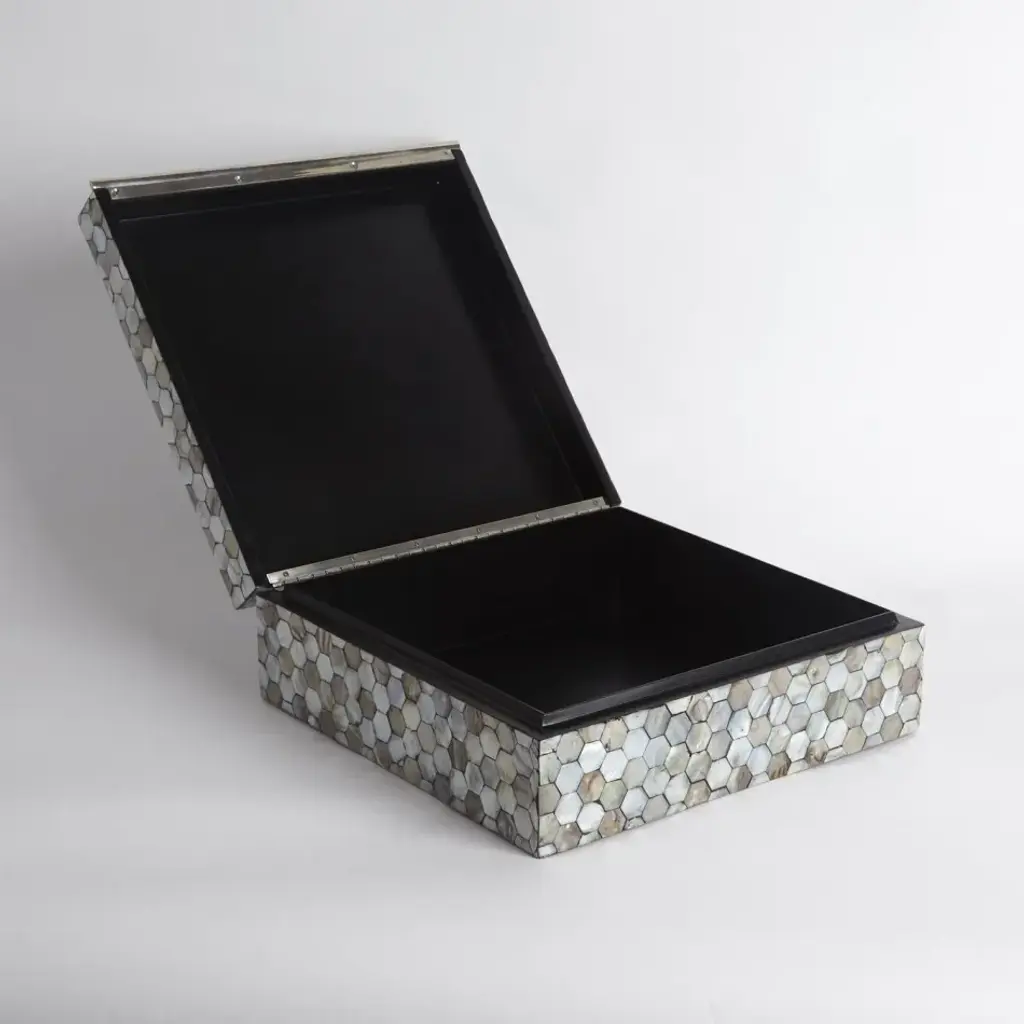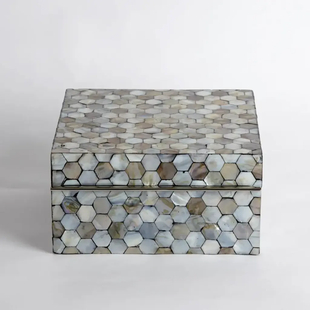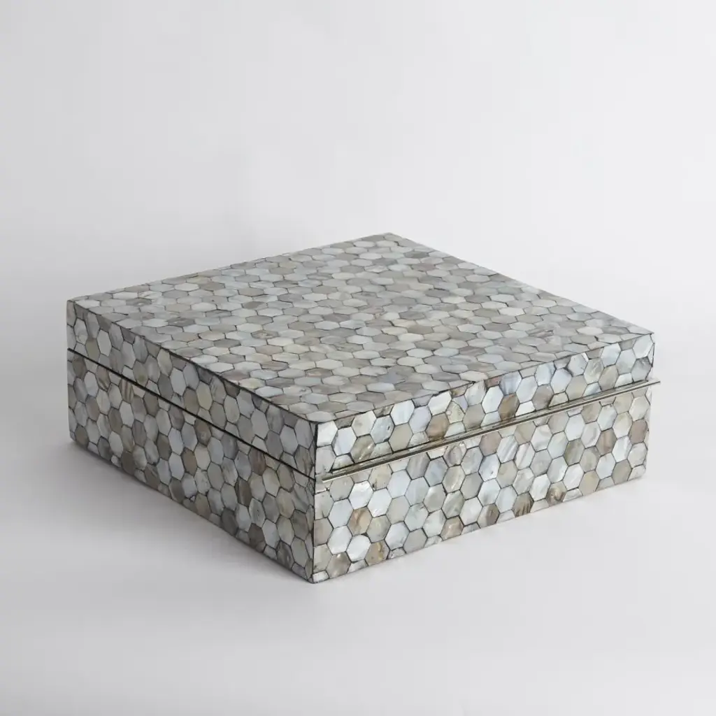Honeycombs of lustrous mother of pearl connect to create a sublimely detailed covering on our Mother of Pearl Box. The icy and more neutral shades of the pearl contrast and give depth to these gorgeous pieces. Open to reveal a perfect storage spot for your favorite small trinkets. A lacquered finish protects the mother pearl. Due to the natural material of mother of pearl, cracks and imperfections may be unavoidable. From a fashion forward perspective, Global Views offers accessories, furniture, statement lighting, and an assortment of rugs and mirrors to add beauty and joy to your home.