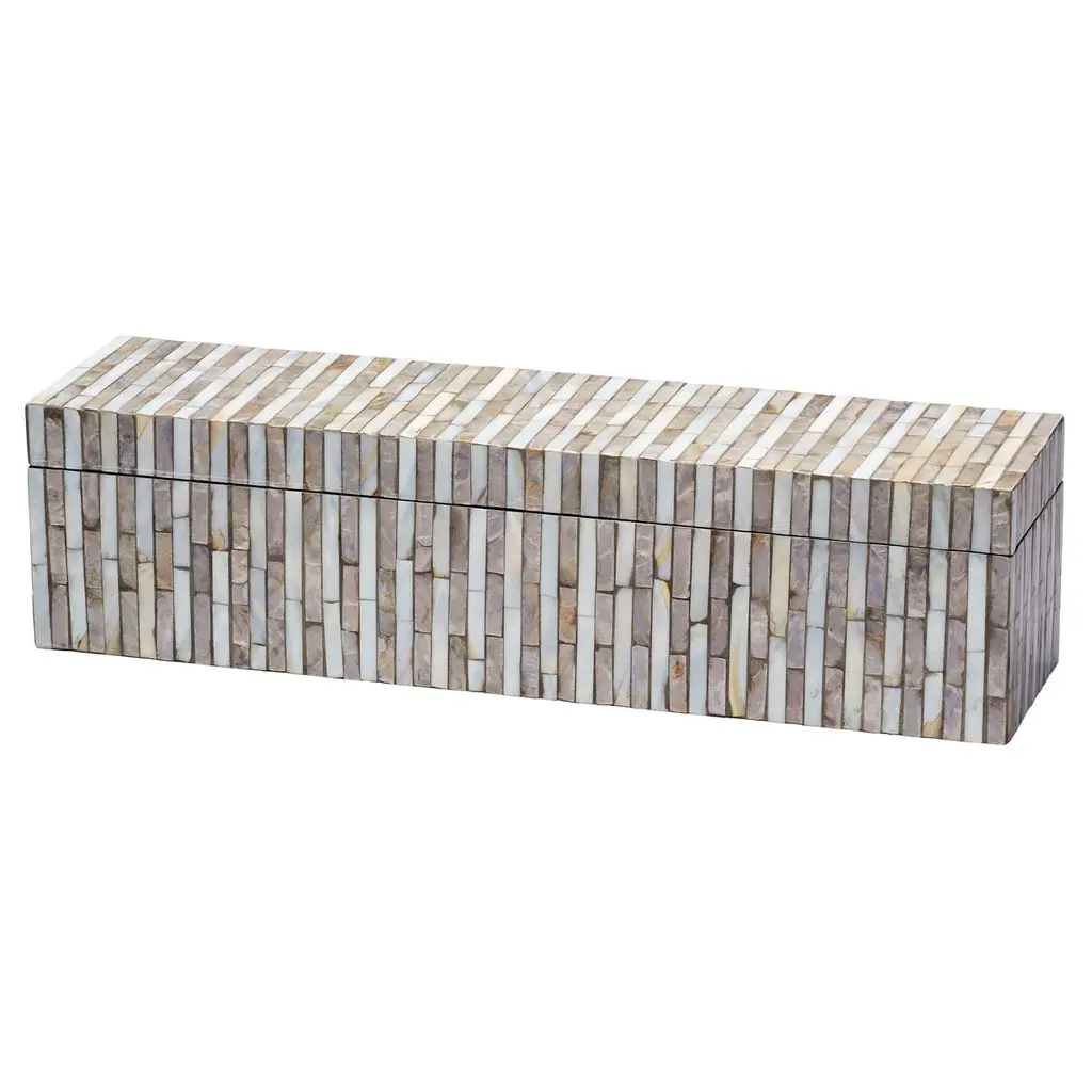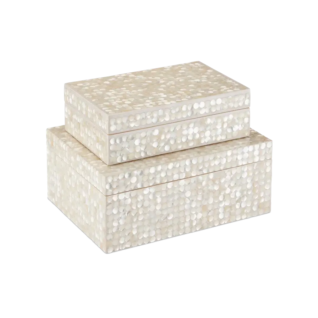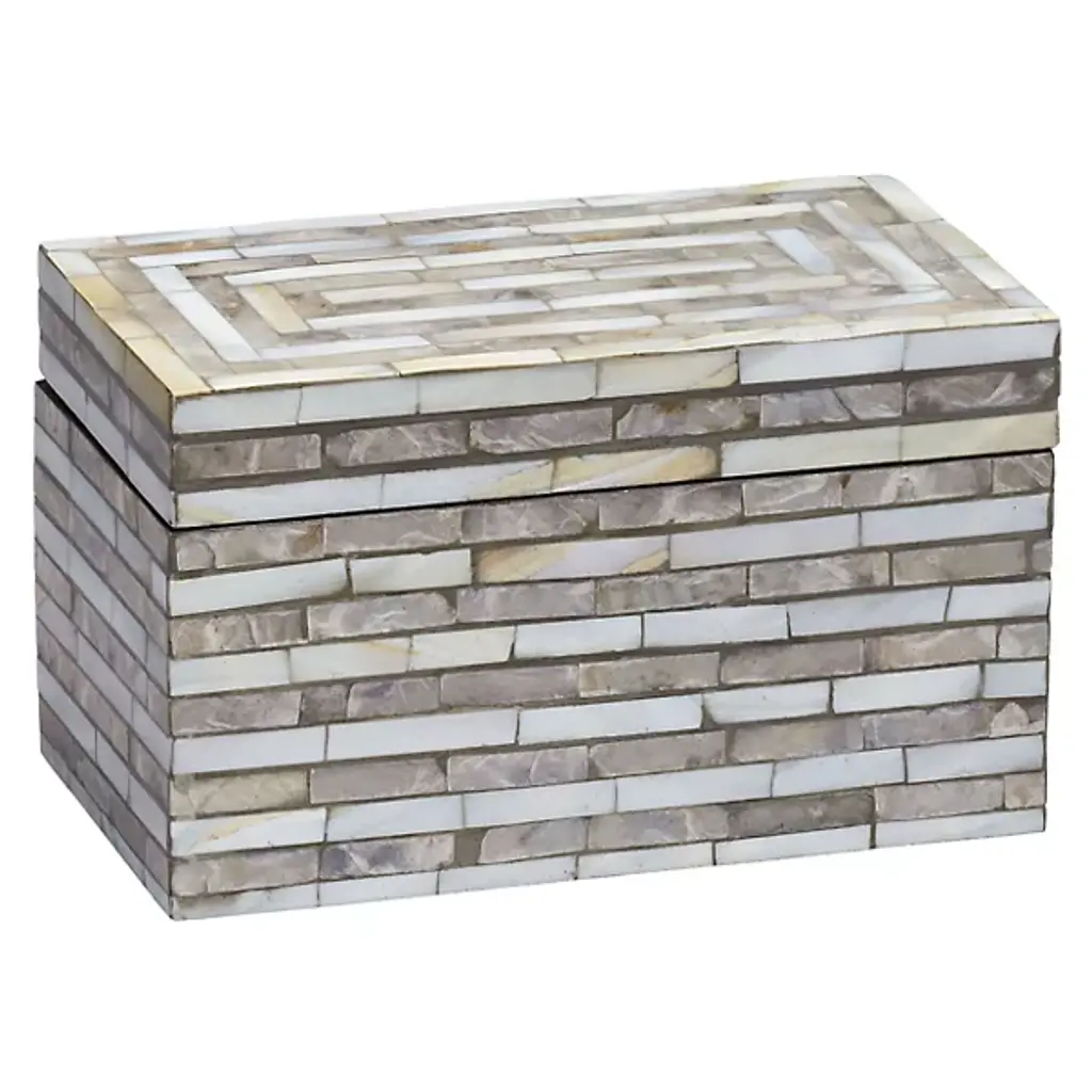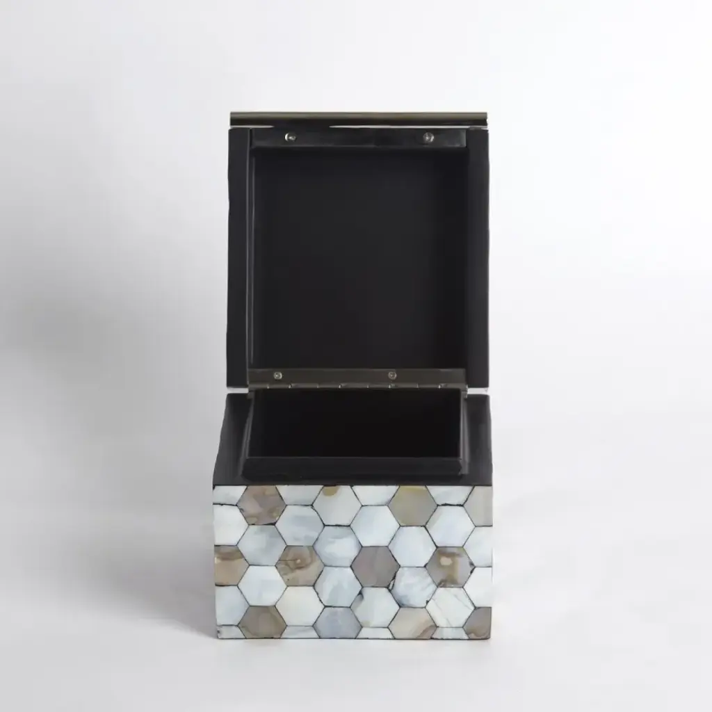 Honeycombs of lustrous mother of pearl connect to create a sublimely detailed covering on our Mother of Pearl Box. The icy and more neutral shades of the pearl contrast and give depth to these gorgeous pieces. Open to reveal a perfect storage spot for your favorite small trinkets. A lacquered finish protects the mother pearl. Due to the natural material of mother of pearl, cracks and imperfections may be unavoidable. From a fashion forward perspective, Global Views offers accessories, furniture, statement lighting, and an assortment of rugs and mirrors to add beauty and joy to your home.