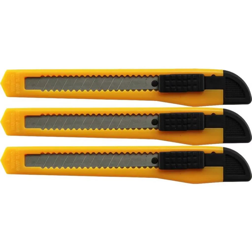 FEATURES: THREE (3): Small Black Utility Knife Box Cutters. 5.25 inch Long. .50 inch Usable Blade. Retractable Blade. One Hand Thump Slide and Lock. .50 inch Wide Snap Off Blade. 12 Snap off Segments for New Tip. Black Knife End used to Snap Blade. Blade is Replaceable. NOTE: Each order is for THREE (3) knives: