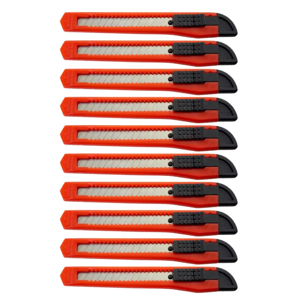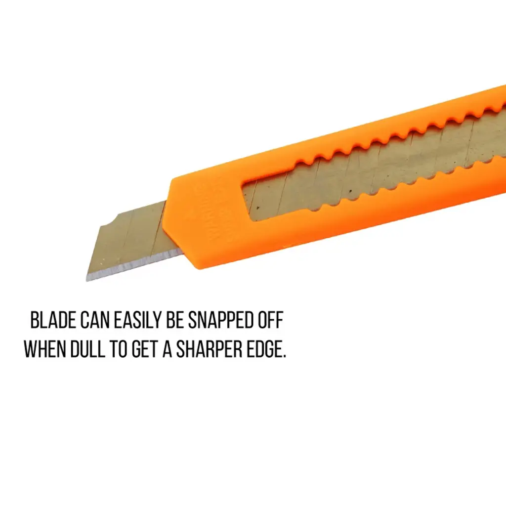 FEATURES: FIVE HUNDRED (500): Small Neon Orange Utility Knife Box Cutters. 5.25 inch Long. .50 inch Usable Blade. Retractable Blade. One Hand Thump Slide and Lock. .50 inch Wide Snap Off Blade. 12 Snap off Segments for New Tip. Black Knife End used to Snap Blade. Blade is Replaceable. NOTE: Each order is for FIVE HUNDRED (500) knives: